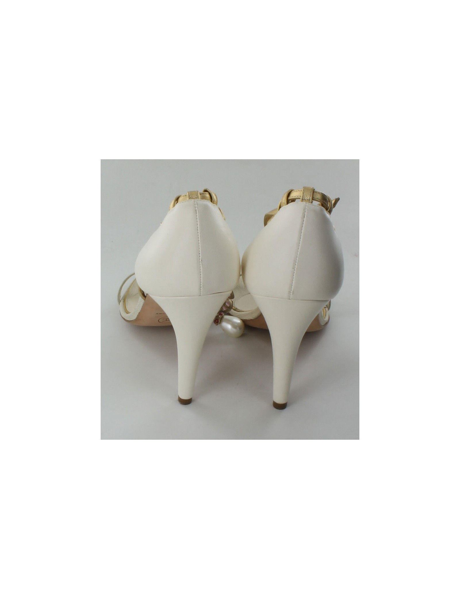 Sandales bijou CHANEL en veau lisse couleur coquille d'oeuf se terminant par un lisseret or . Taille 39, elle n'ont jamais été portées. a la pointe de la chaussure : une bande de serpent de même couleur. la semelle est en cuir.