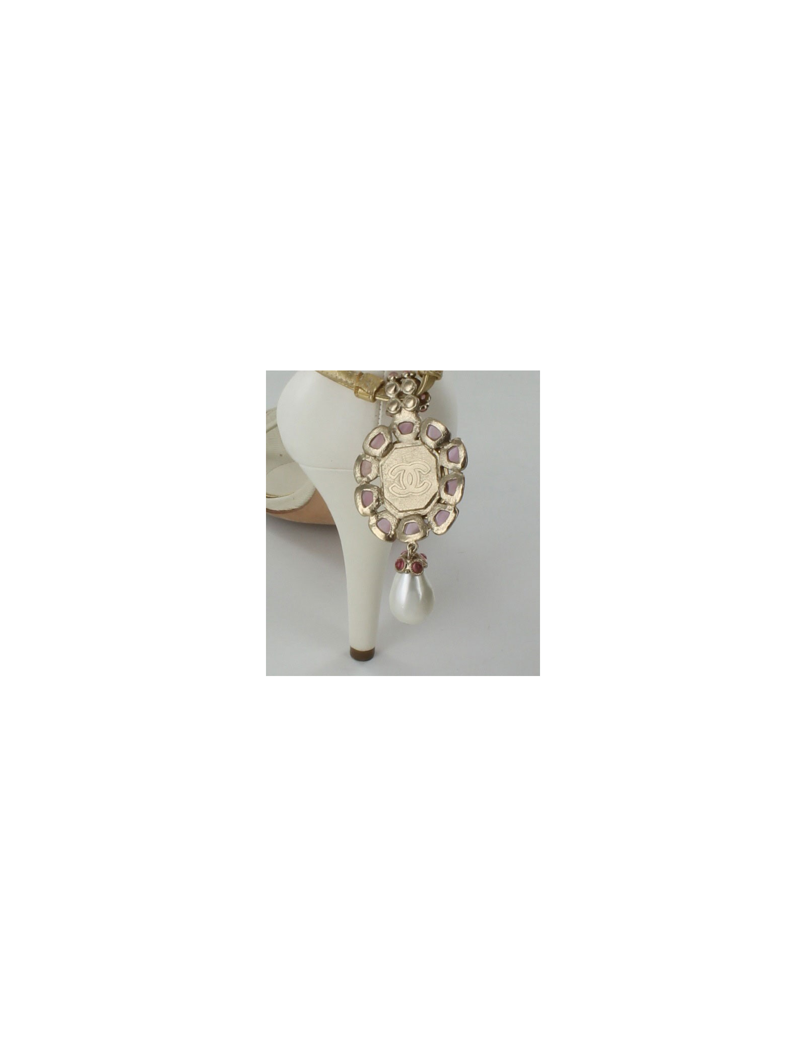 Ces magnifiques chaussures sont agrémentées d'un bijou CHANEL amethyste et topaze et se termine par une perle en pâte de verre nacrée en forme de goutte - la longueur du lacet 33 cm - la longueur du bijou : 9 cm et sa largeur 4 cm
