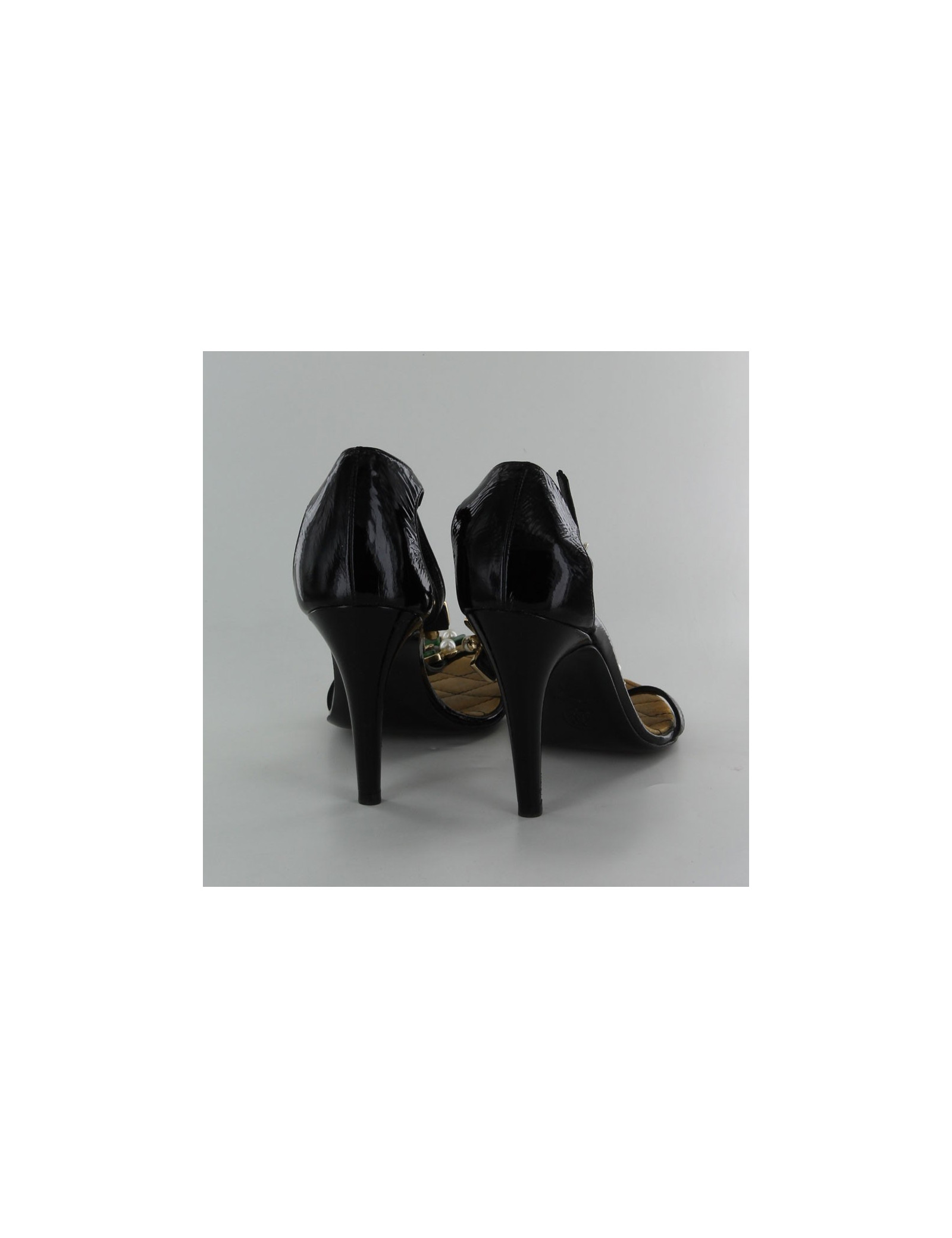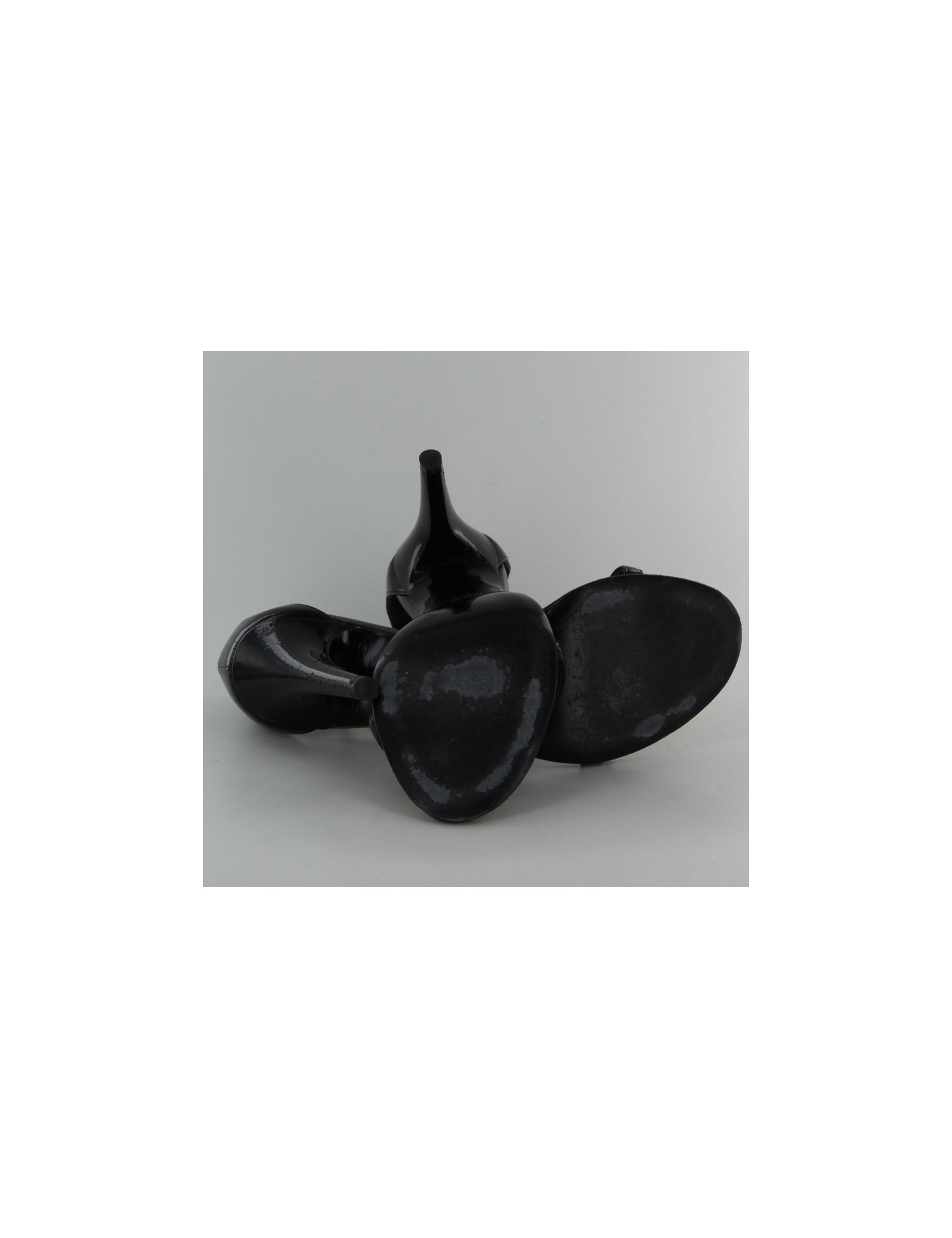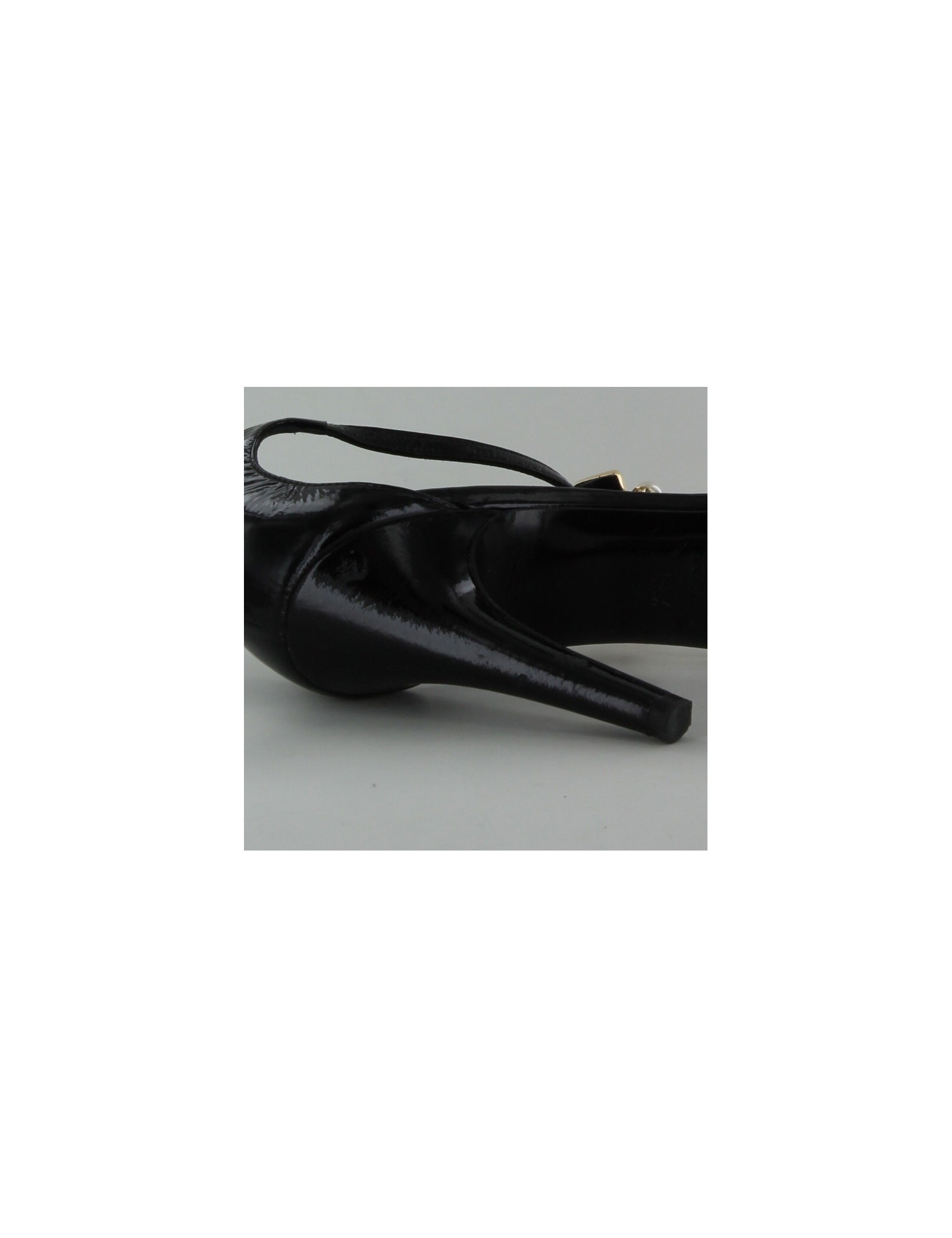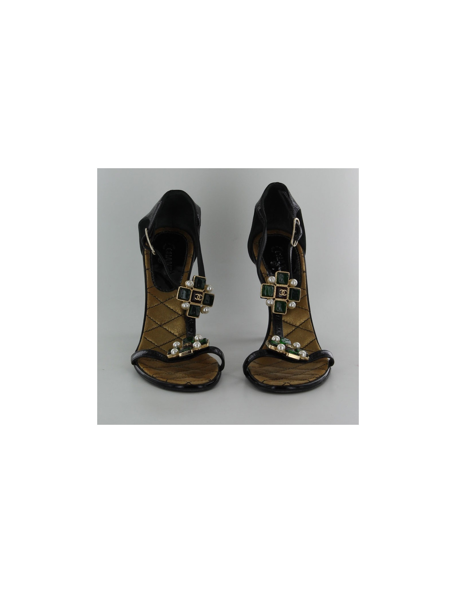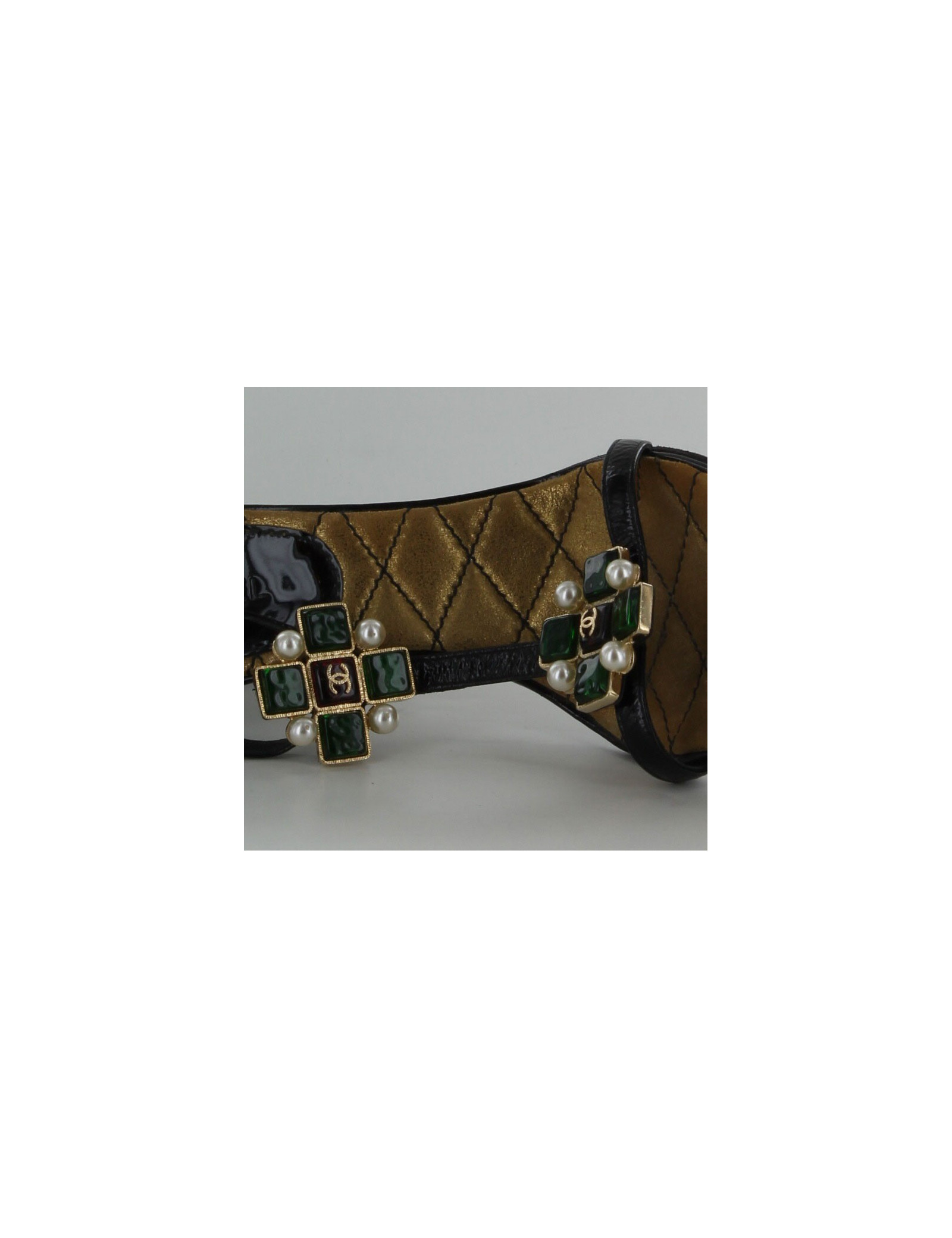 Superbes escarpins couture Chanel, taille 38.5, surmontés de 2 bijoux croix émeraude et rubis en pâte de verre et perles nacrées. ils sont en cuir verni noir . Ayant été portés, il y a quelques traces d'usure sur les talons, mais dans l'ensemble elles sont en très bon état.