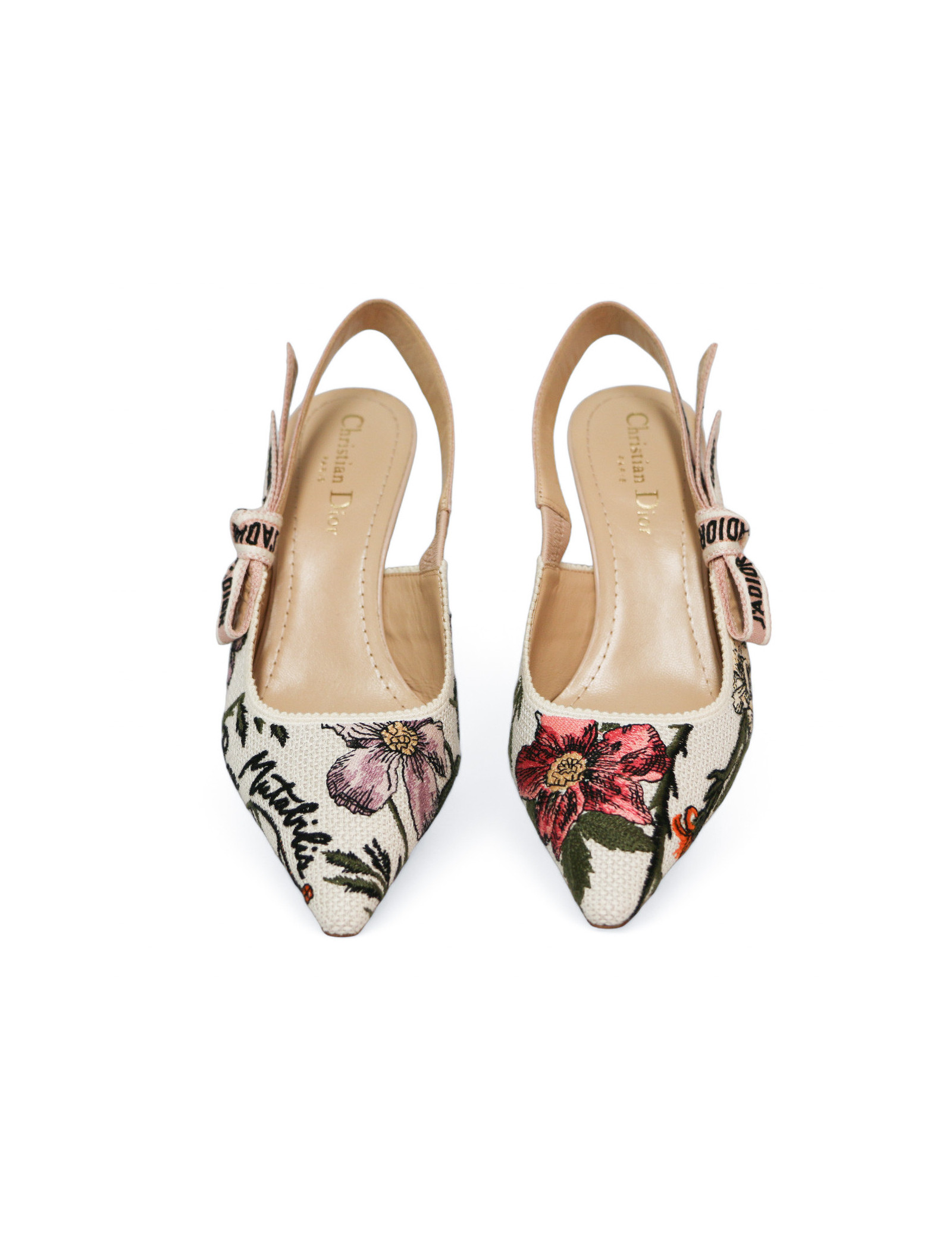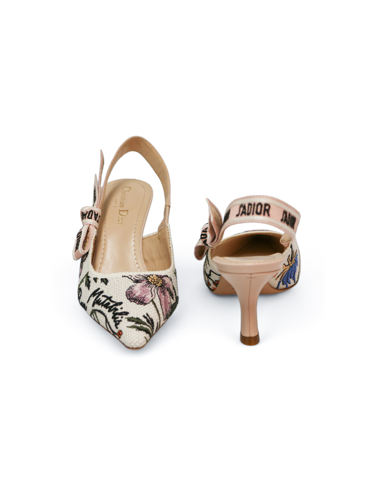 Détails : imprimé fleuri, inscription "Rose Mutabilis" sur l'avant de la chaussure et "J'adior" sur la sangle élastique