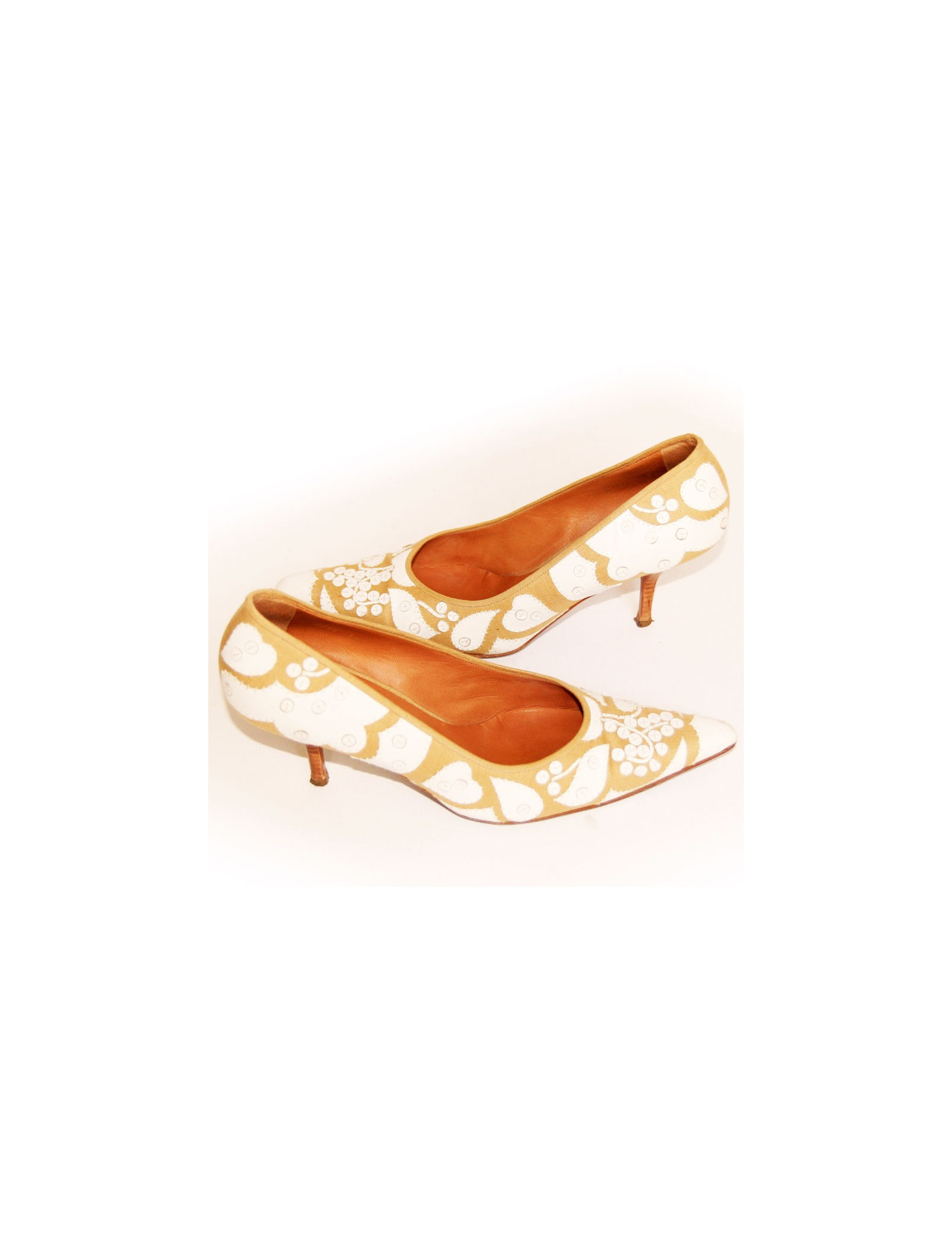 Escarpins en raphia marron et empiècements de cuir blanc Walter Steiger Taille 38,5