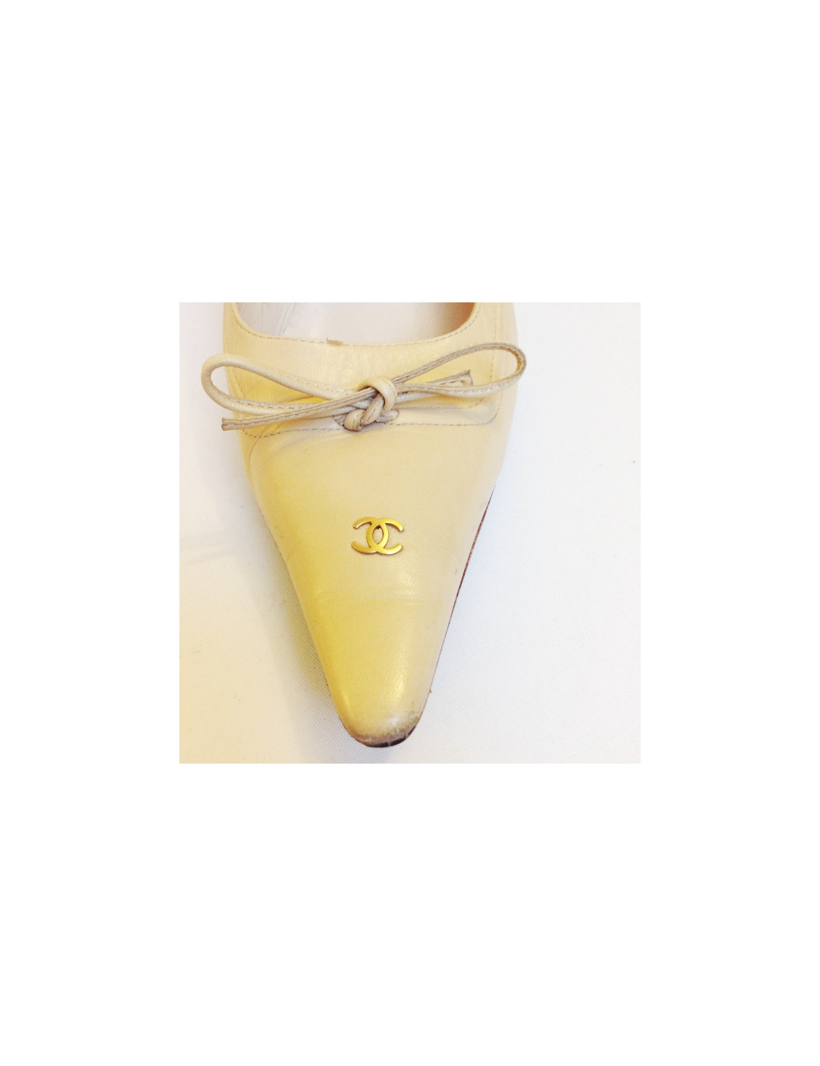 Escarpins Chanel, beige en cuir T 37 en très bon état. Un nœud Papillon et un double C sont visibles sur le devant de chaque chaussure. Les chaussures ont été ressemelées