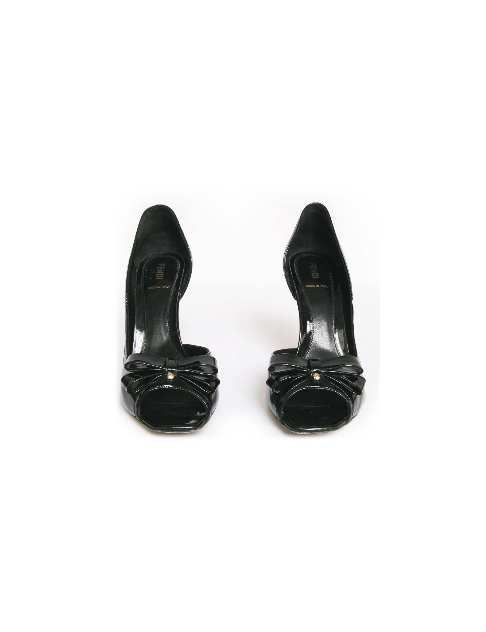 Paire de sandales hautes Fendi T 39 en cuir verni noir. Taille 39. Le talon détient une tige en métal doré à l'intérieur. Elles sont ouvertes sur le devant. En très bon état.