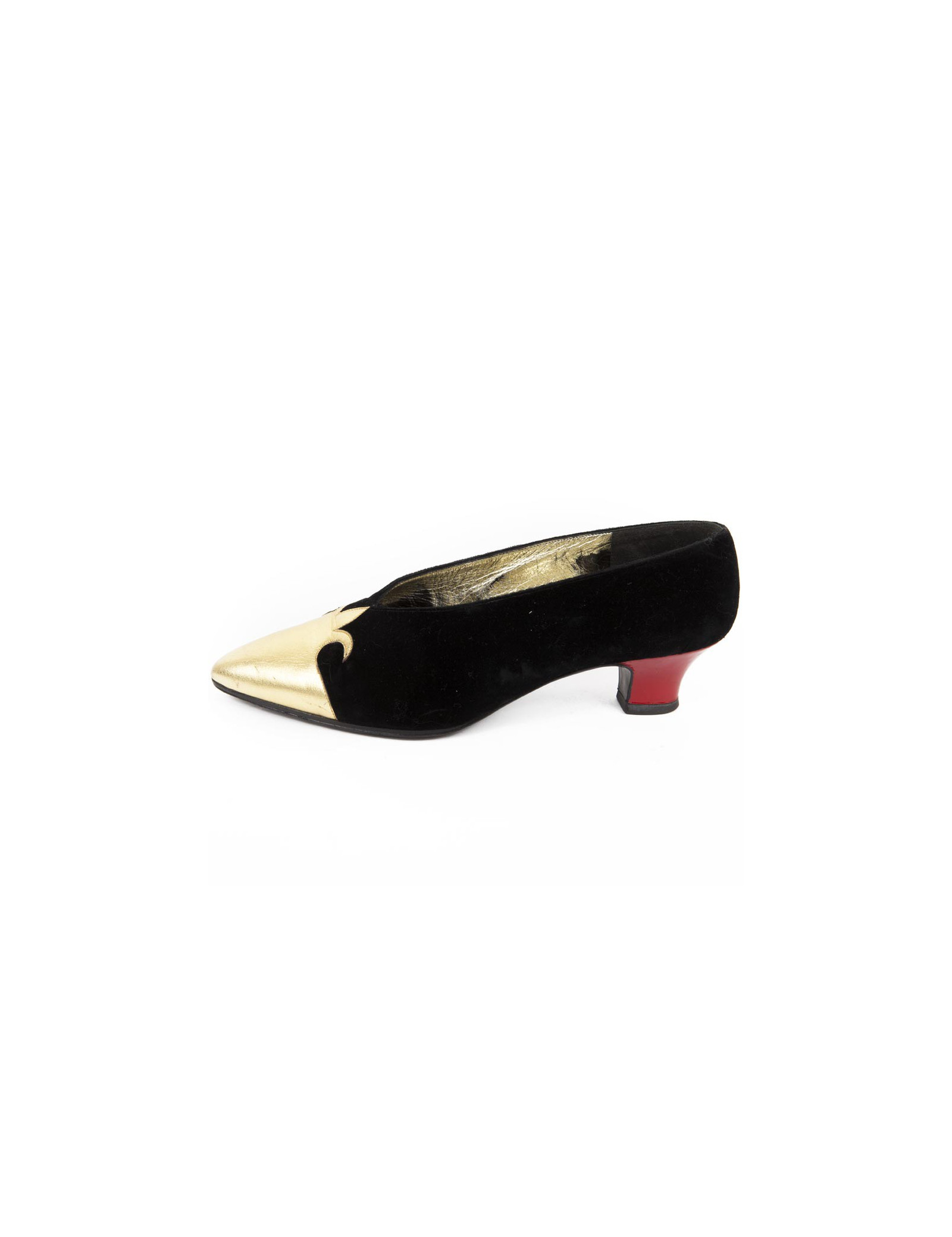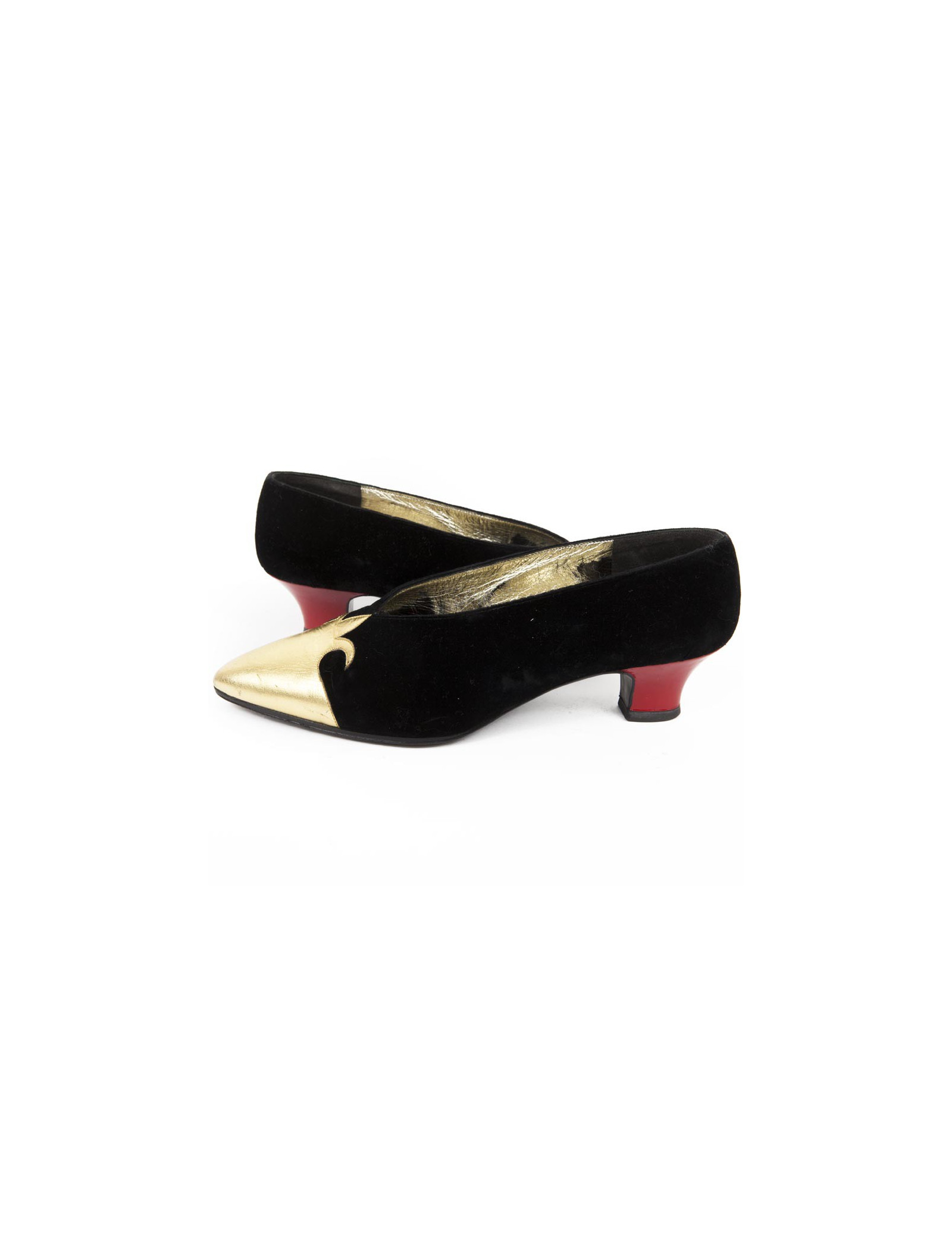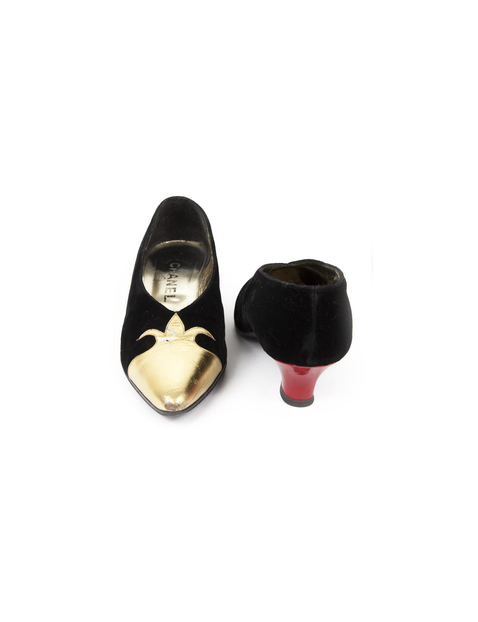 Collector ! Escarpins Couture Chanel en velours de soie noir T 36 FR, la pointe de la chaussure est en cuir doré (quelques traces), et le talon est verni rouge vif (traces noires).