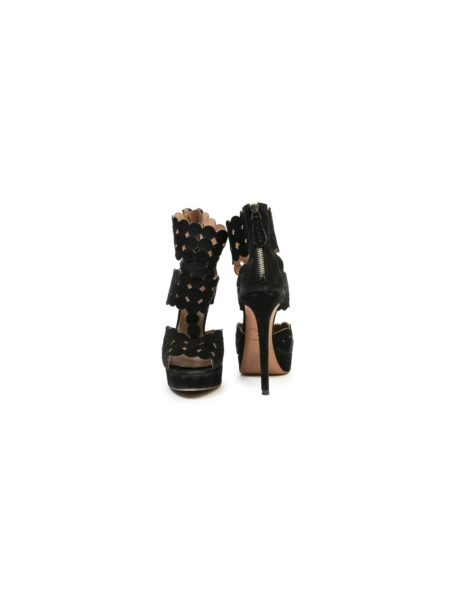 Sandales à talons Azzedine ALAIA en daim noir ajouré, taille 37. Fermeture éclair en métal argenté foncé sur l'arrière de la cheville. Semelles intériures et extérieures en cuir