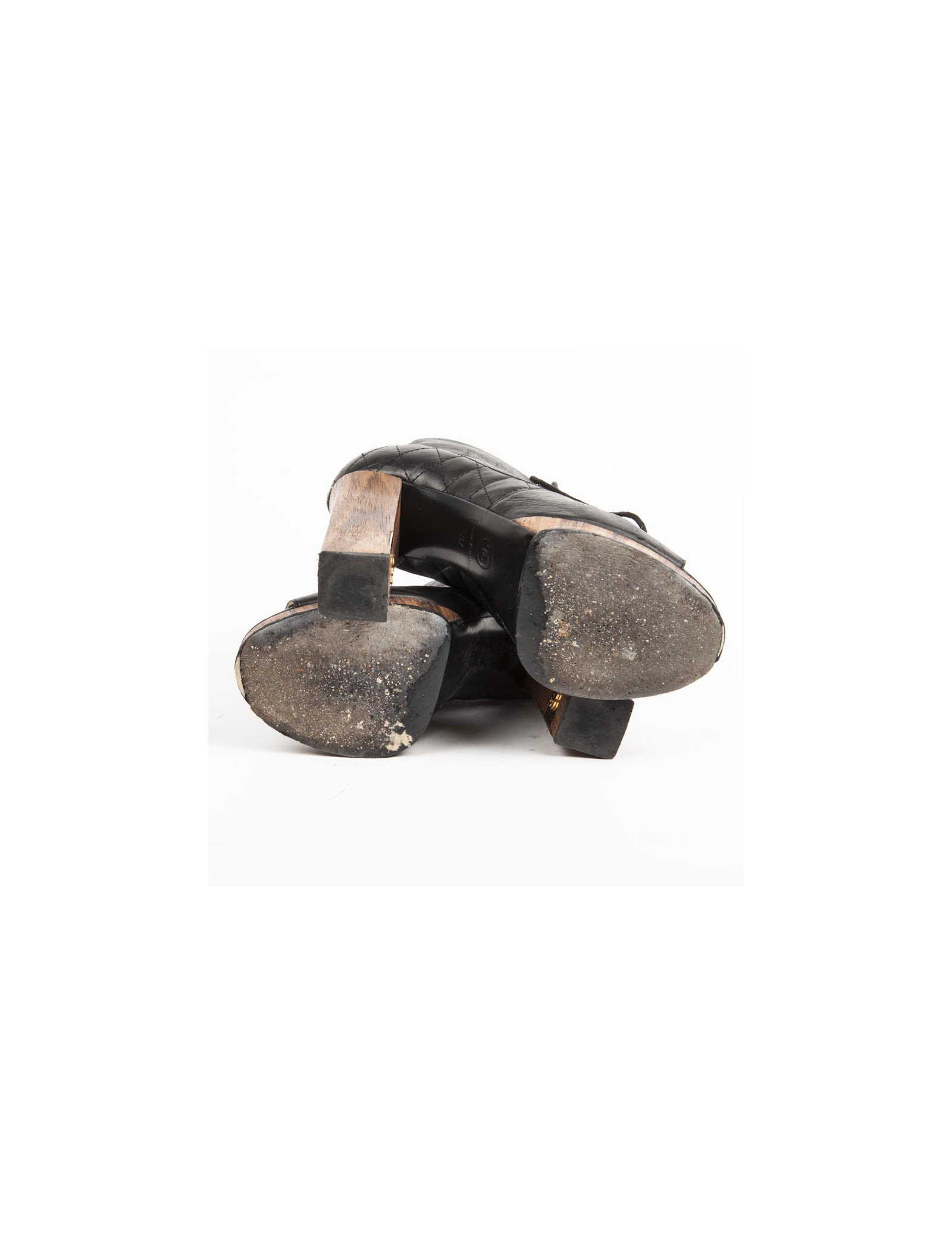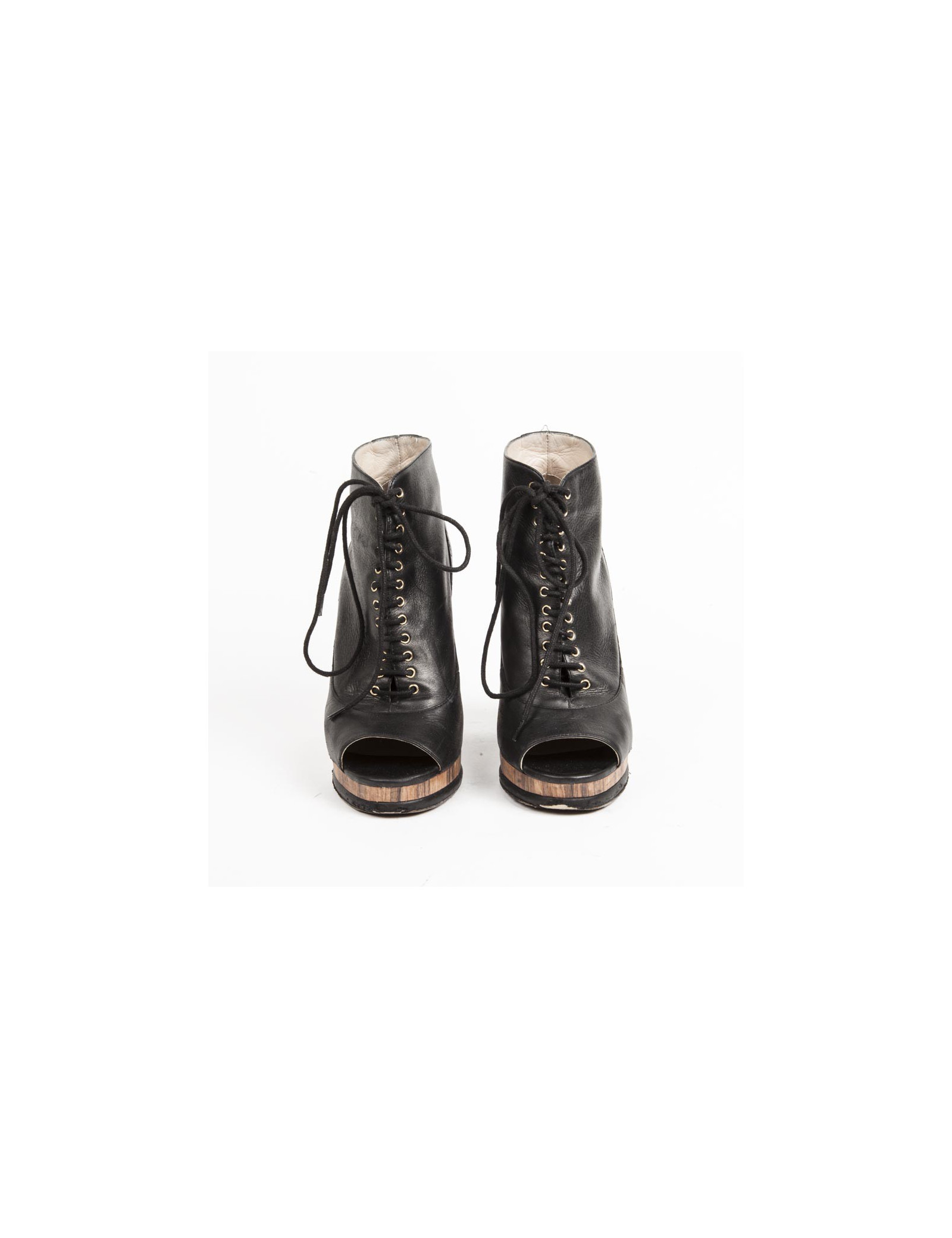 Ces Low boots CHANEL sont en cuir noir irisé. Elles sont à lacets, ouvertes sur le devant, matelassées sur le côté et au dos de la chaussure. Elles ont un plateau de 2 cm et un talon façon bois. Une plaque métallique dorée siglé " CC " se trouve à l'intérieur du talon. Ces chaussures sont en très bon état. Sur la chaussure droite on remarque une légère tâche sur le cuir.