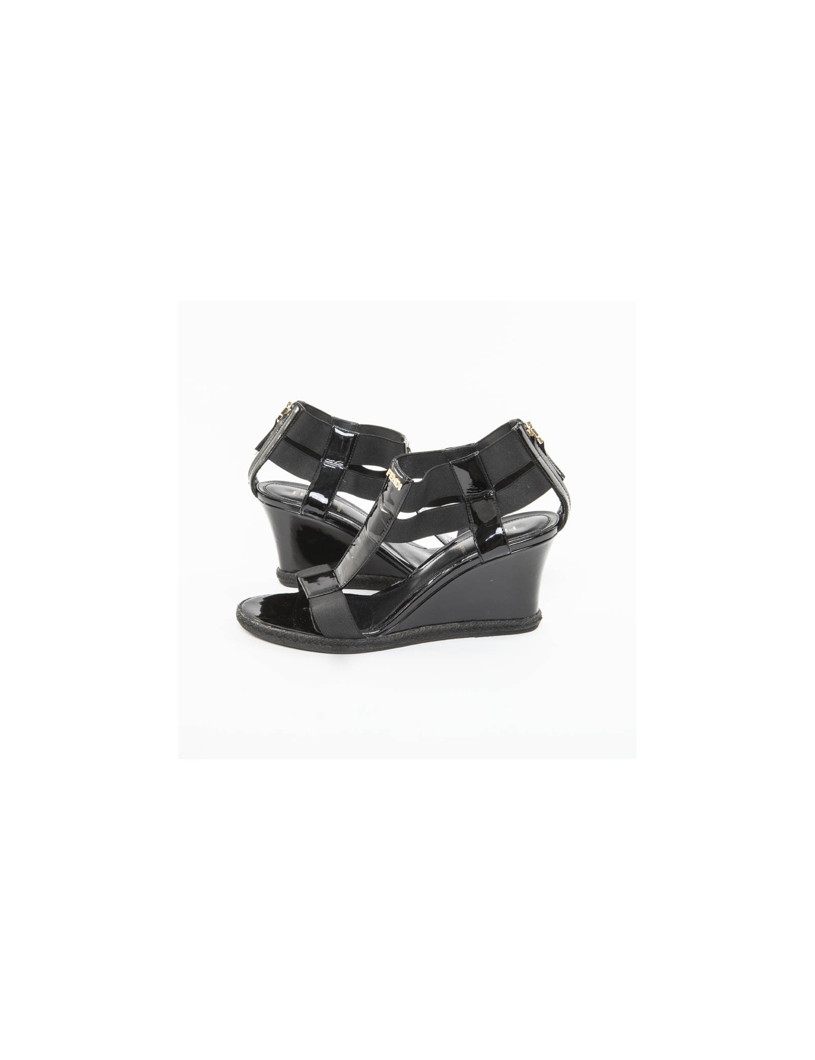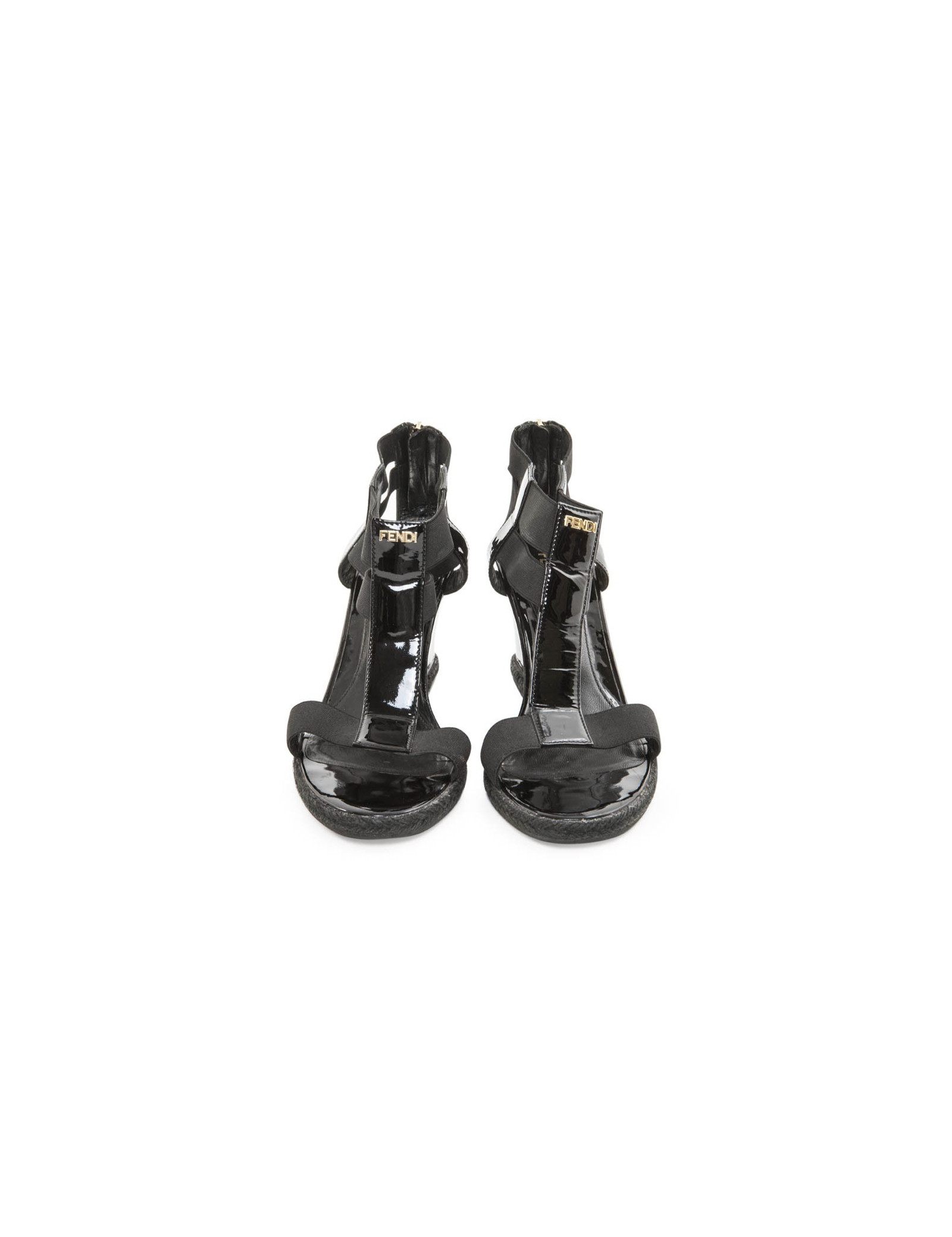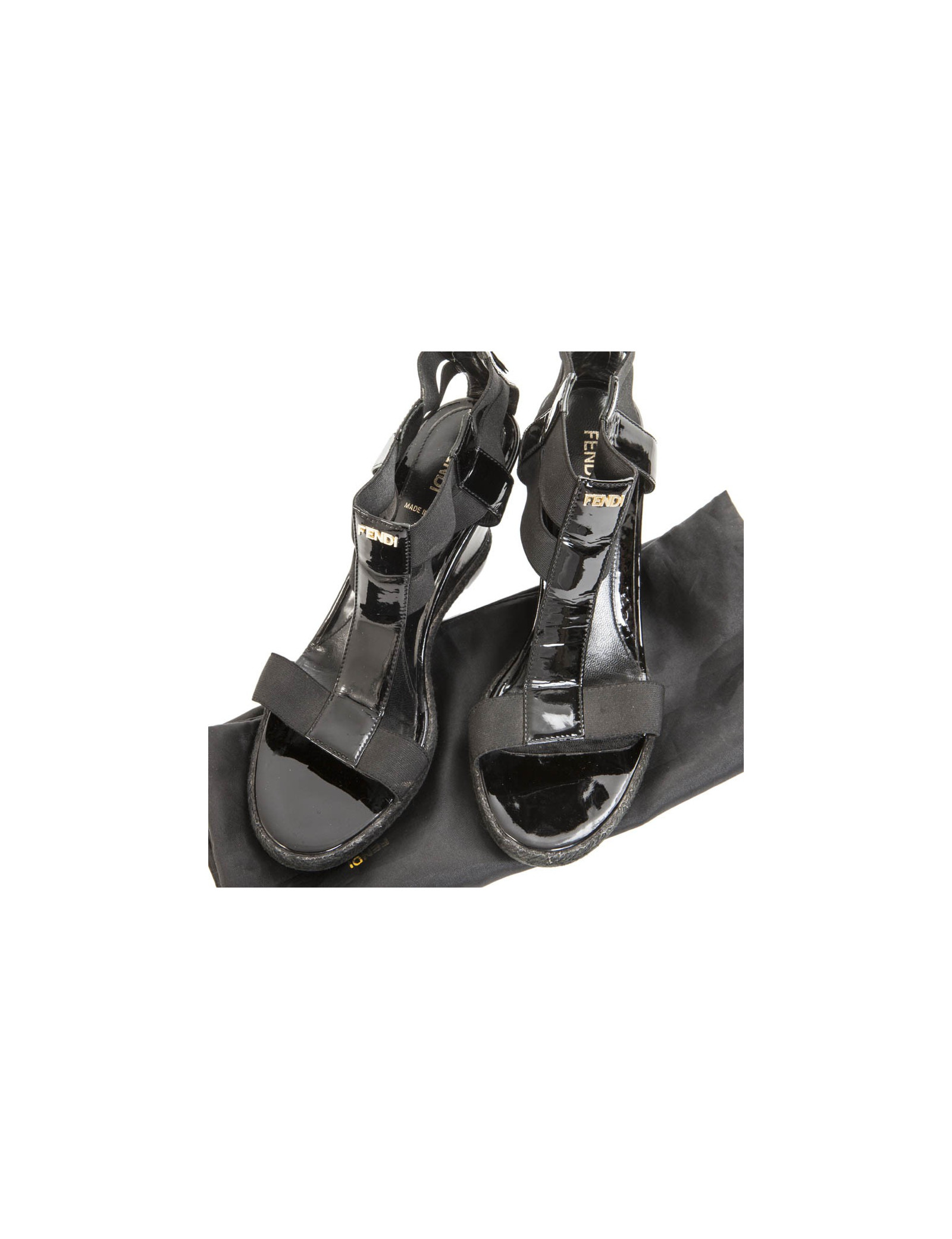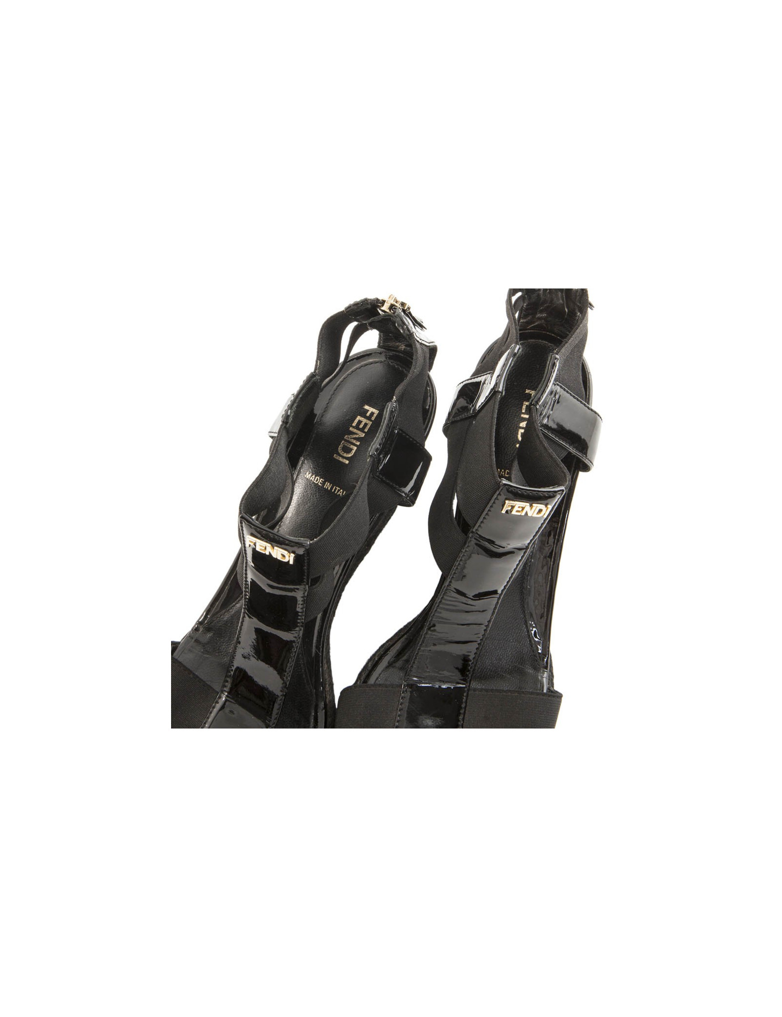 Sandales ouvertes de la Maison Fendi en cuir verni noir. Taille 39 fr . Au niveau des chevilles les attaches sont élastiques. L'inscription 'FENDI' est en métal doré. Fermeture zippée à l'extérieur. En très bon état.