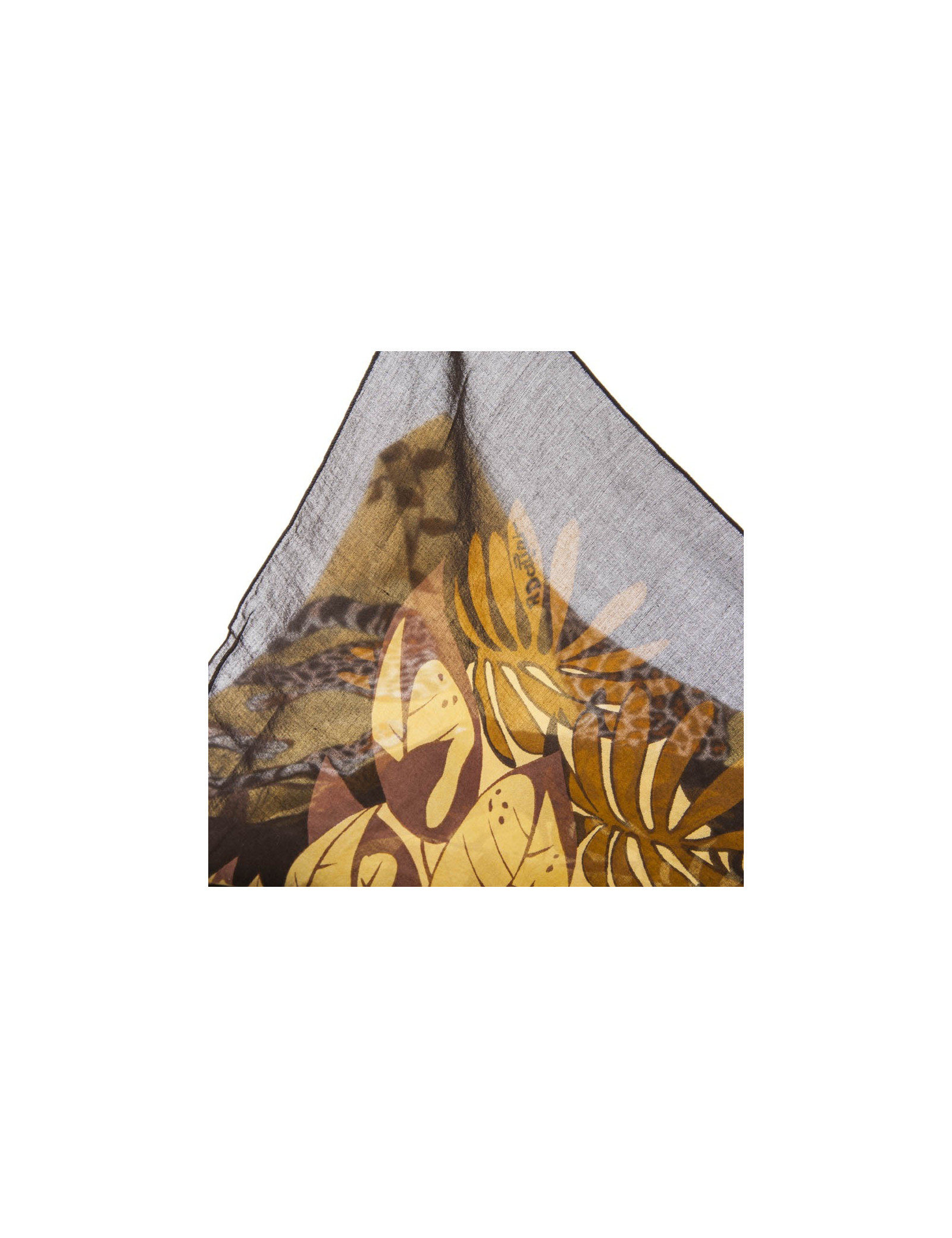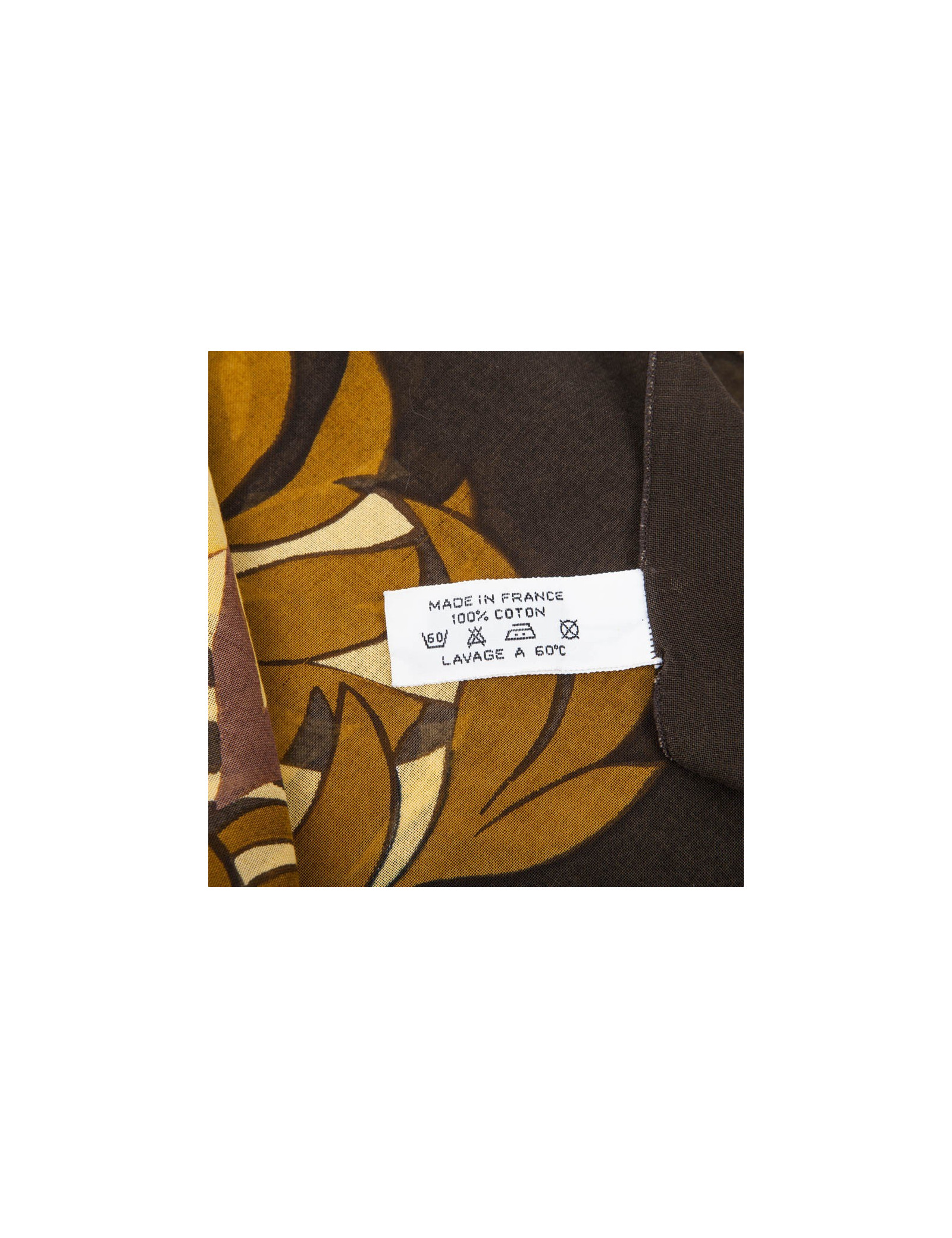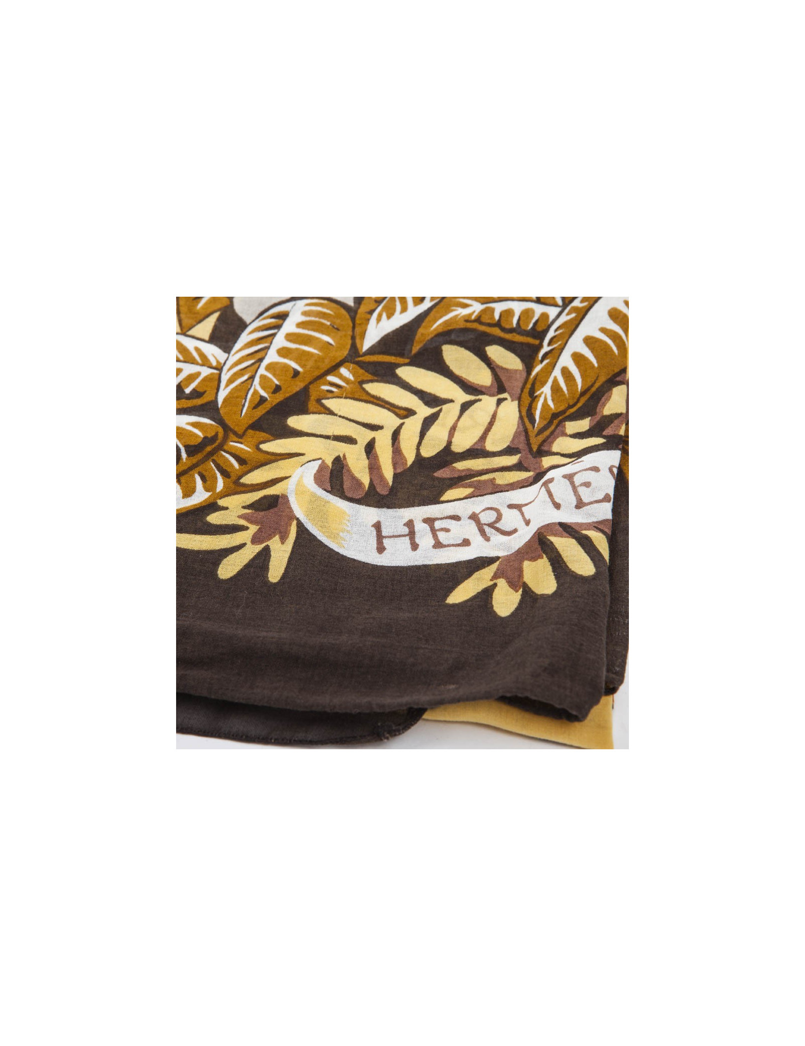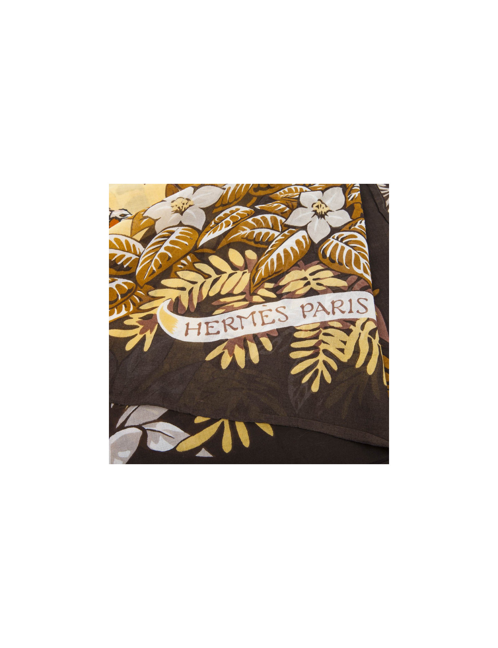Vintage ! Paréo Hermès en coton imprimé inspiration de la savane. Dans les tons bruns, jaunes et orangés, il a des dessins de léopards et des motifs floraux.