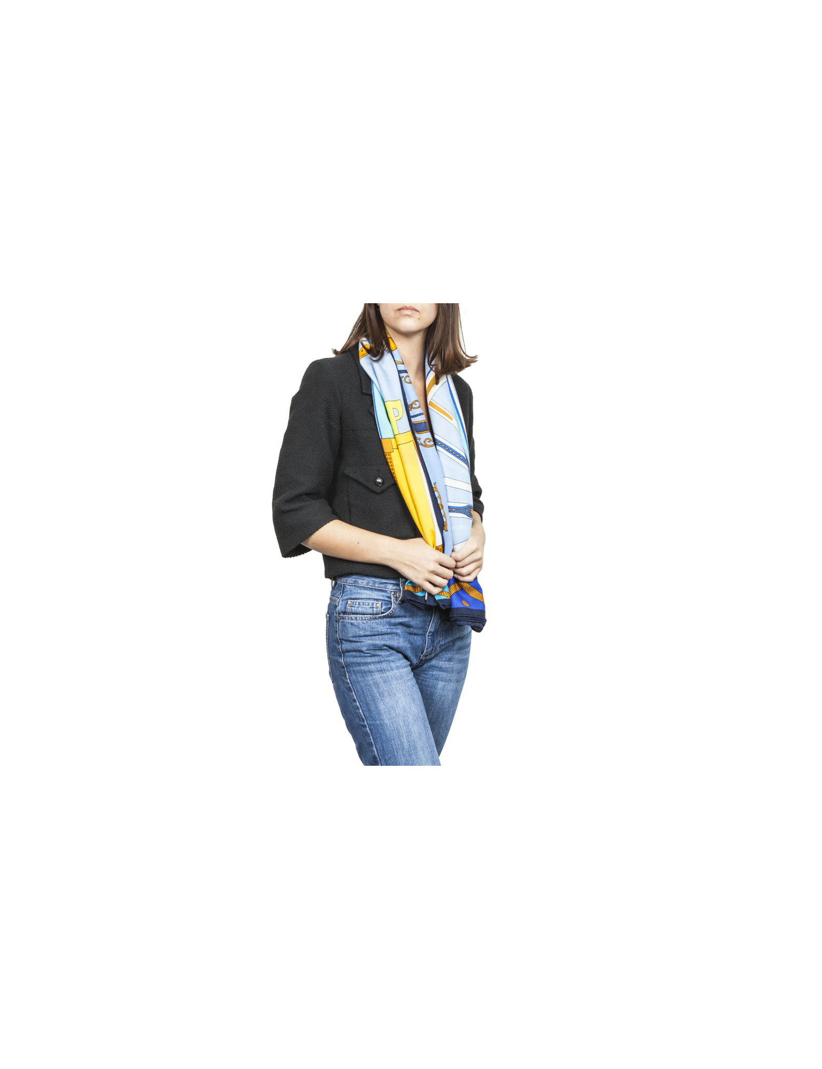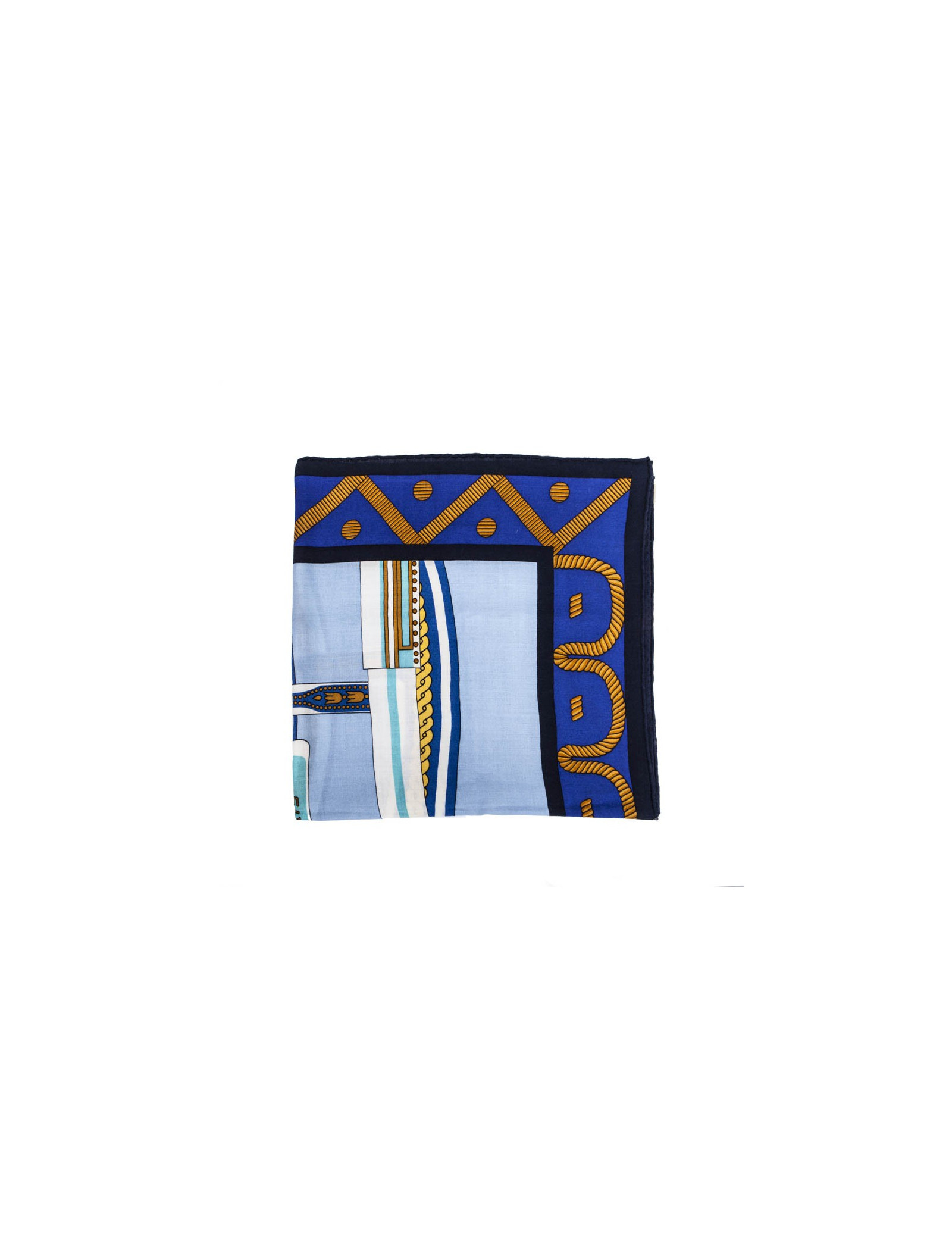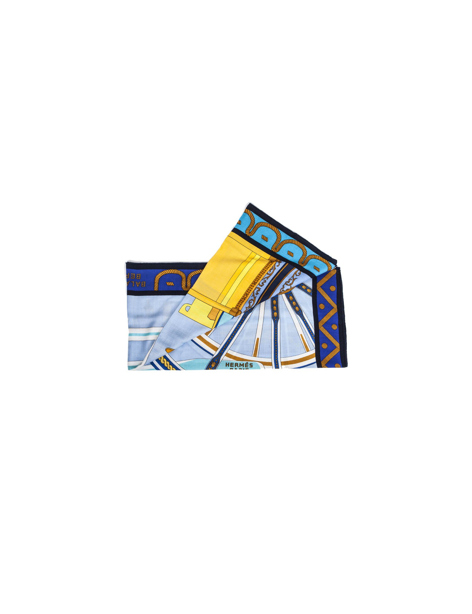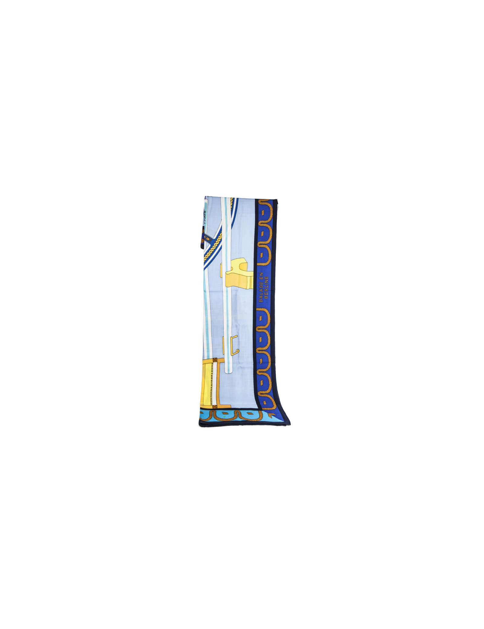 Châle HERMES bleu et jaune "balade en berline"