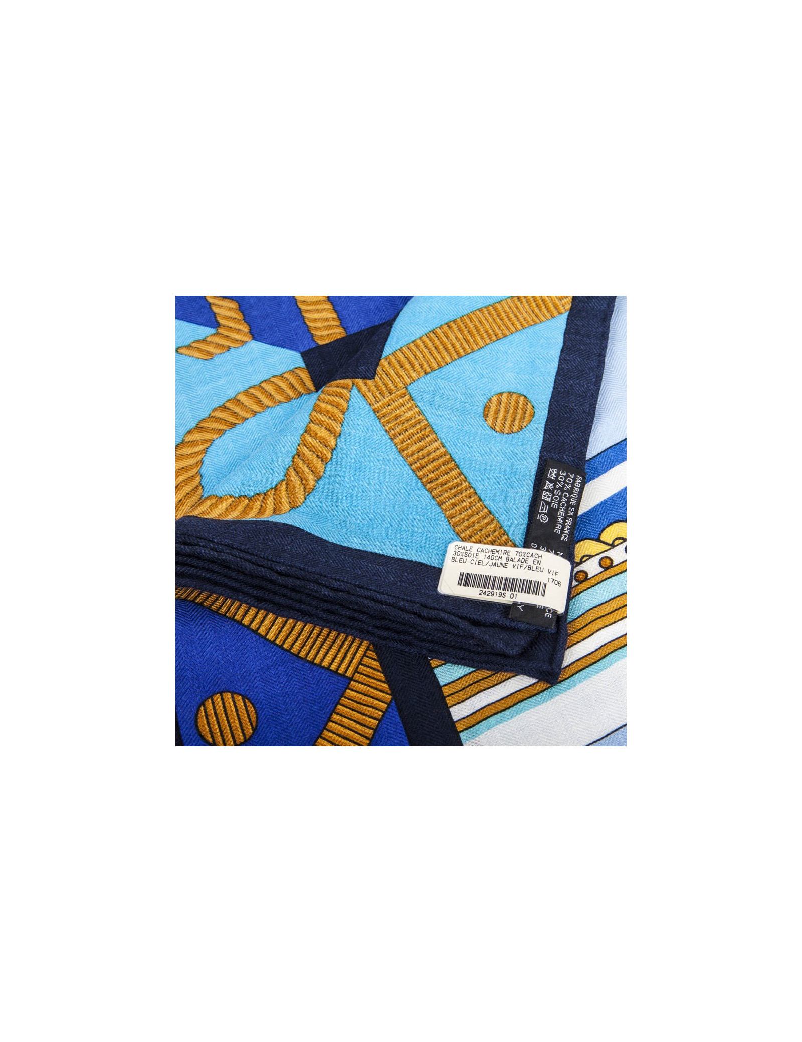 Châle Hermès "Balade en Berline" en cachemire et soie bleu ciel, bleu vif et jaune vif.