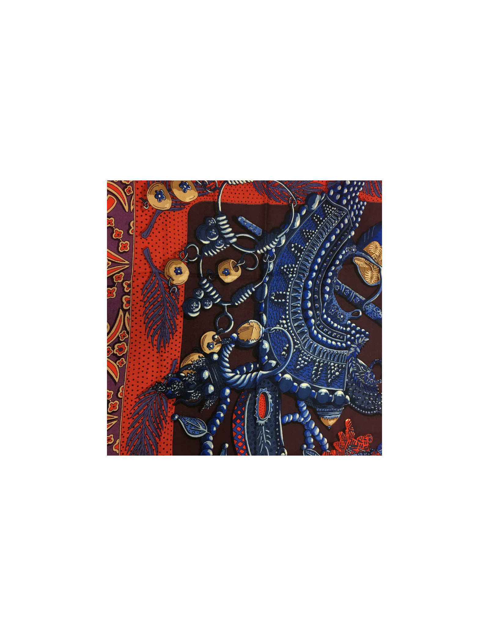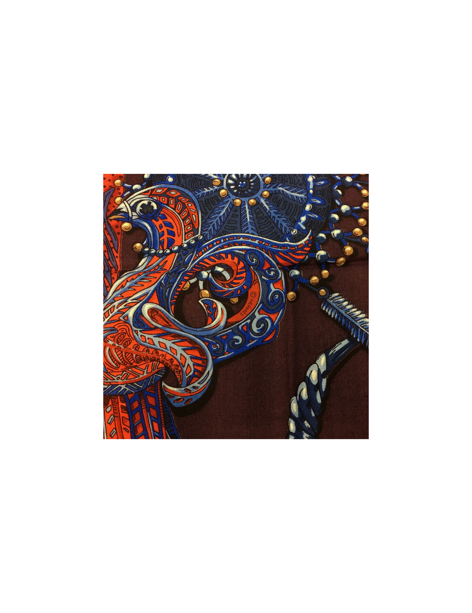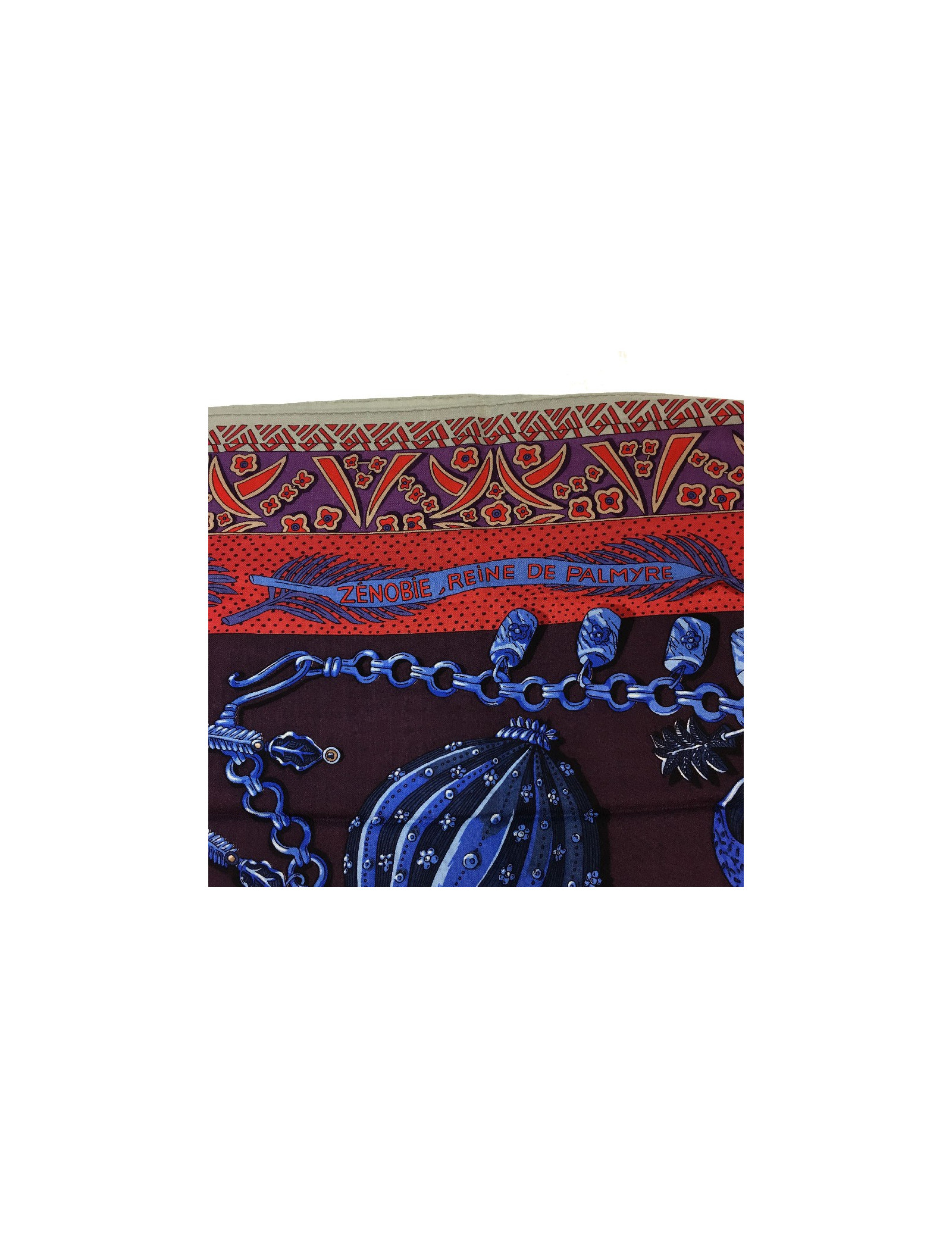 Superbe étole Hermès, modèle « Zénobie, reine de Palmyre » dans les tons aubergine, bleu dur et rouge. Il a été dessiné par Annie Faivre.