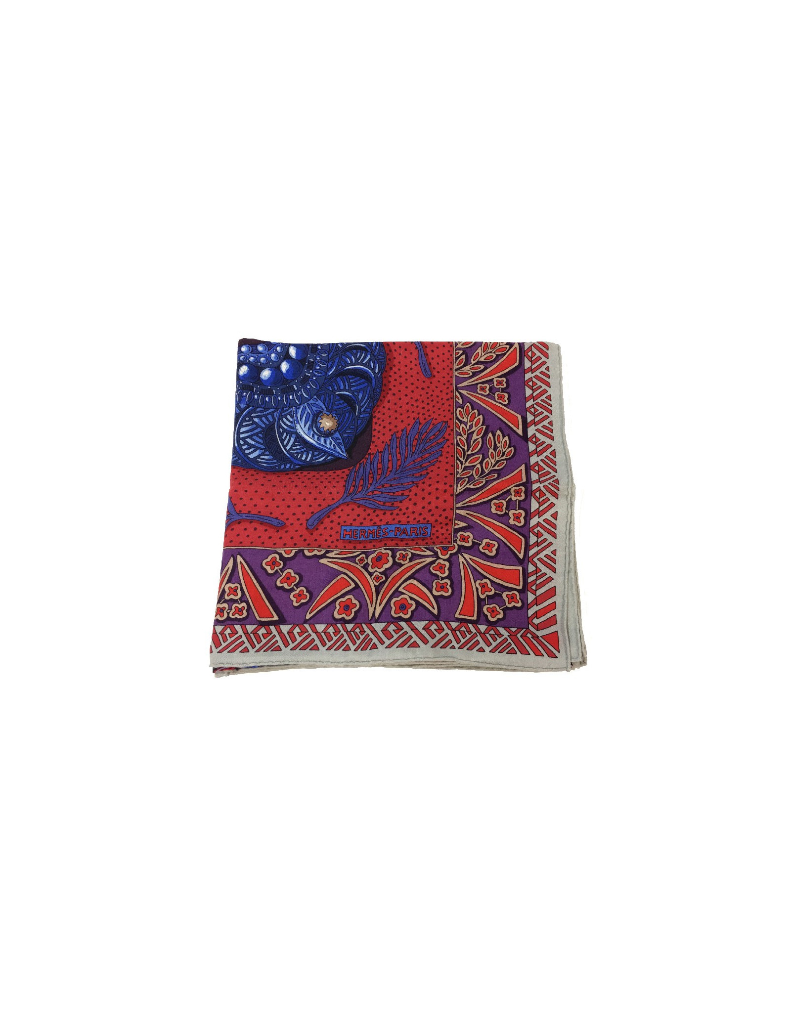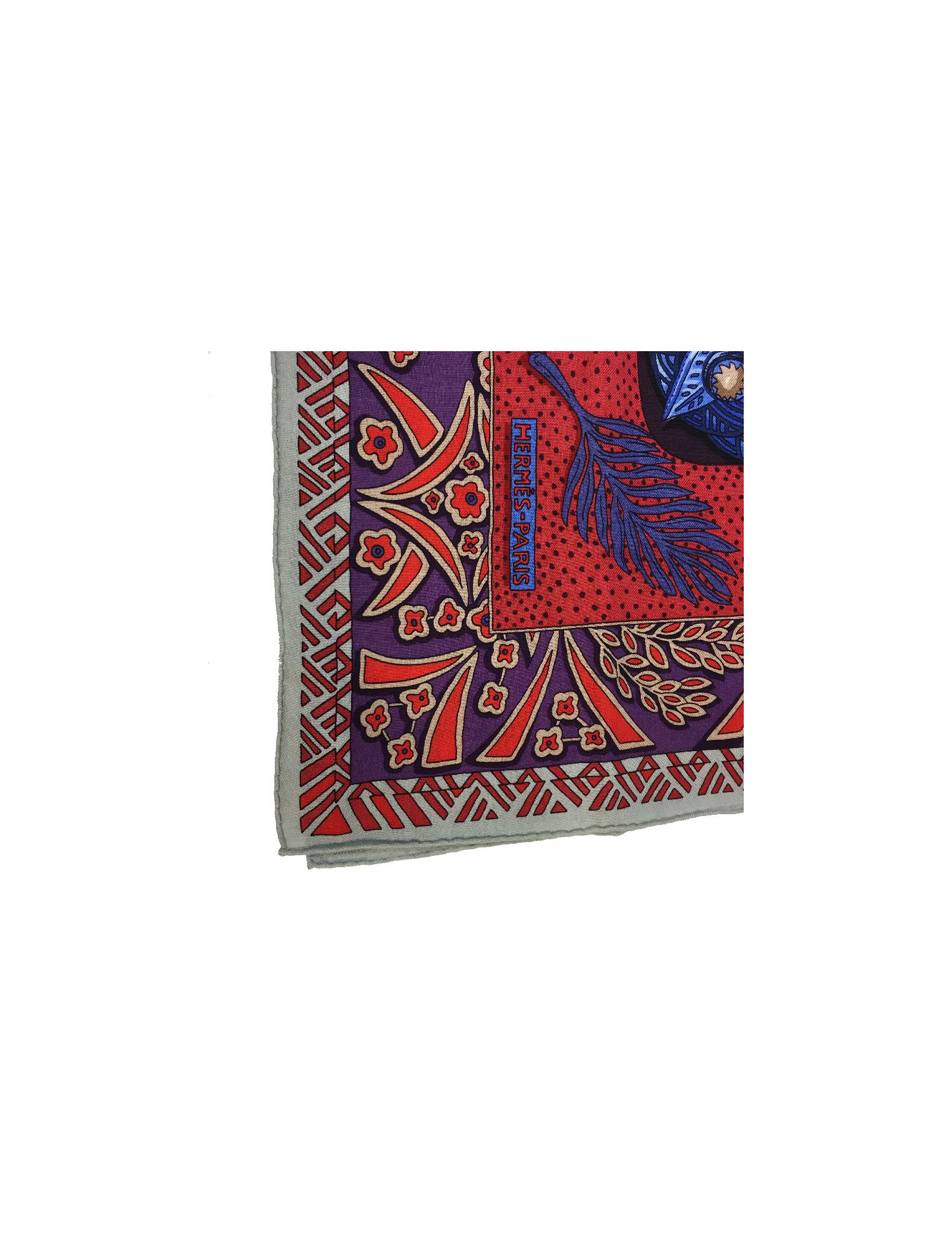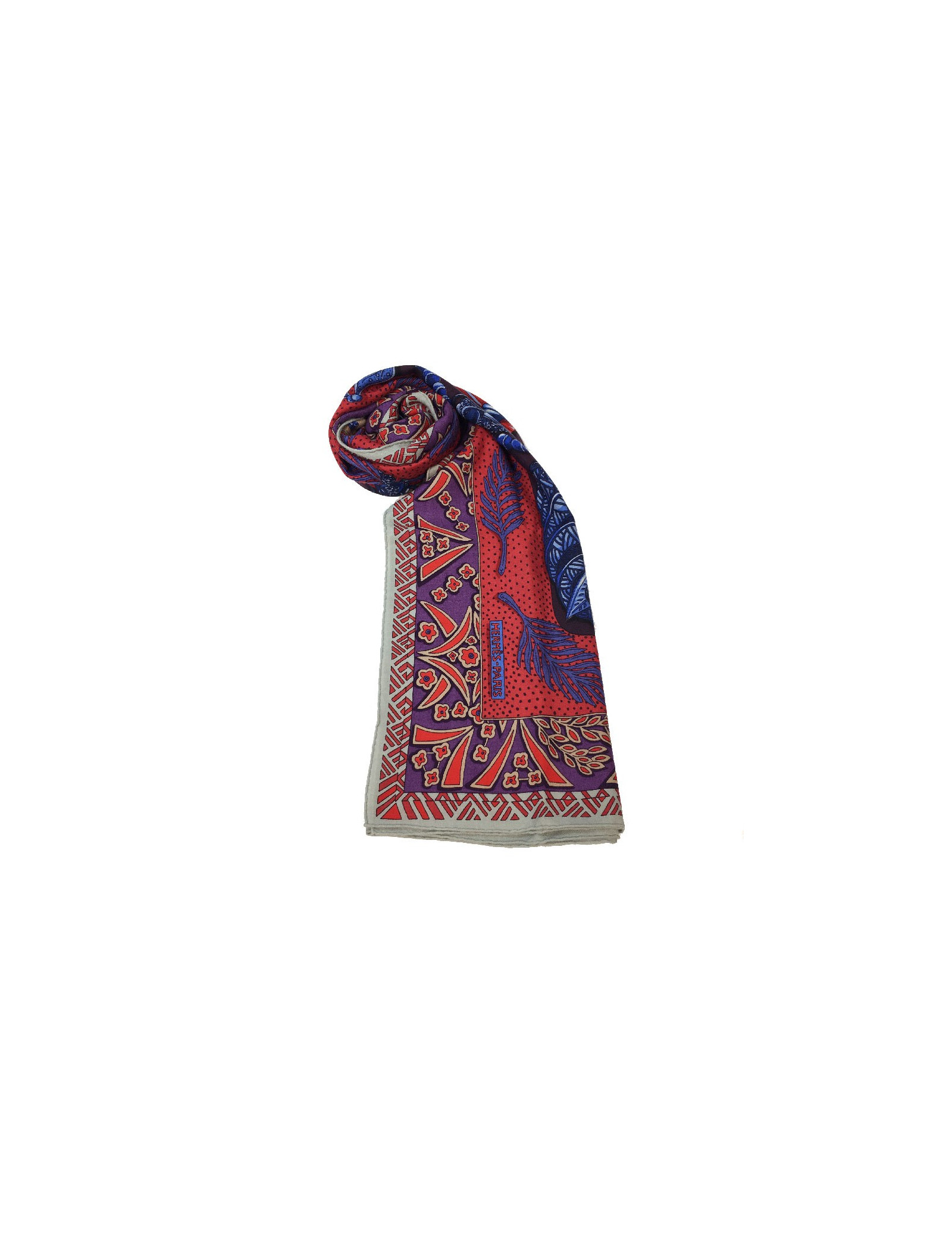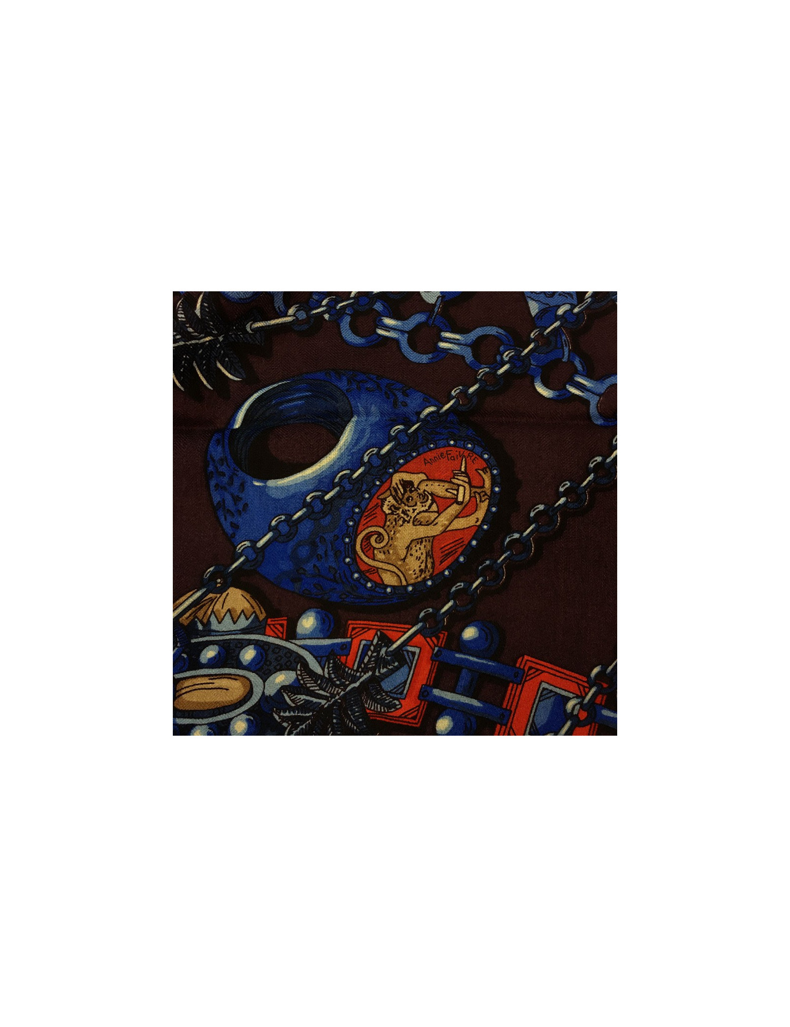 Superbe étole Hermès, modèle « Zénobie, reine de Palmyre » dans les tons aubergine, bleu dur et rouge. Il a été dessiné par Annie Faivre.
