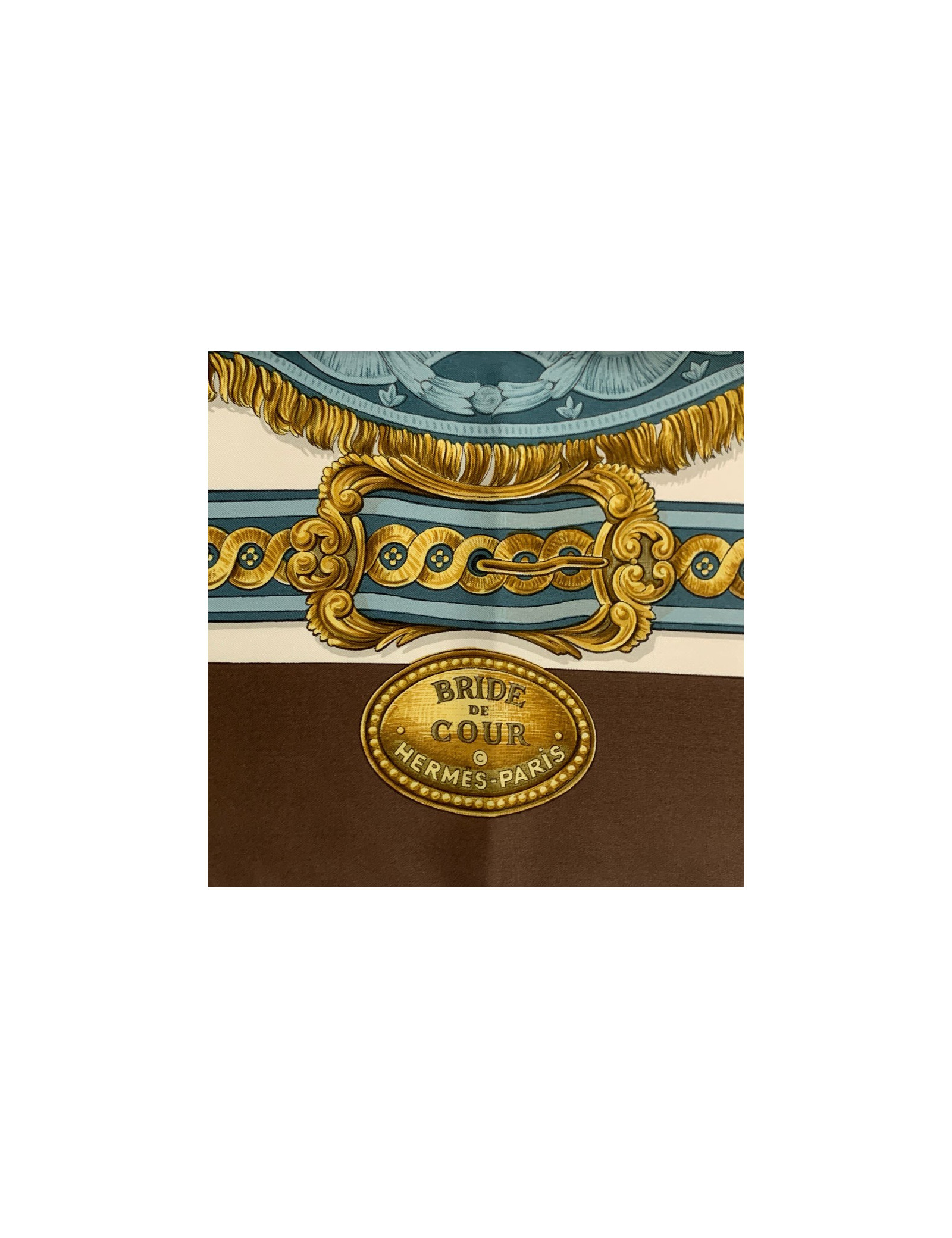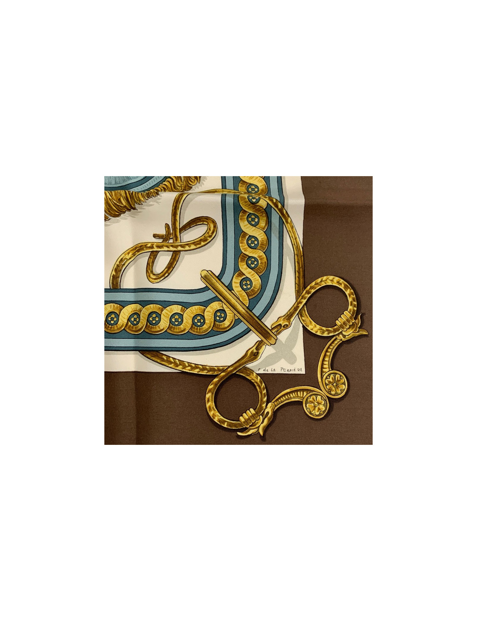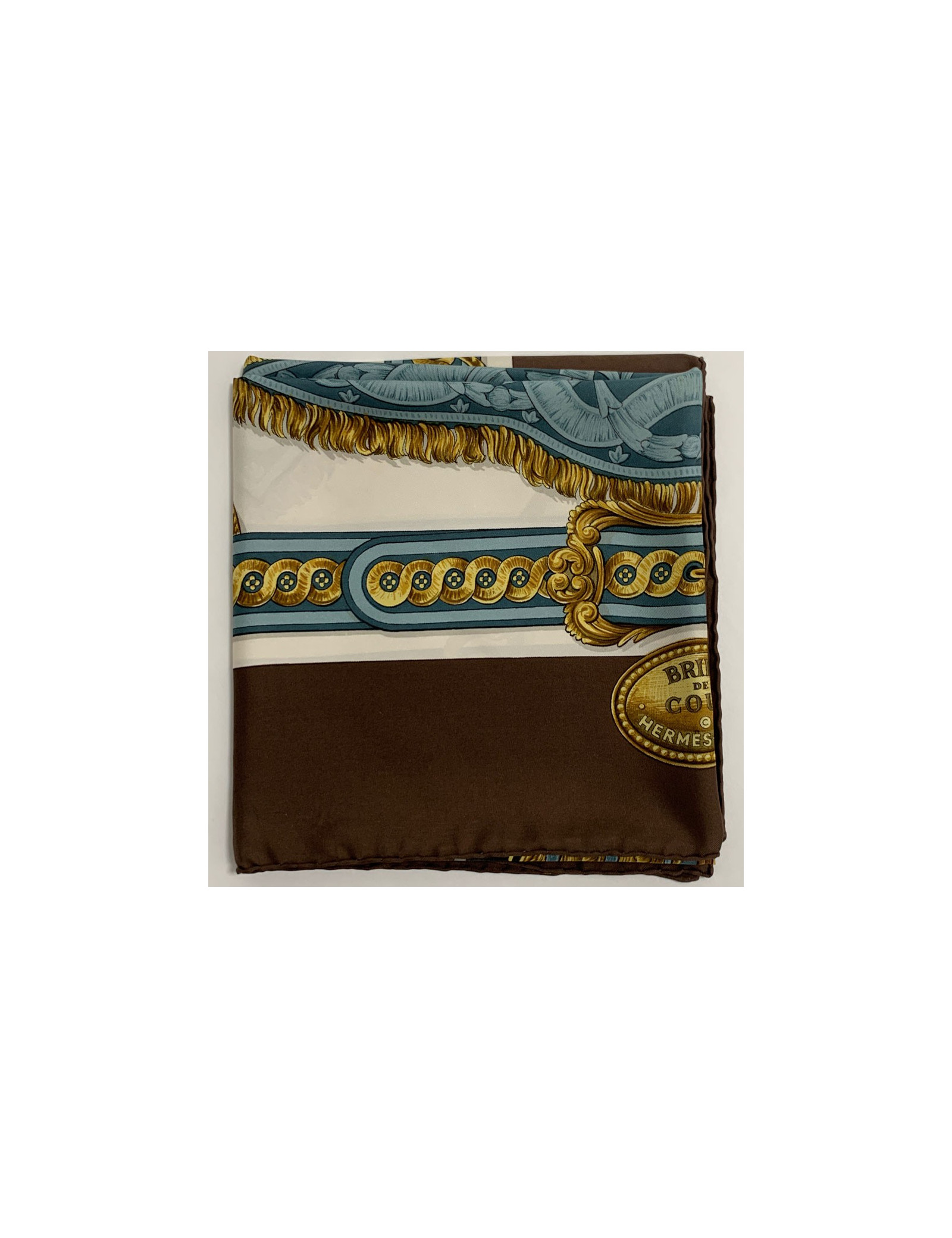 Très beau carré de la Maison HERMES, modèle Bride de Cour dessiné par Françoise De La Perrière. La 1ère édition date de 1969. Sa bordure en soie est de couleur marron, le fond en soie beige.