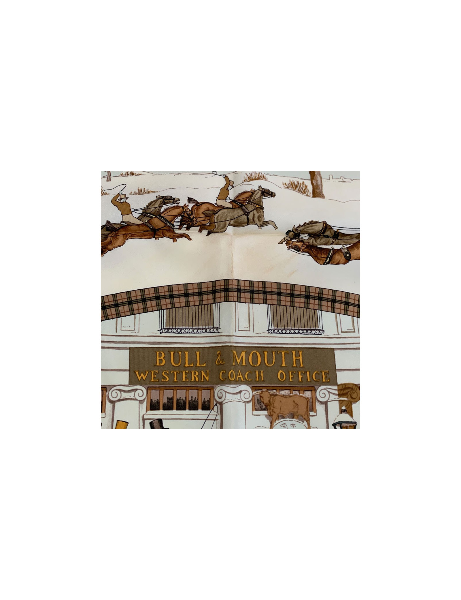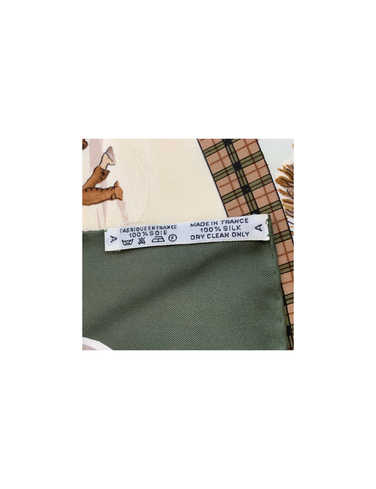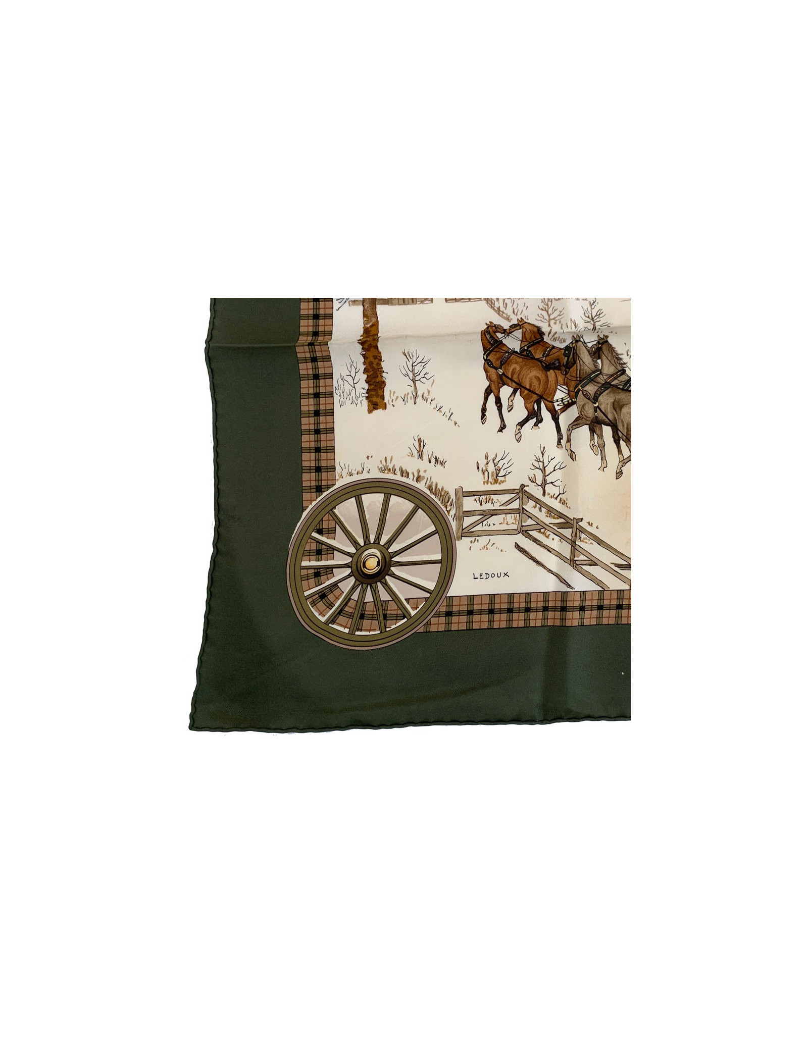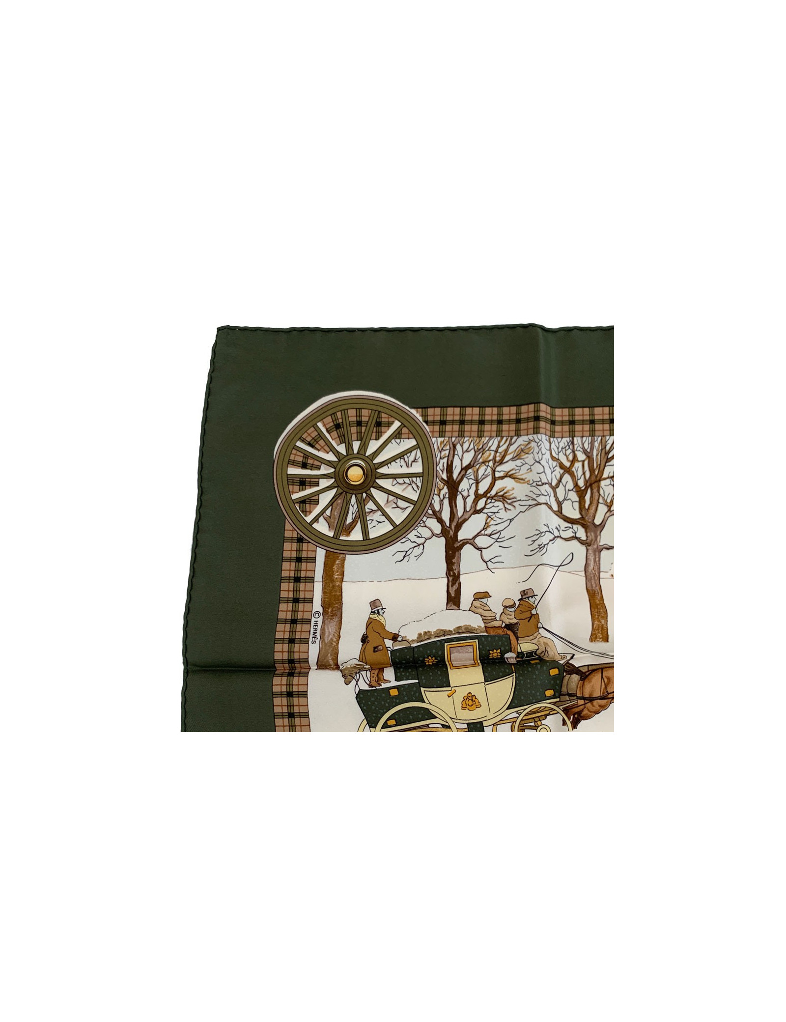 Foulard de la Maison HERMES, modèle L'Hiver en Poste, en soie kaki, vert et beige. Ce carré a été dessiné par Philippe Ledoux. La 1ère édition date de 1975.
