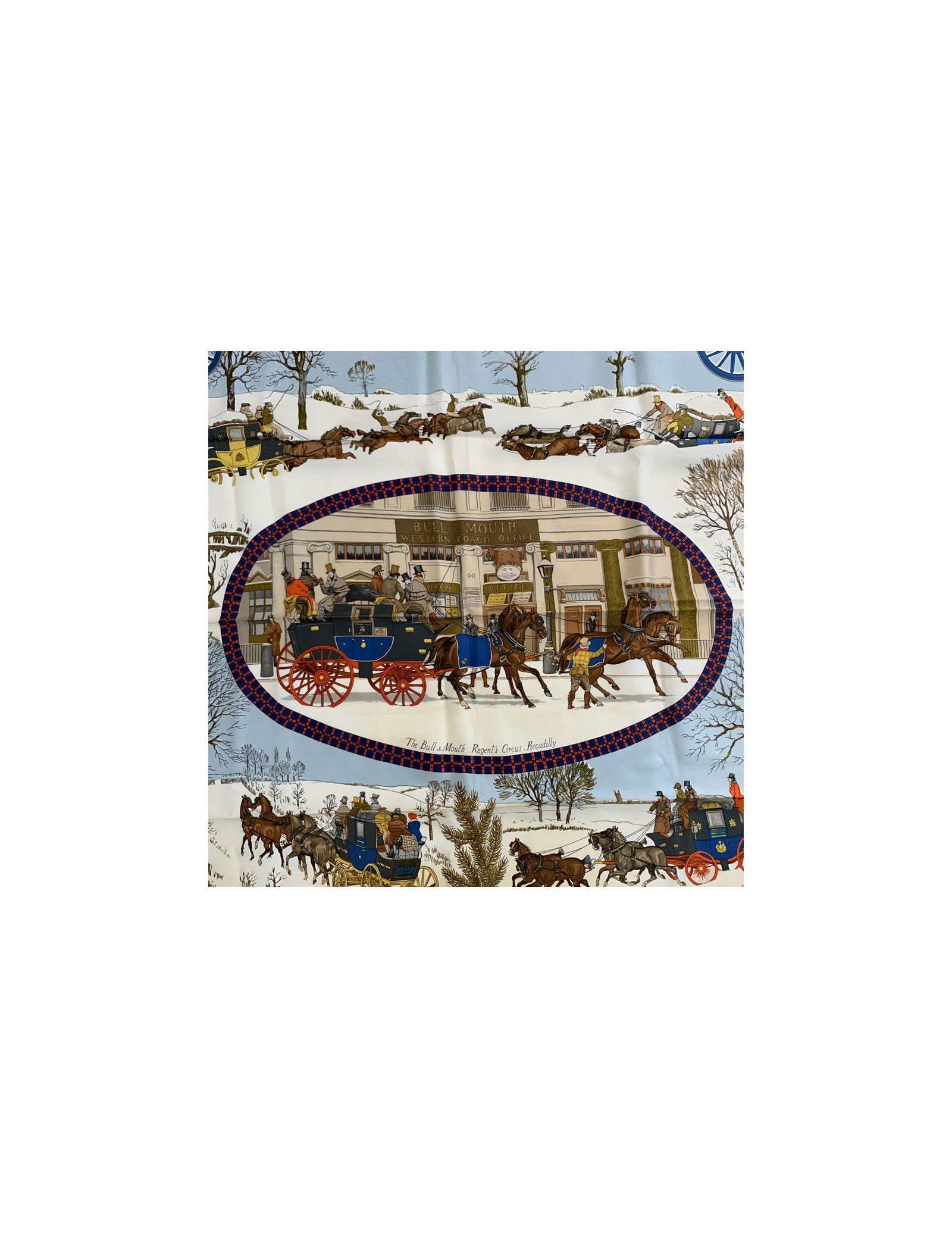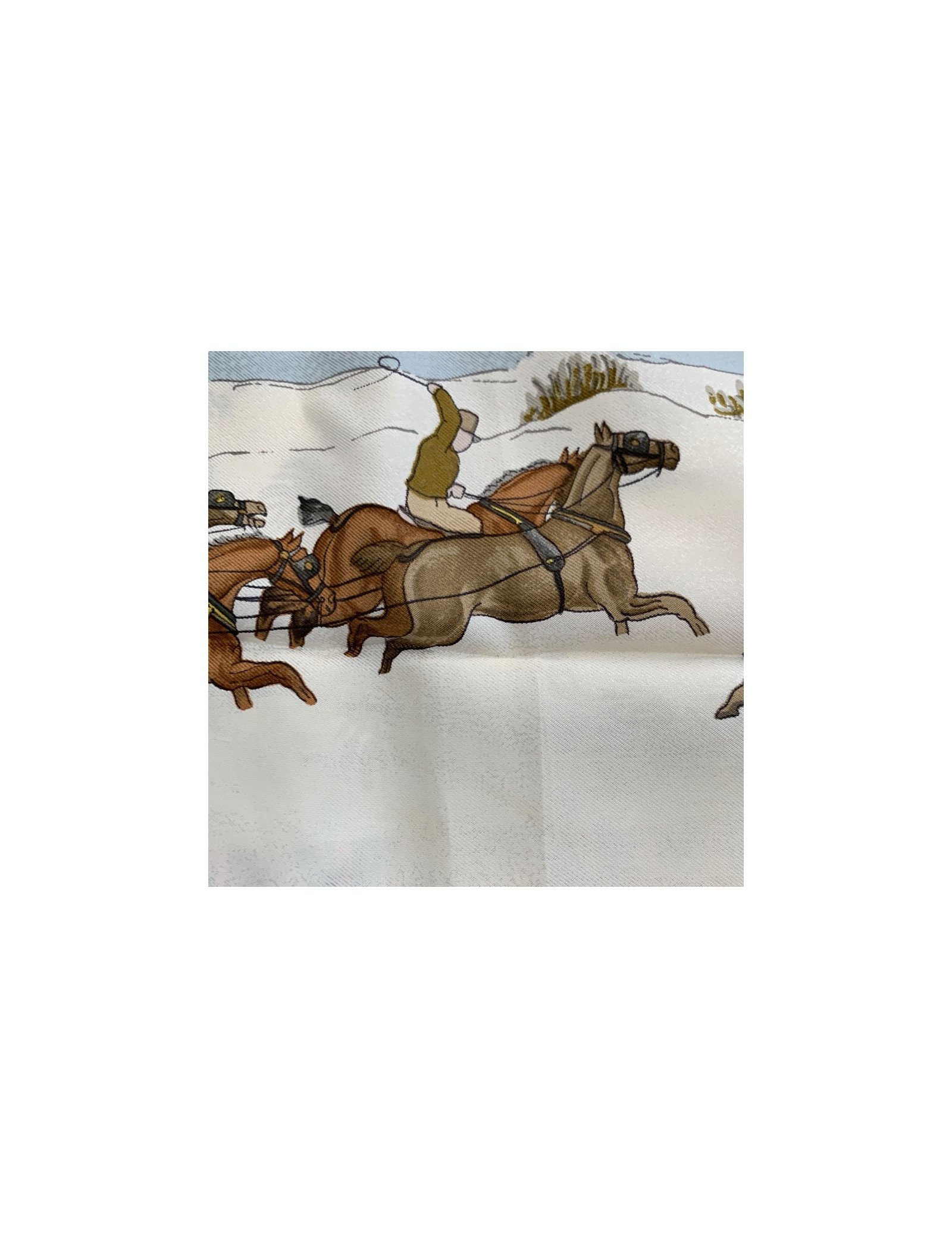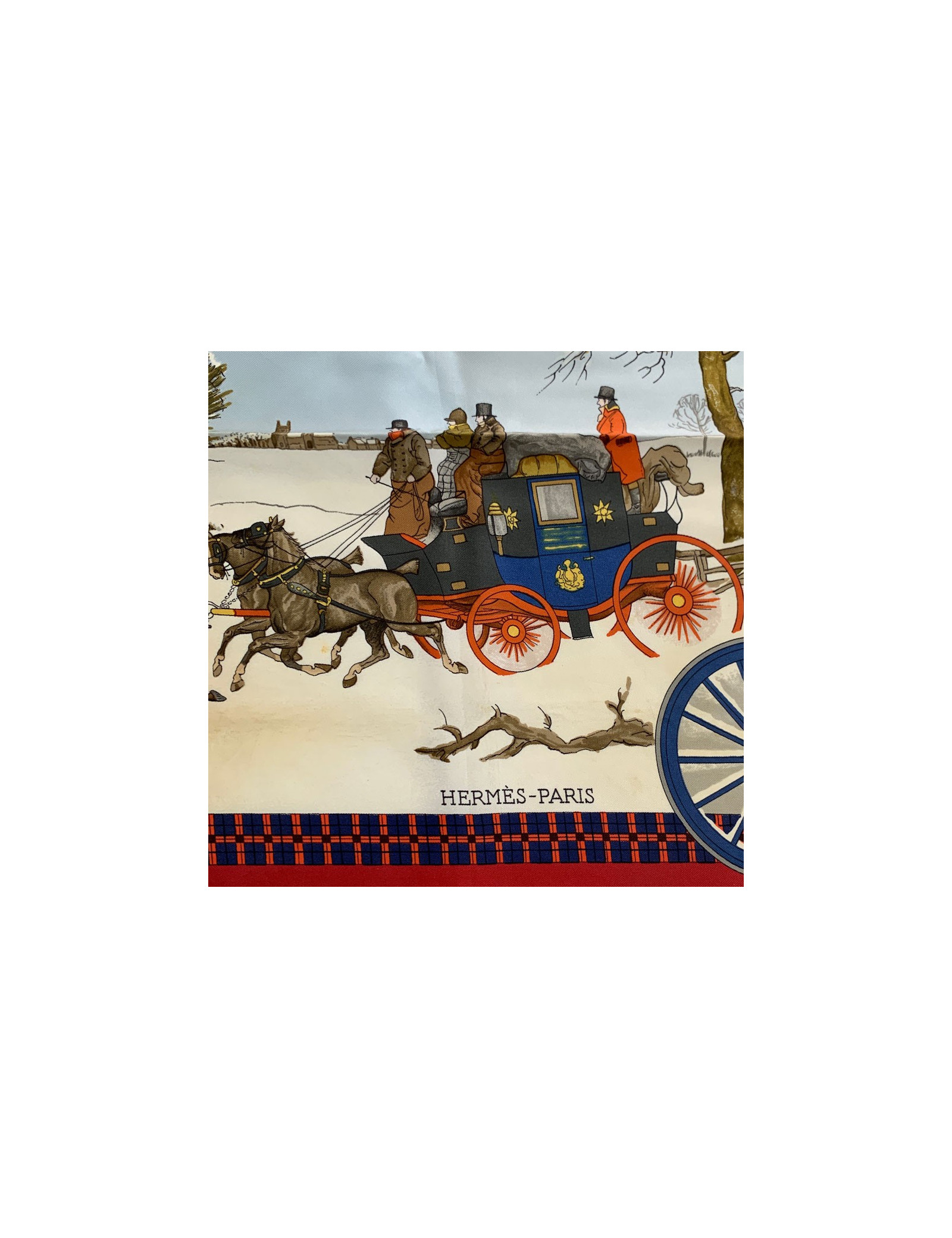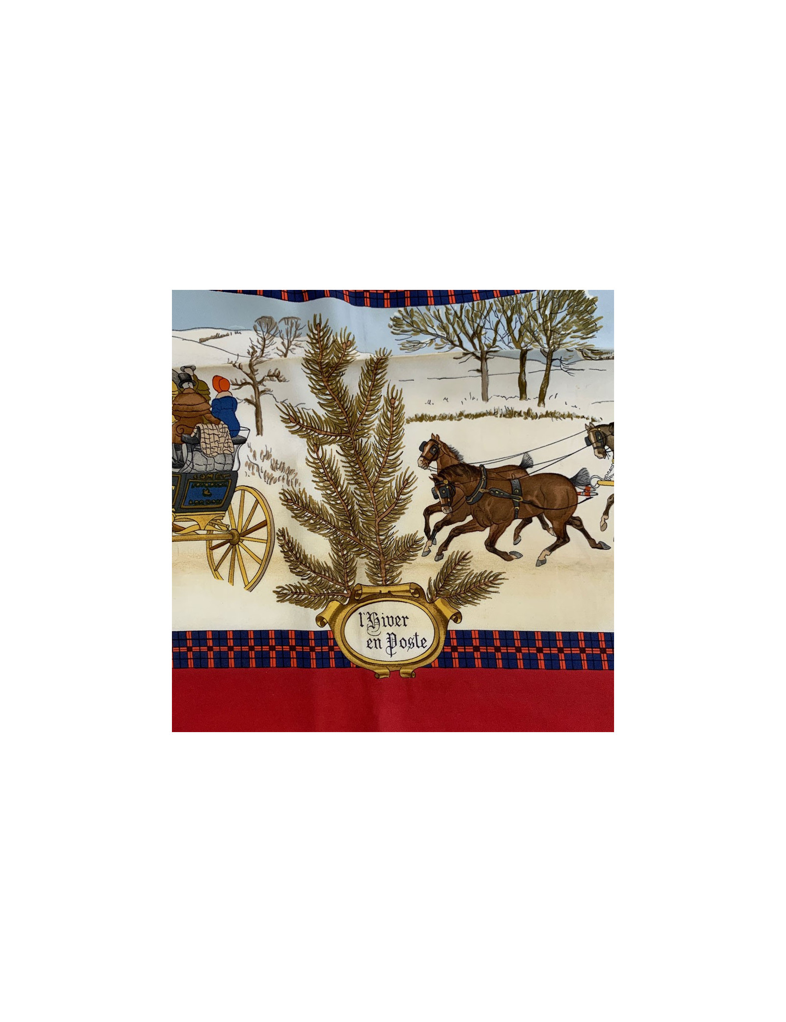 Incontournable accessoire de la Maison HERMES, le carré! Modèle L'Hiver en Poste en soie à bordure rouge, fond beige et bleu ciel. Il a été dessiné par Philippe Ledoux. Sa 1ère édition date de 1975.