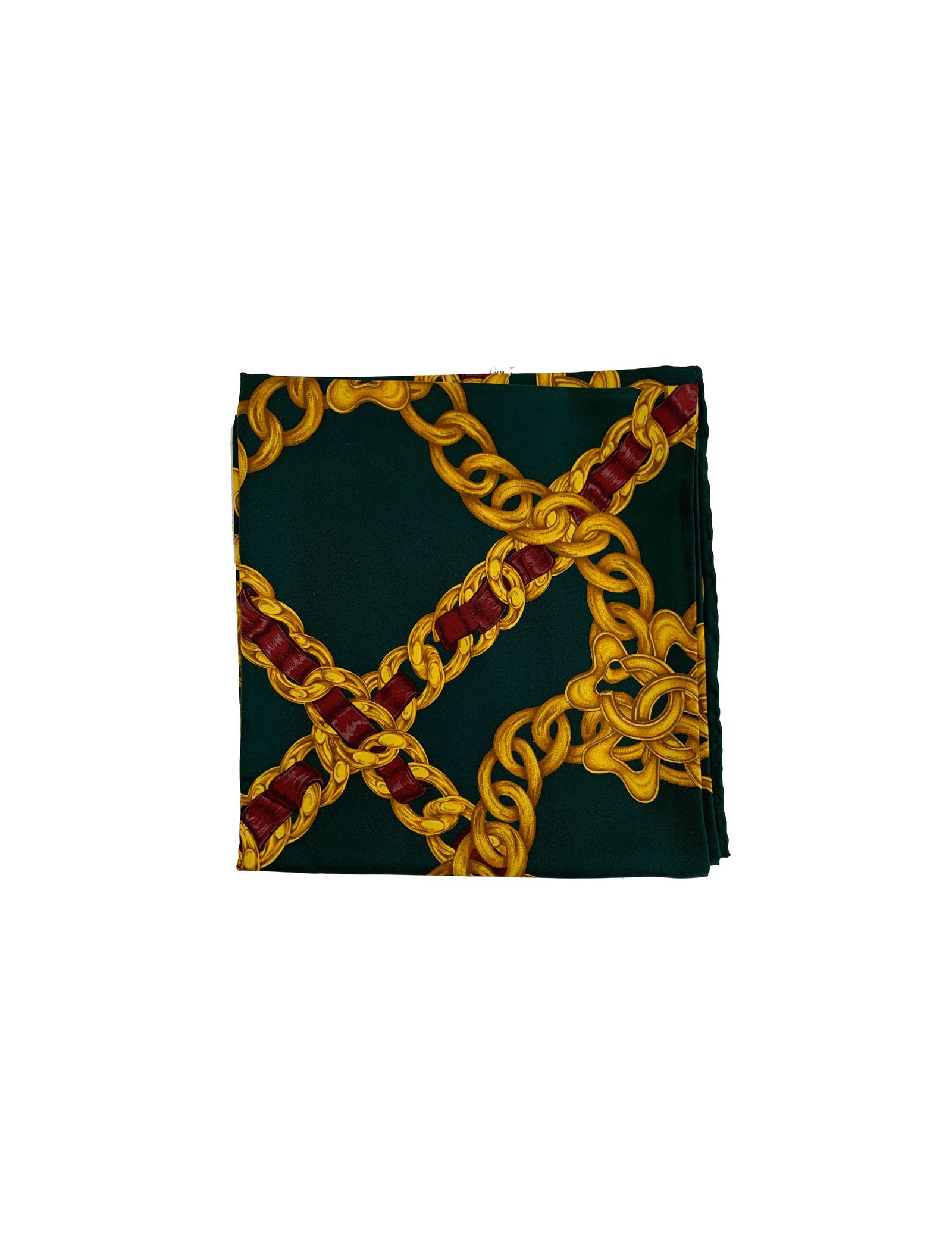 Carré CHANEL imprimé chaînes dorées en soie vert foncé