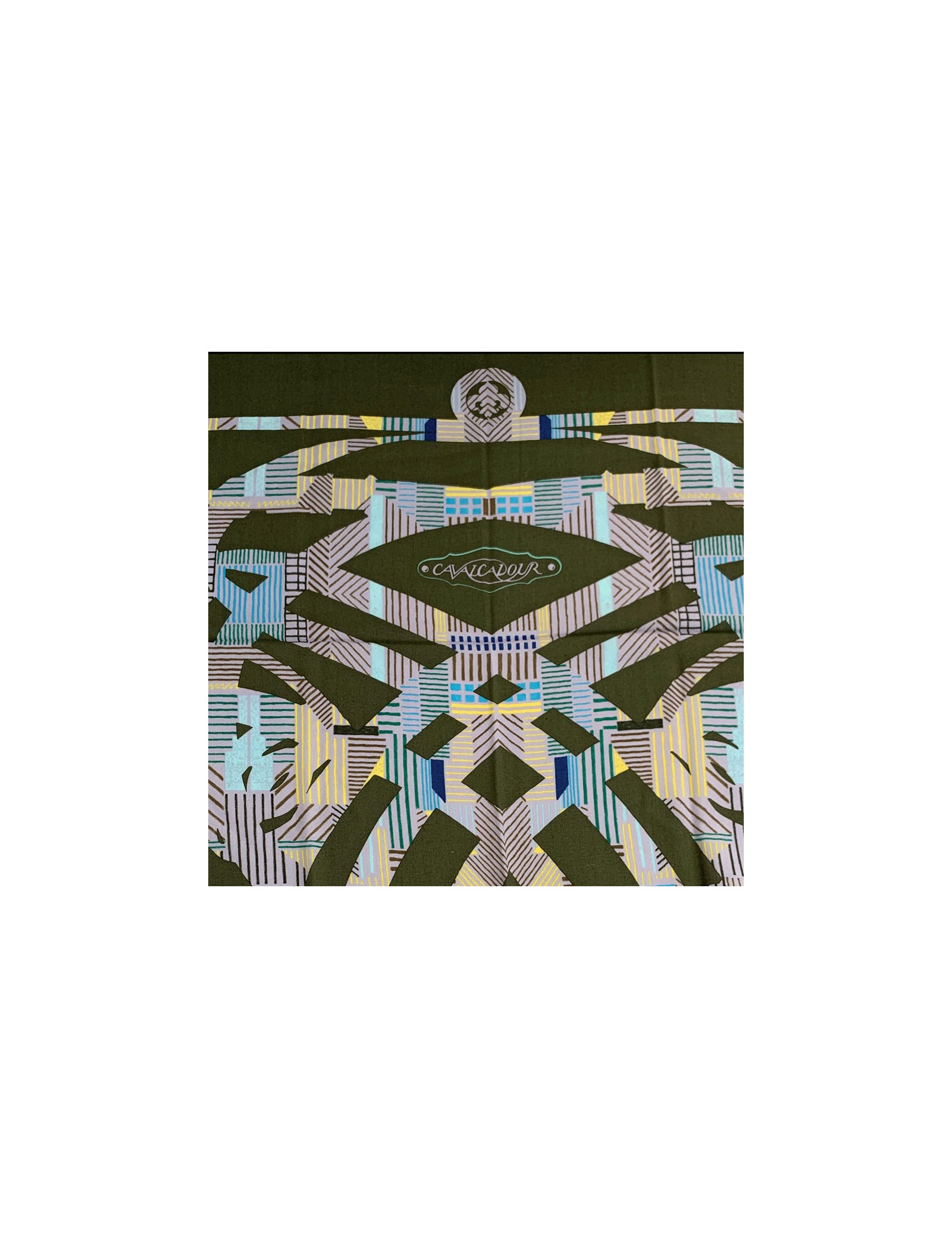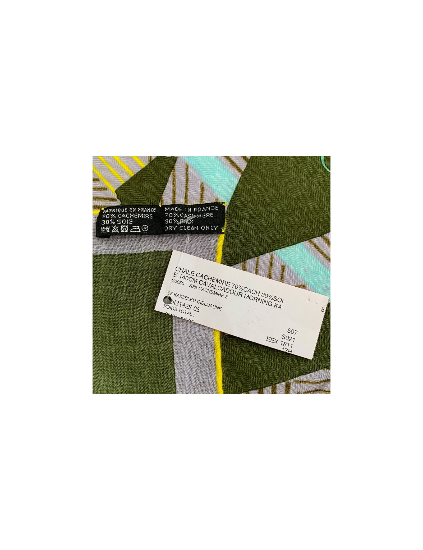 De la douceur avec ce très beau châle de la Maison HERMES. Il est fait de 70% de cachemire et de 30% de soie. La bordure est de couleur jaune. Le bleu ciel et le jaune contraste avec le fond kaki de ce châle.