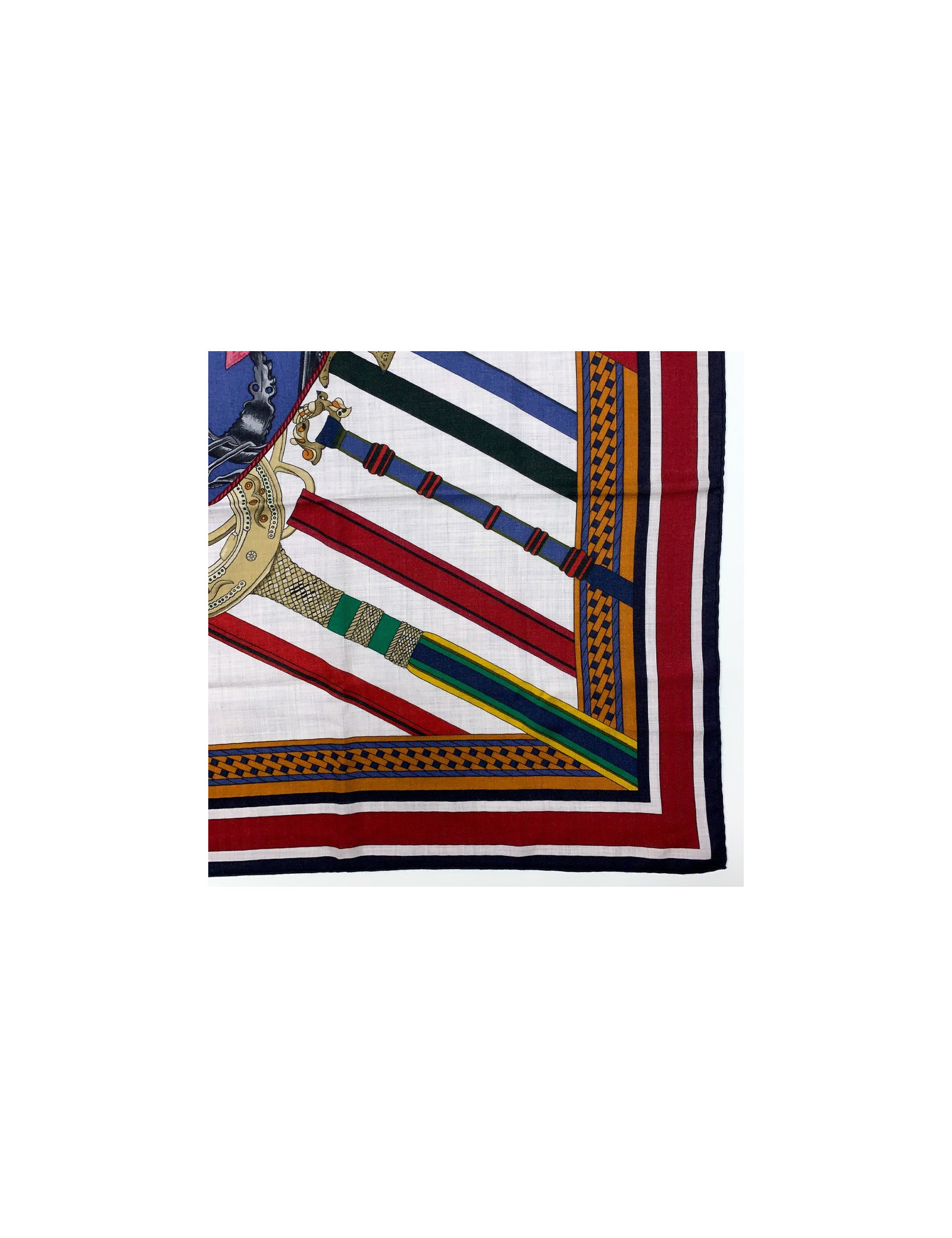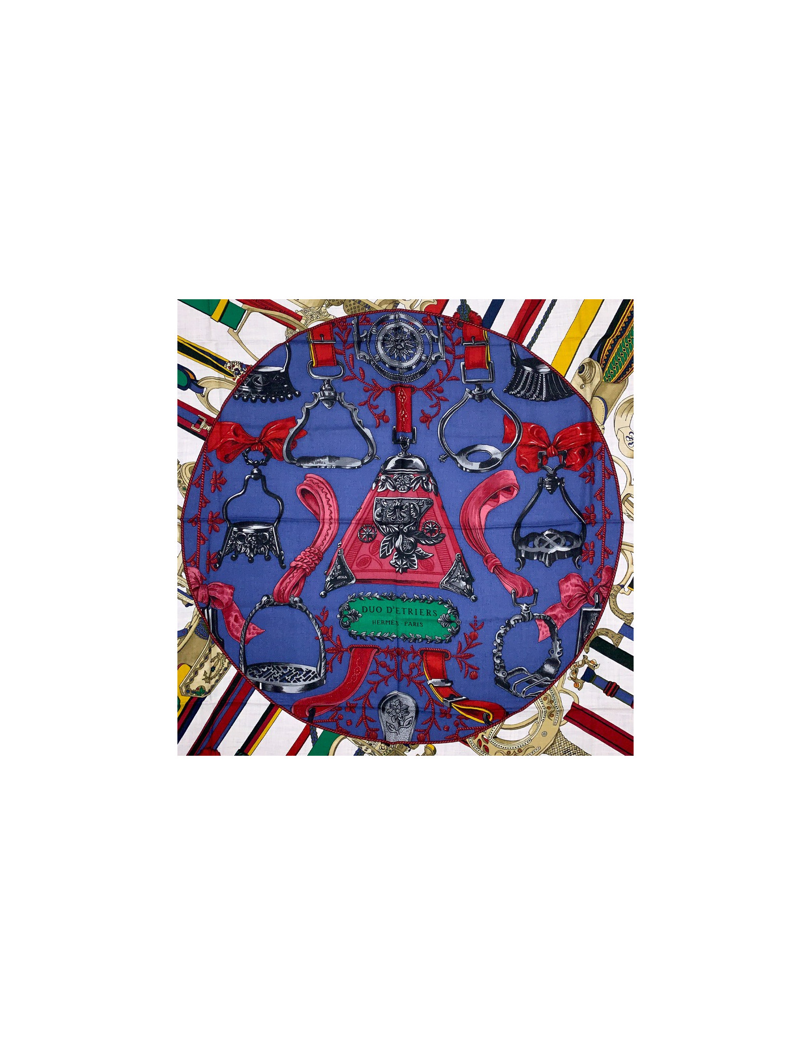 Le châle est de la Maison HERMES. Il a été dessiné en collaboration par Françoise de la Perrière et Virginie Jamin. Ses couleurs dominantes sont le bordeaux, le jaune et le bleu et son motif central comme l'indique son nom, est un étrier que l'on retrouve conjugué sous différentes formes et couleurs de part et d'autres du châle.