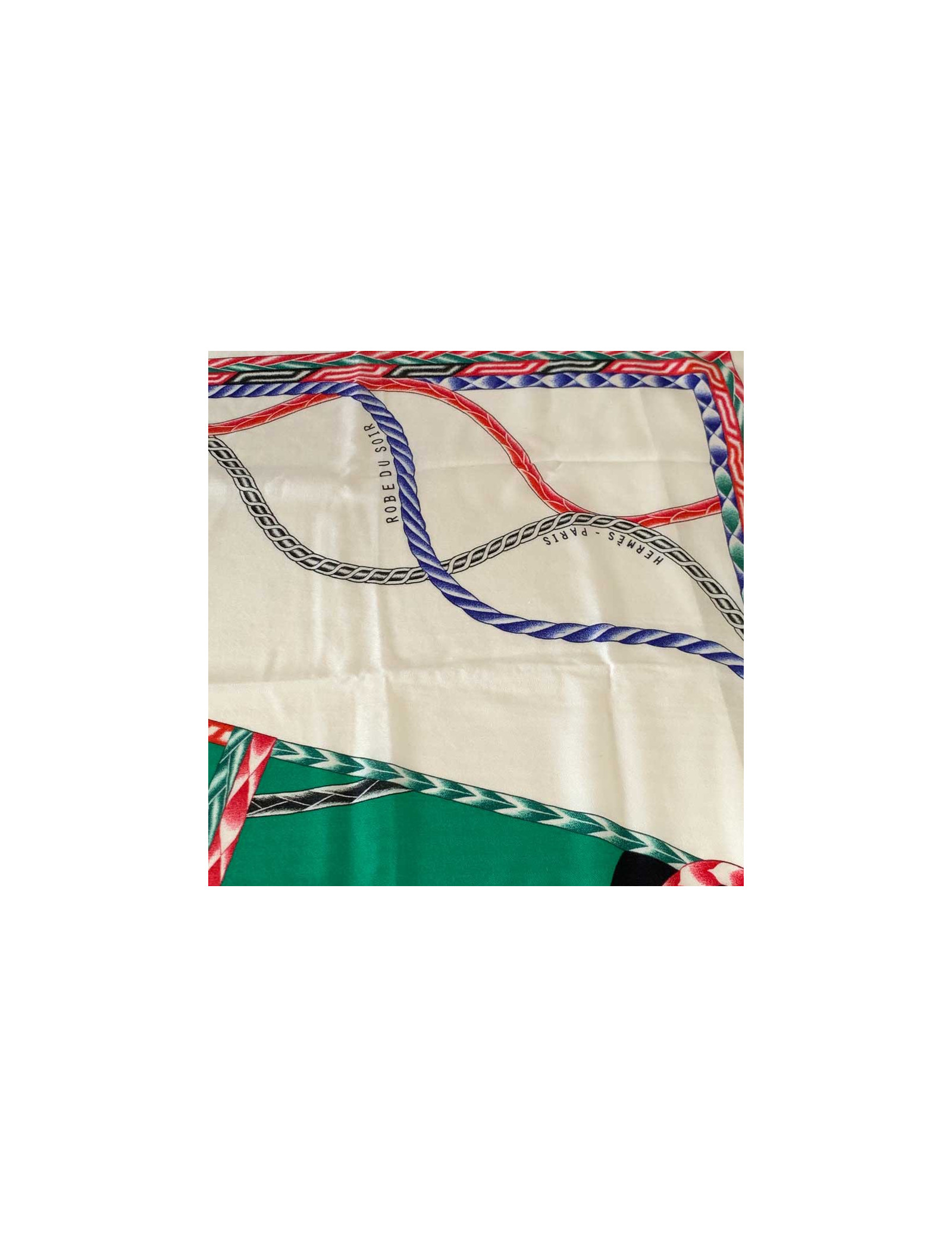 Le châle est de la Maison HERMES et s'intitulé "Robe du soir". Il a été dessiné par F. Hanlik qui propose là un cheval, animal fétiche de la marque. Il se décline dans les tons de bleu, rouge, vert, noir et blanc.