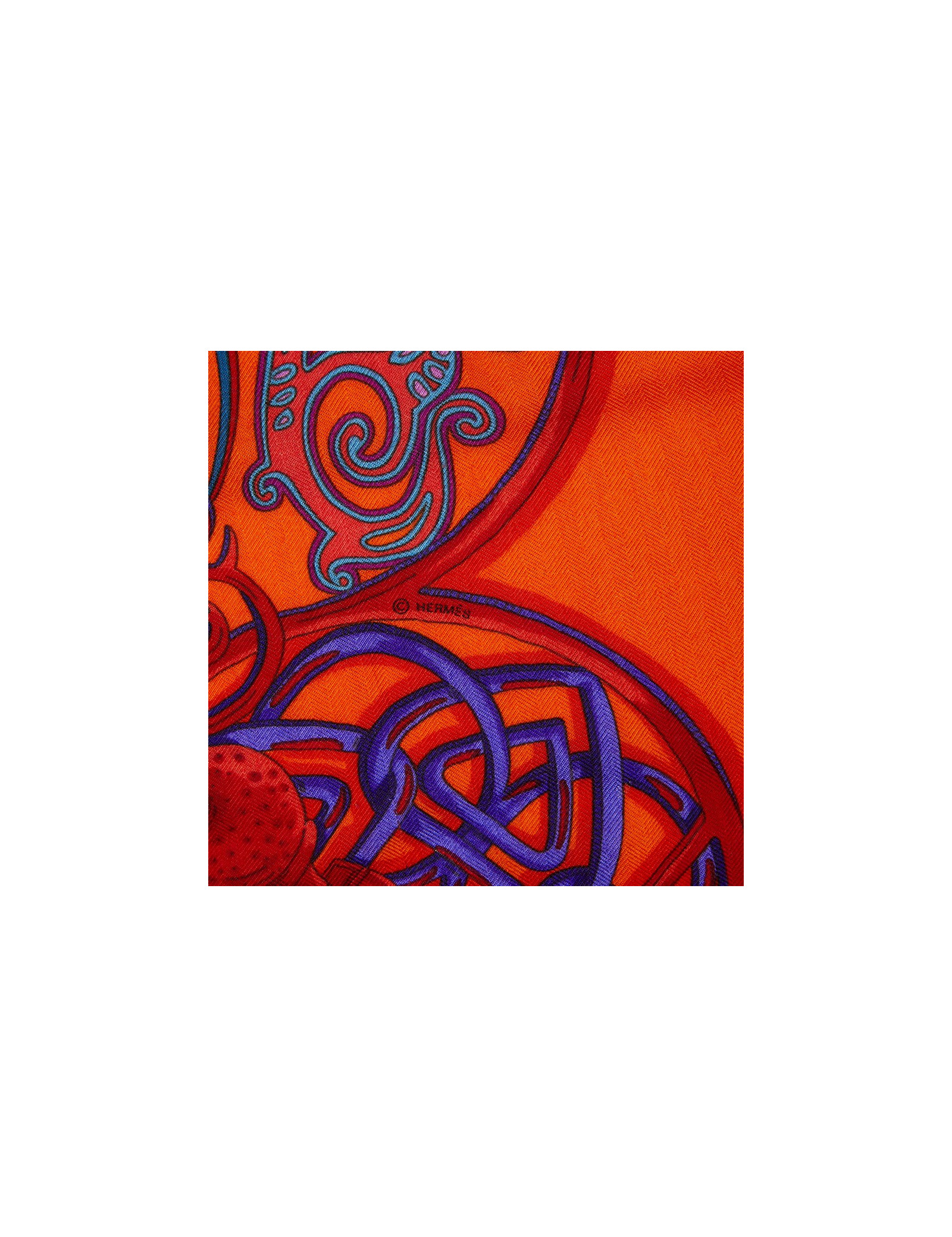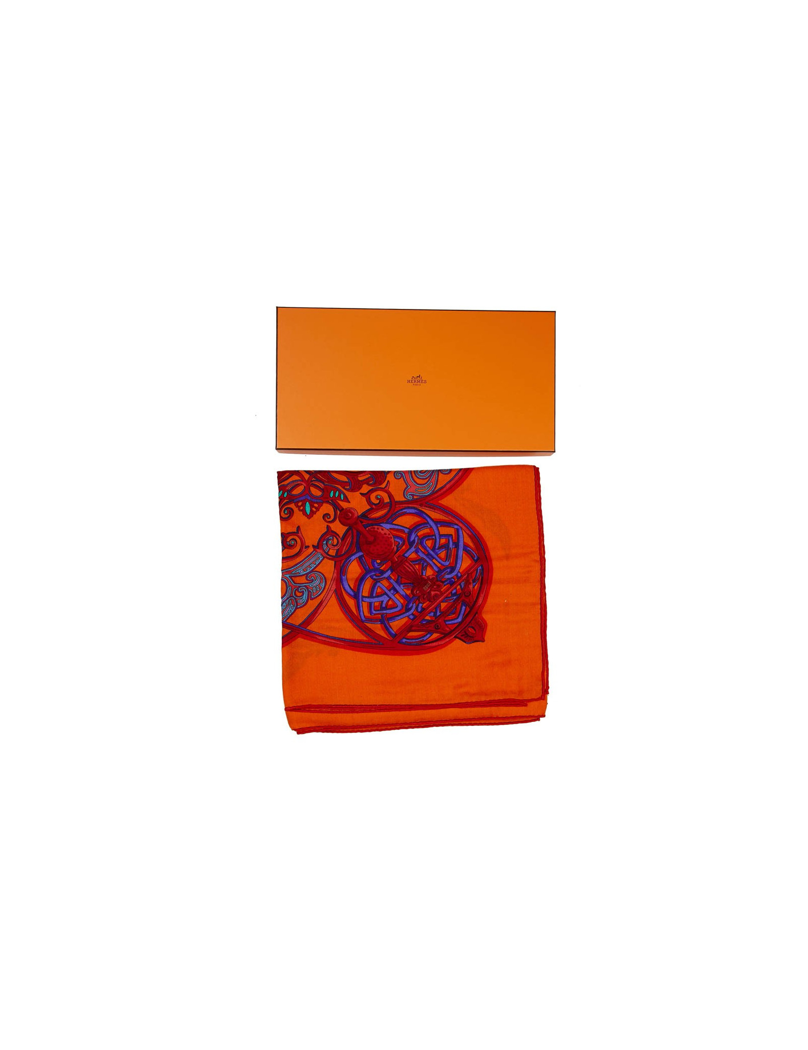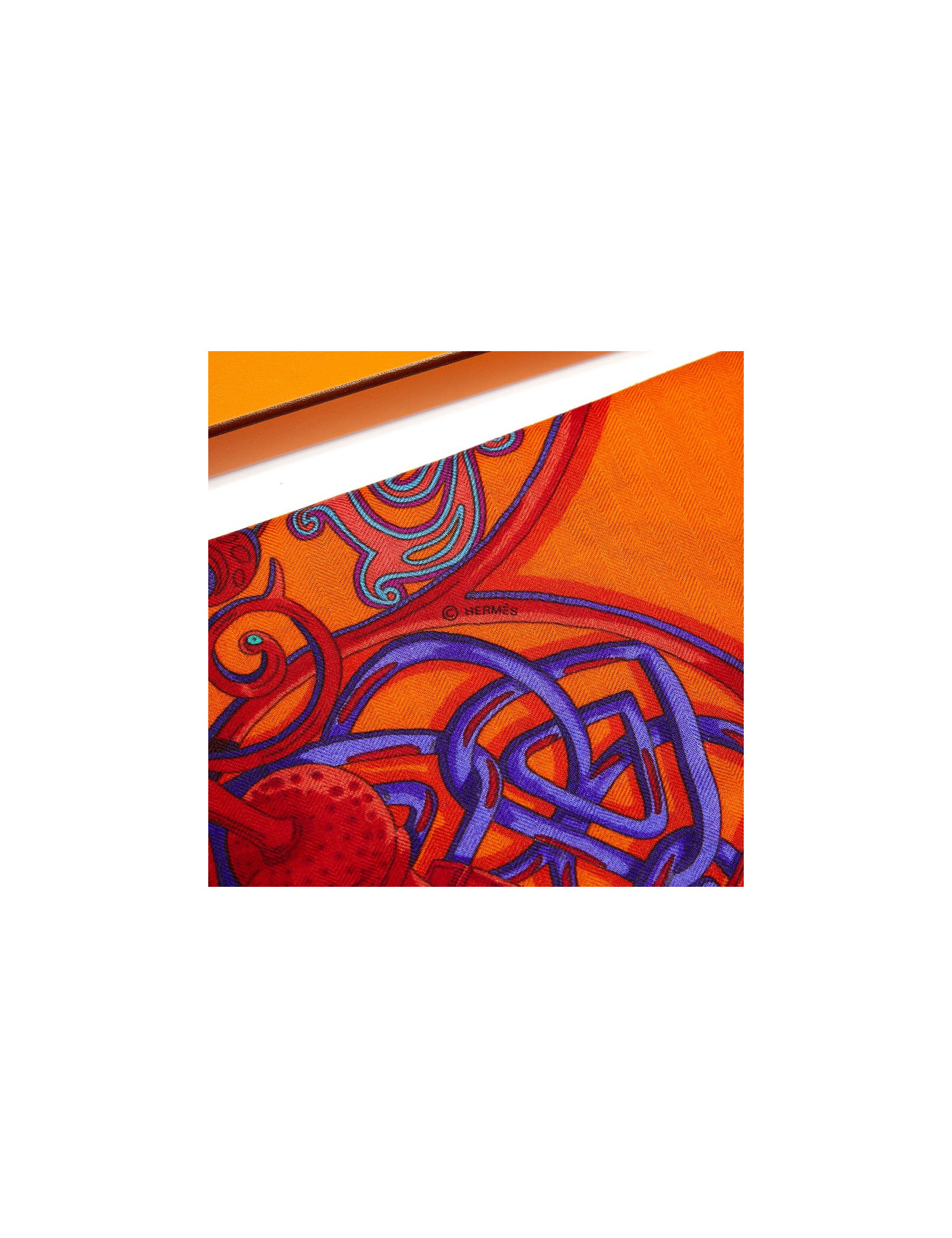 Très grand châle en cachemire et soie de la Maison Hermes dessine par Annie Faivre. La couleur dominante est le orange avec une pointe de rouge et bleu. Aucune usure.