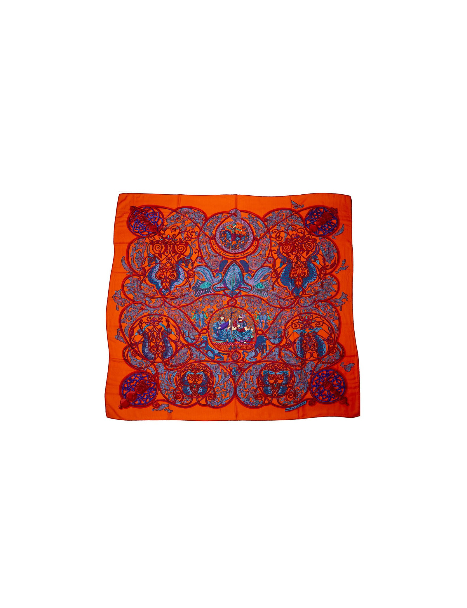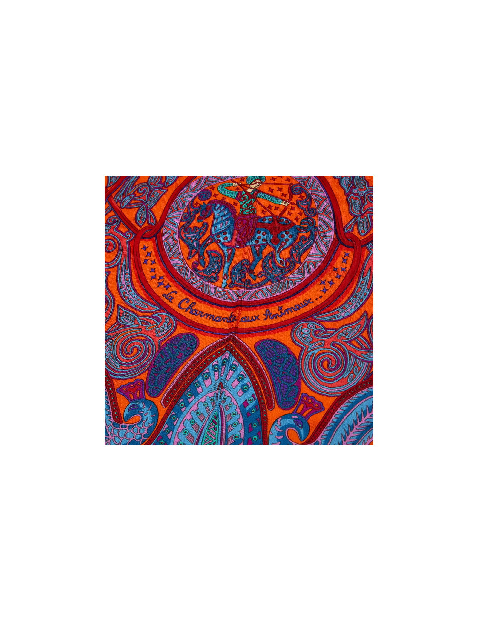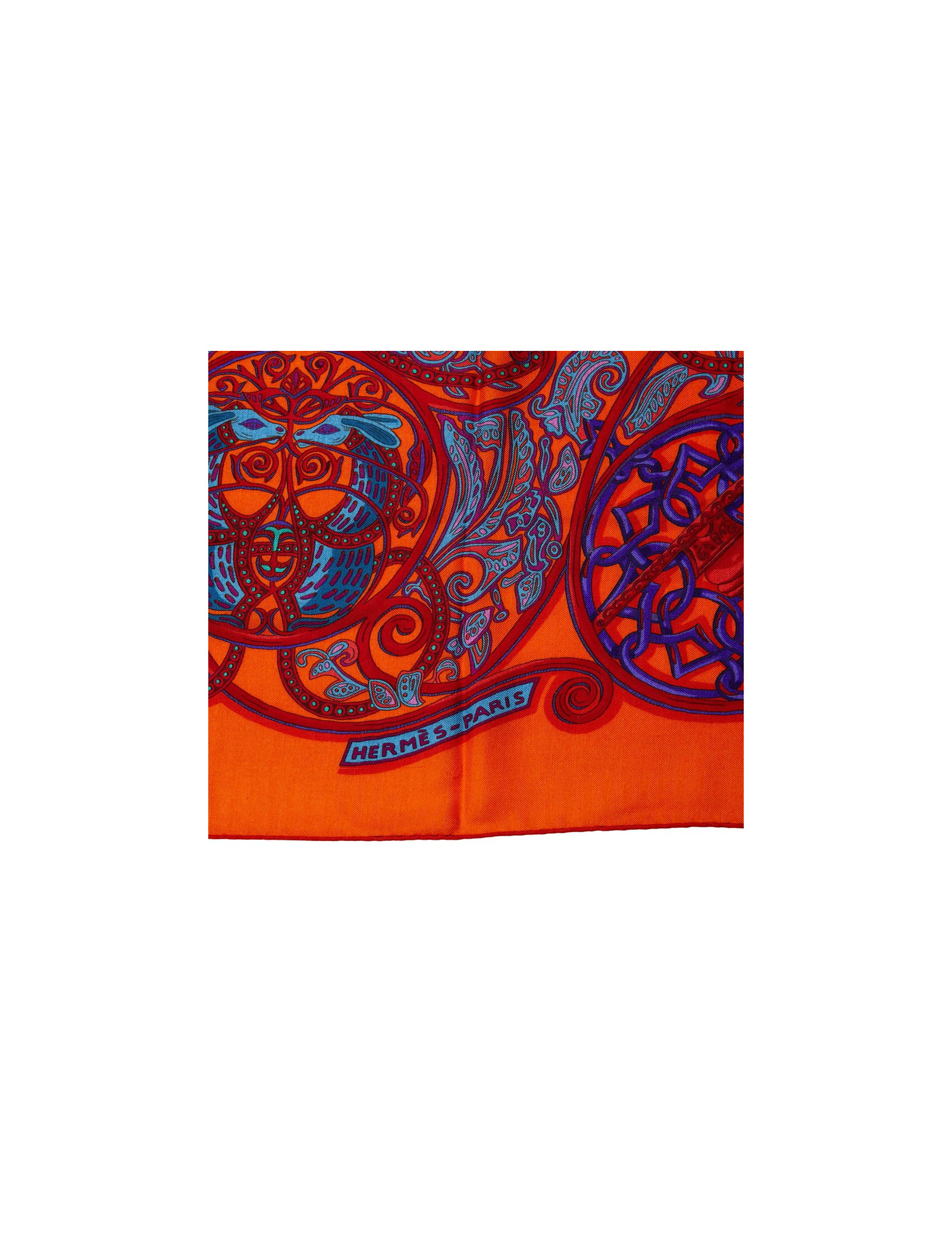 Très grand châle en cachemire et soie de la Maison Hermes dessine par Annie Faivre. La couleur dominante est le orange avec une pointe de rouge et bleu. Aucune usure.