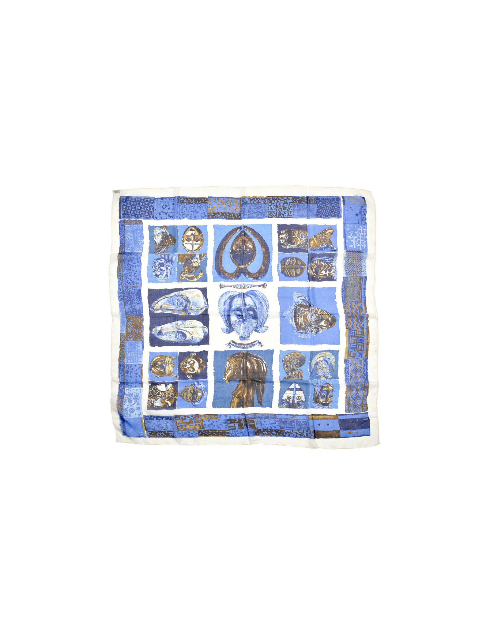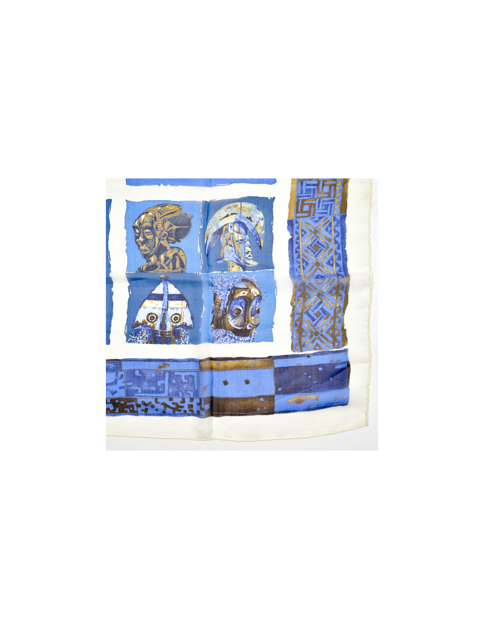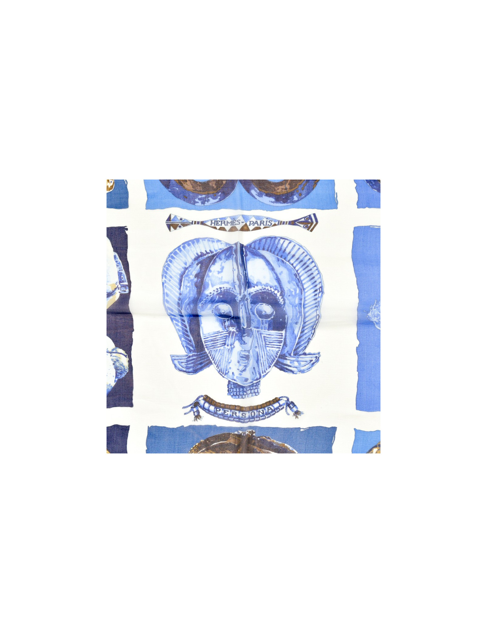 Le carré est de la Maison HERMES. Dessiné par Loic Dubigeon qui l'intitule "Persona" en 1997, il représente des masques tribaux sur fond bleu et marron.