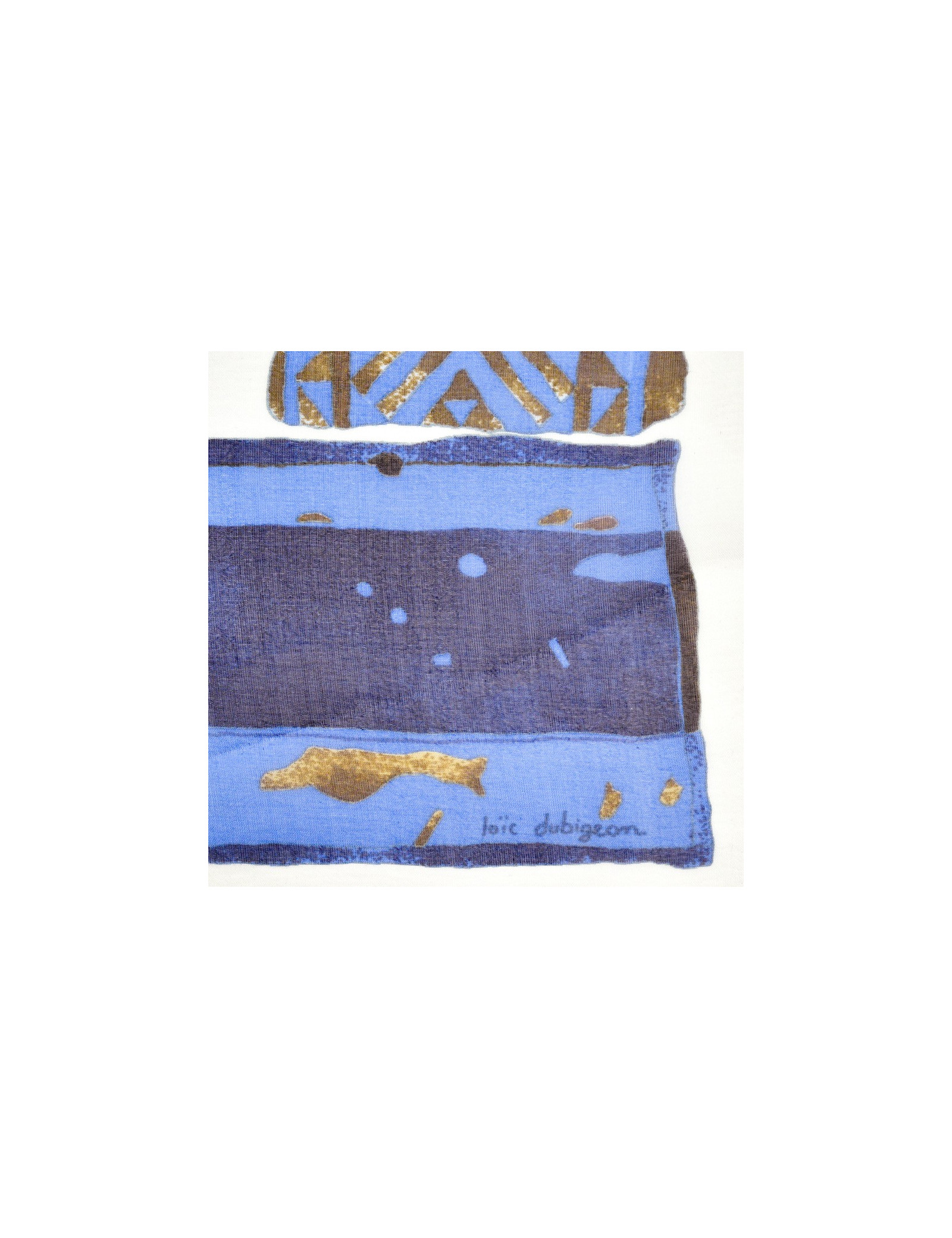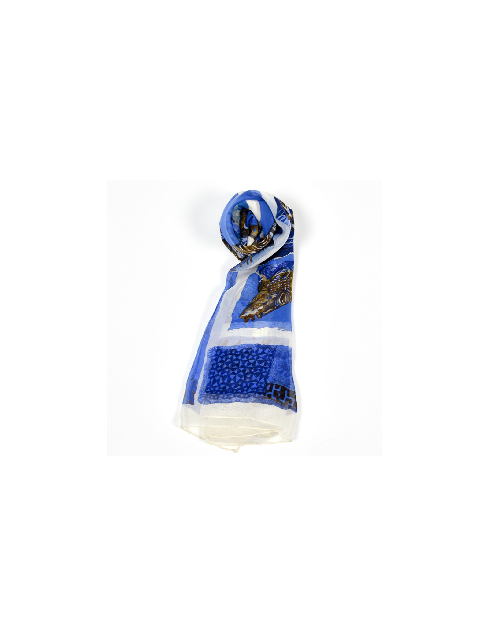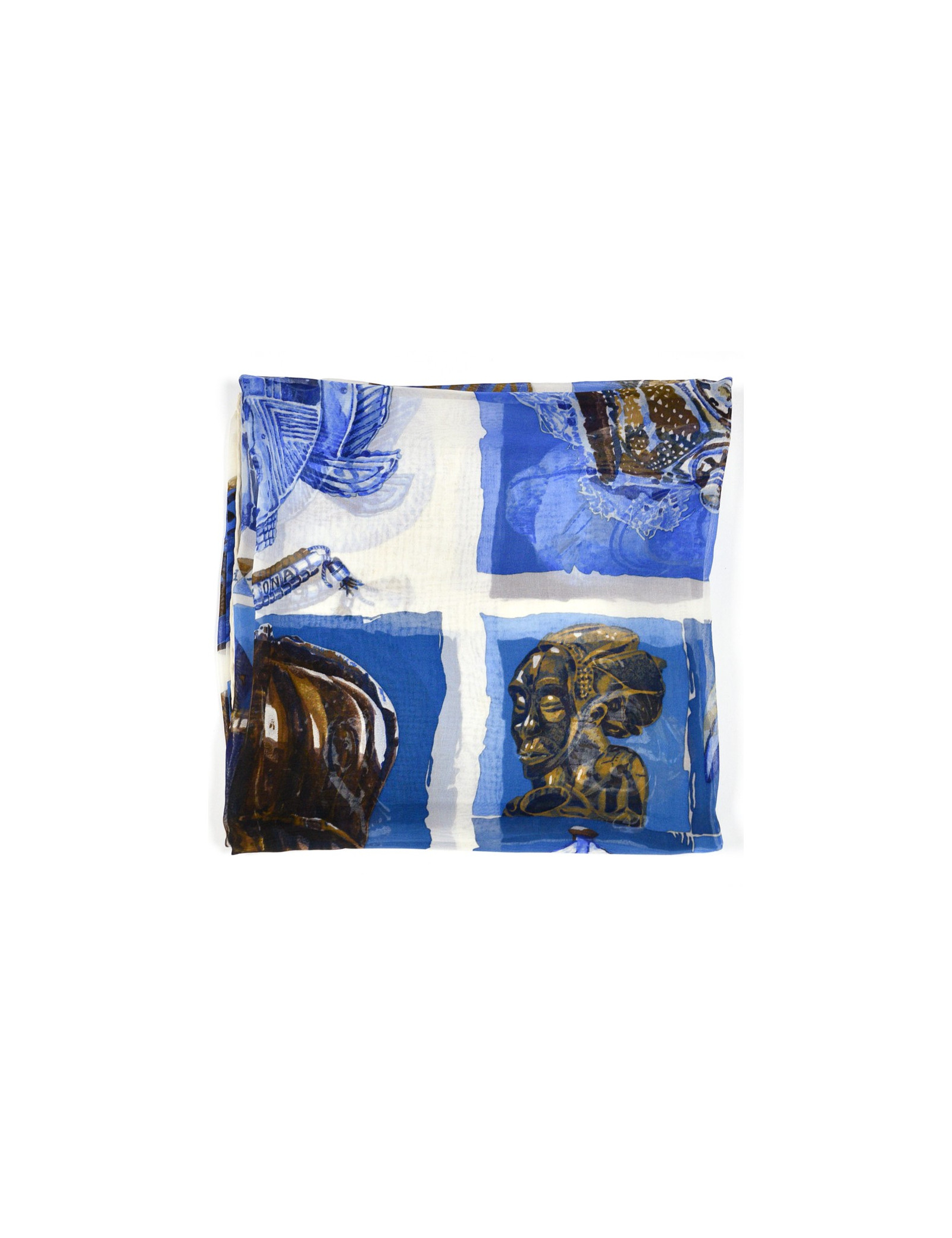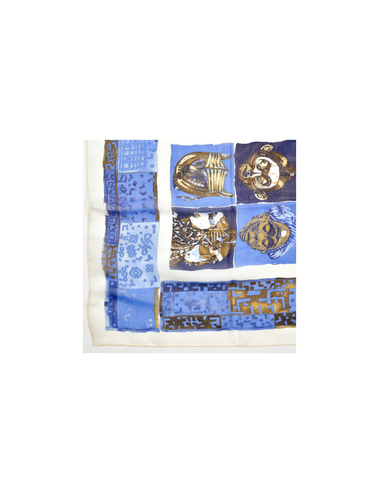 Le carré est de la Maison HERMES. Dessiné par Loic Dubigeon qui l'intitule "Persona" en 1997, il représente des masques tribaux sur fond bleu et marron.