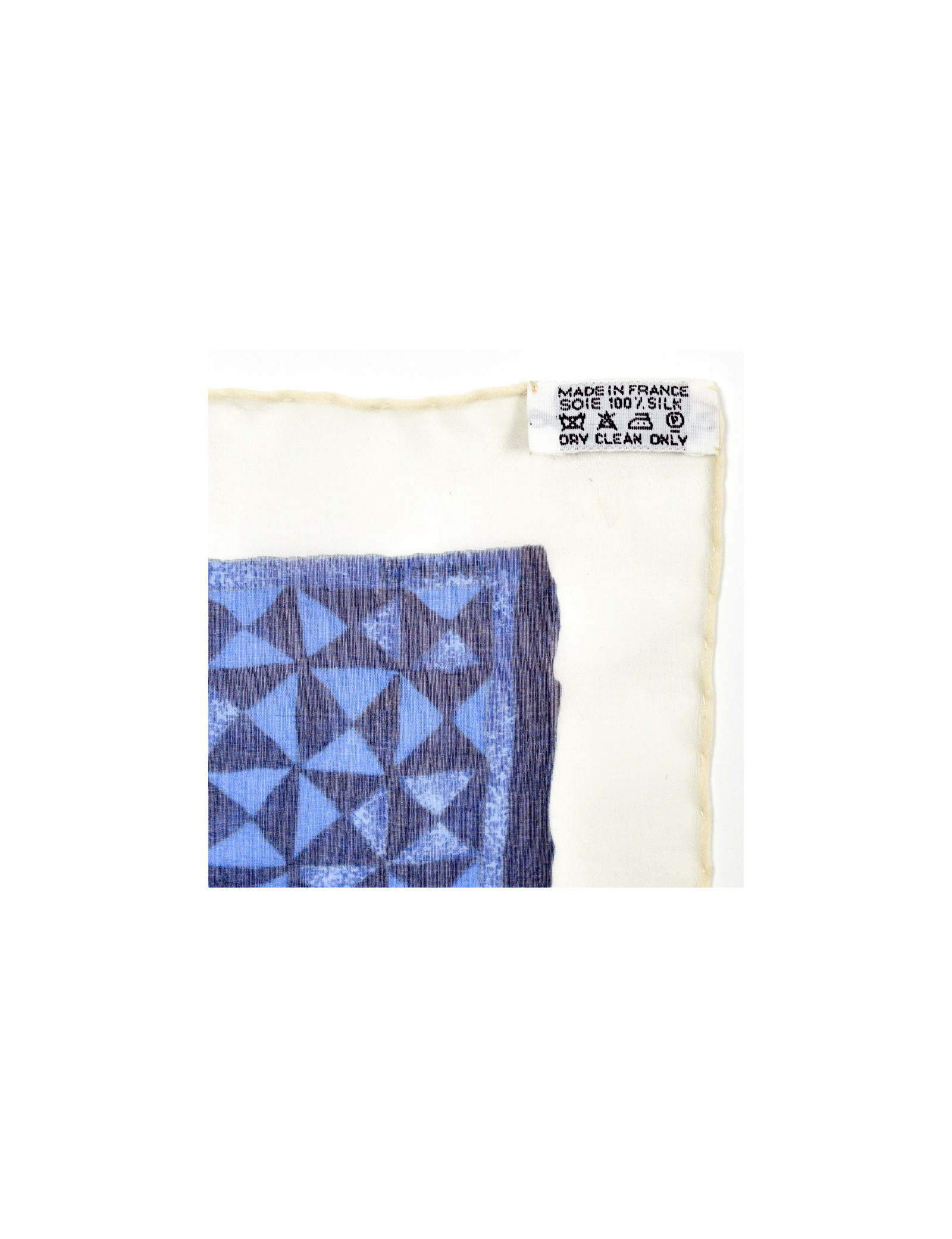 Le carré est en bon état. Seul bémol, une tâche au bas du foulard (cf photo). Autrement le roulotté est impeccable et nous n'observons pas de fil tiré. C'est un carré dont les côtés mesurent 90 centimètres. Présence de l'étiquette matière indiquant qu'il est fait à 100% de soie et qu'il est Made In France.