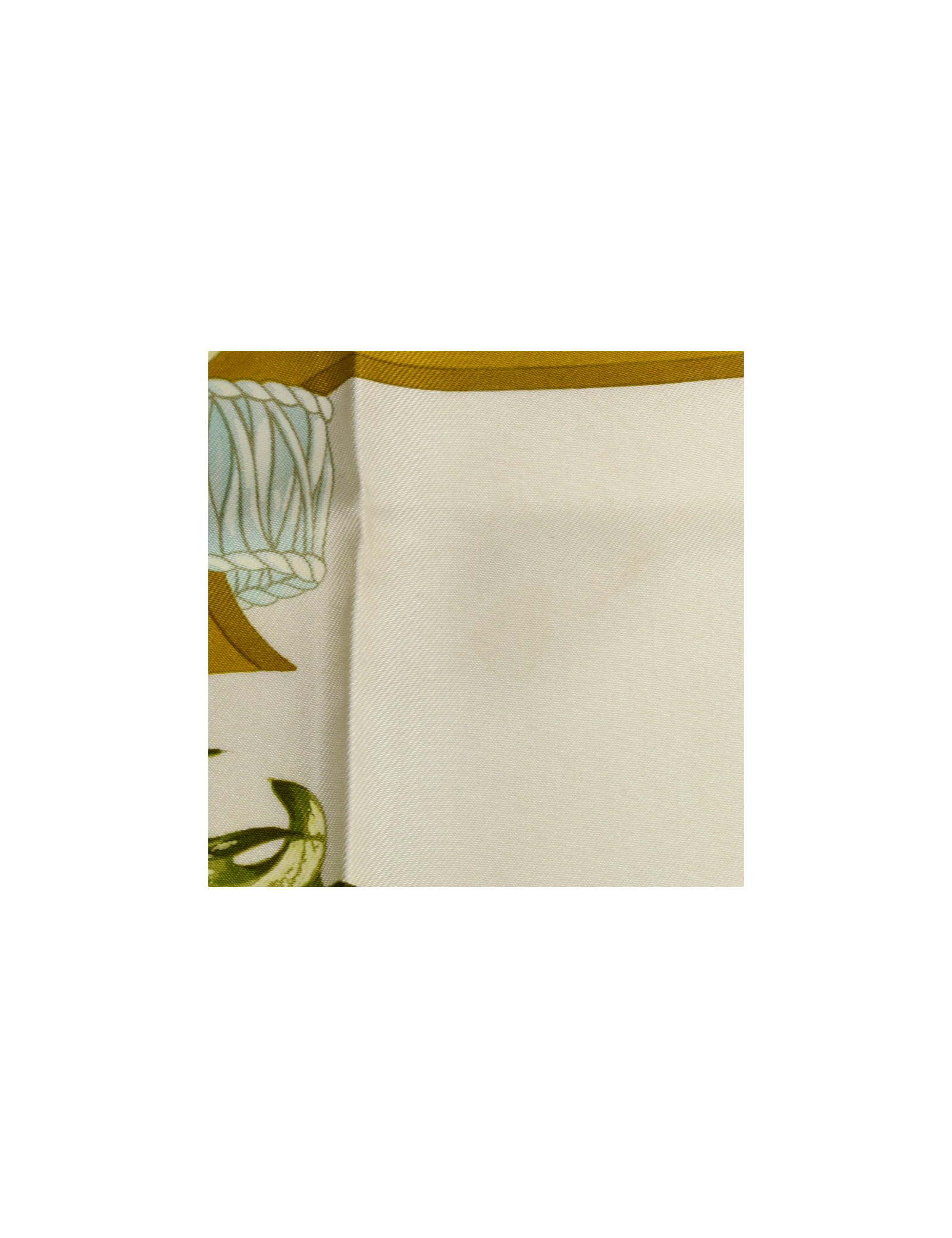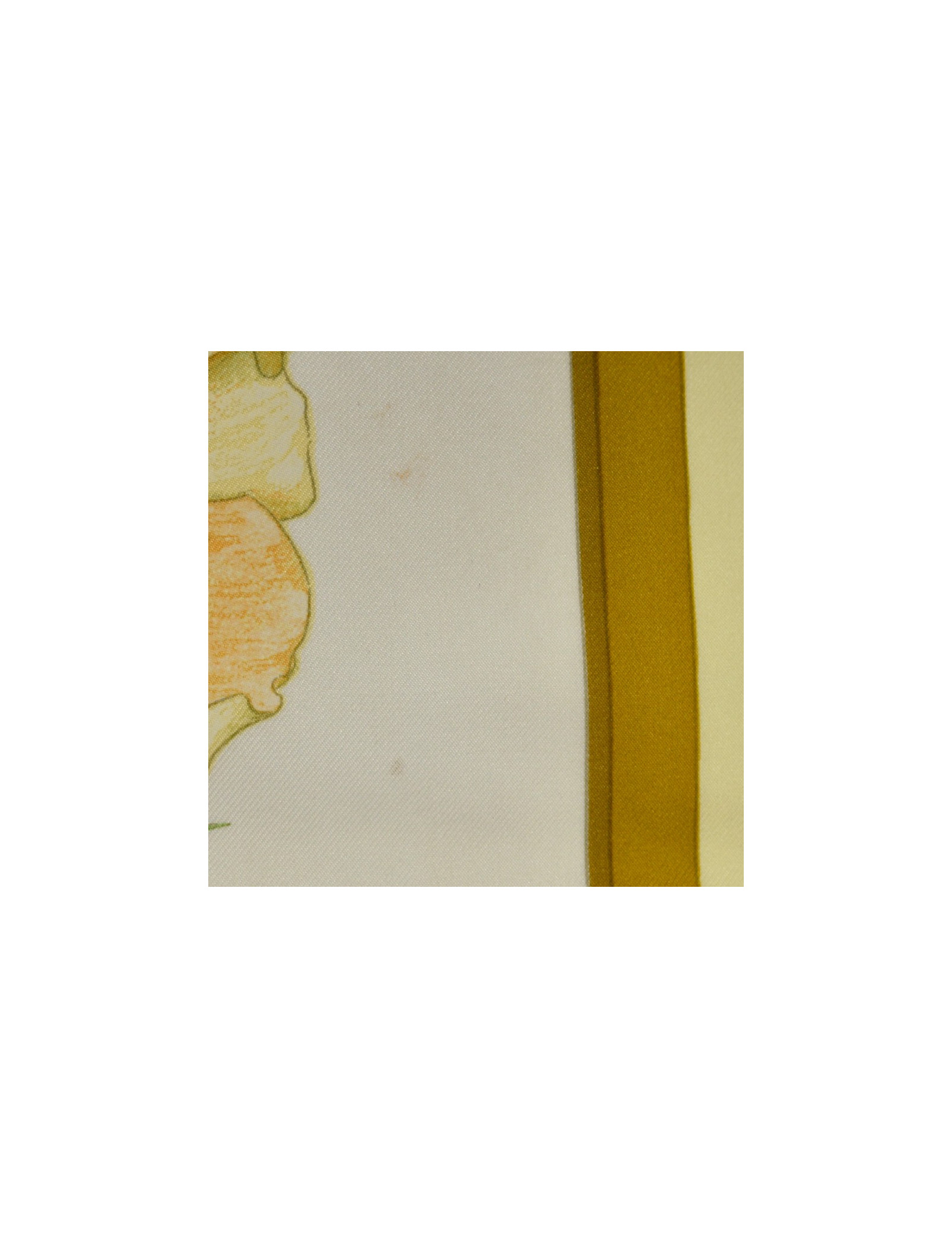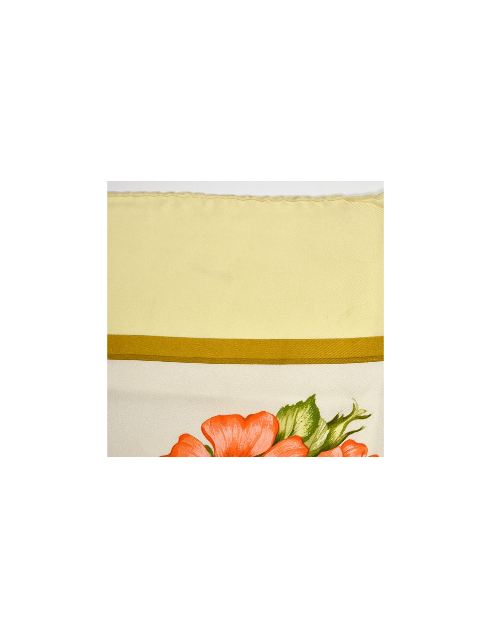 Le foulard et son roulotté sont dans un bon état. Ses couleurs sont toujours aussi éclatantes mais nous relevons la présence d'une auréole sur son encadré, ainsi que deux autres petits points quasi imperceptibles mais présents en haut du bouquet (cf photo). Hormis cet élément, nous ne constatons pas de fil tiré. Le carré a une longueur de 87 centimètres pour une largeur de 88 centimètres. Absence de l'étiquette matière mais nous pouvons constater qu'il se compose à 100% de soie.