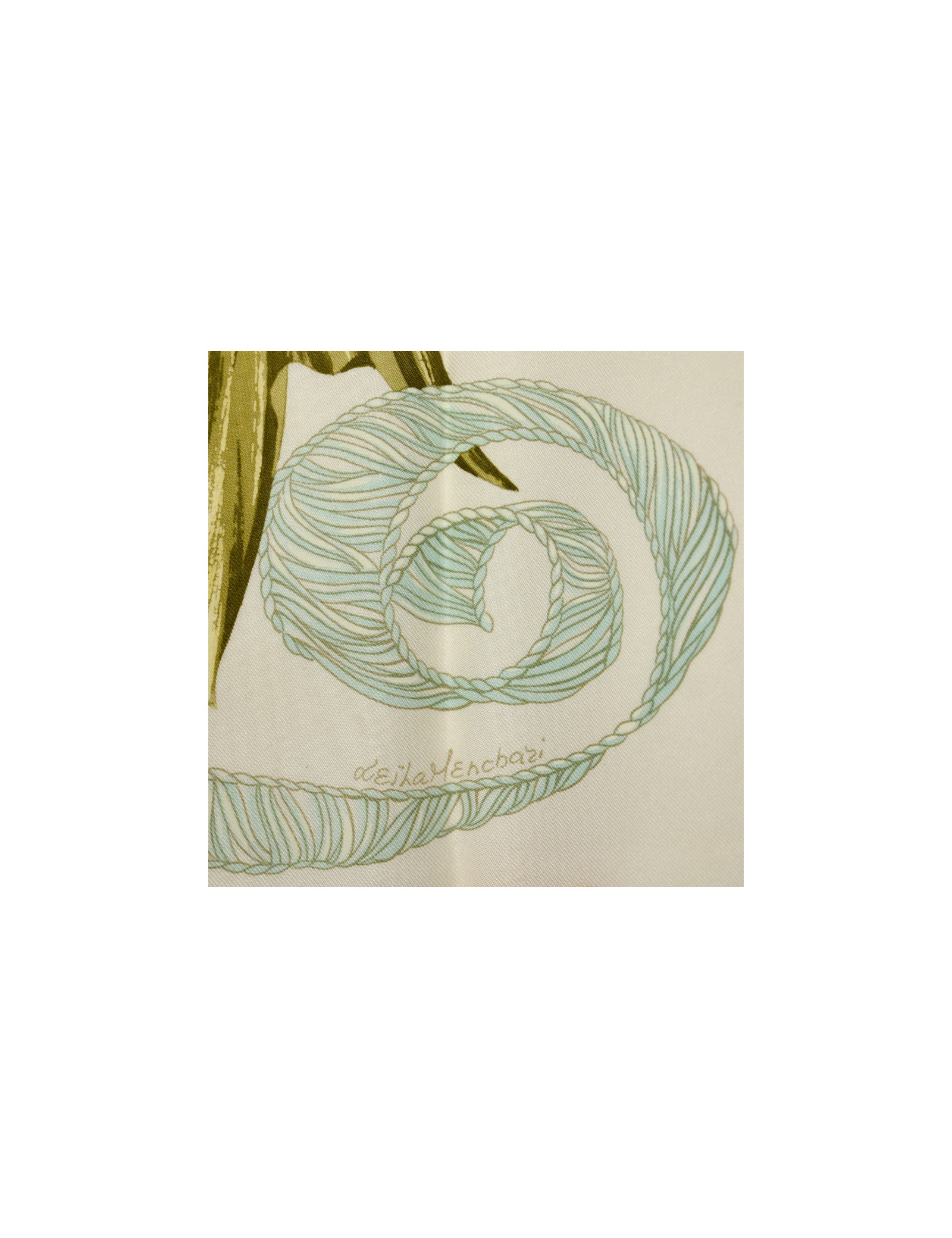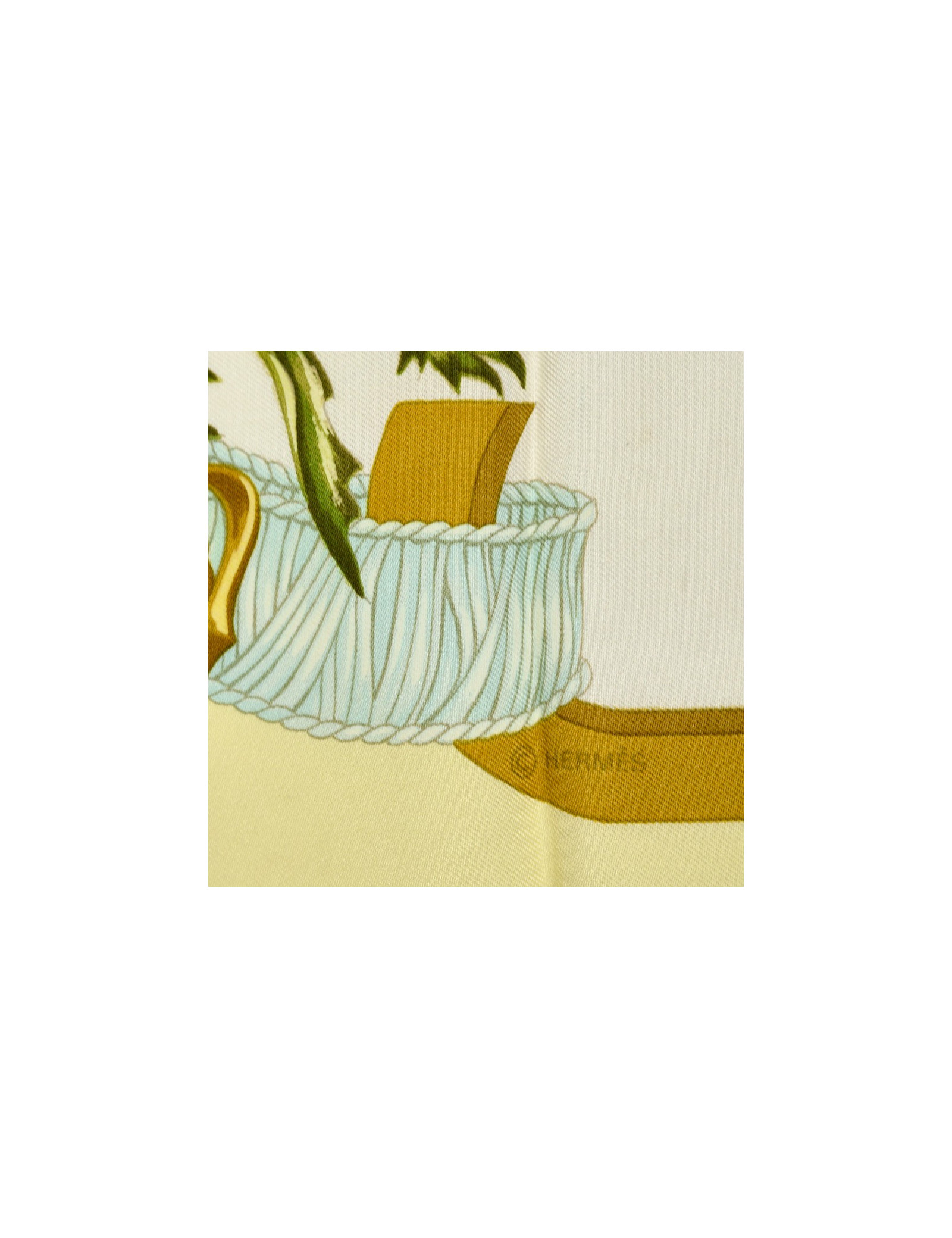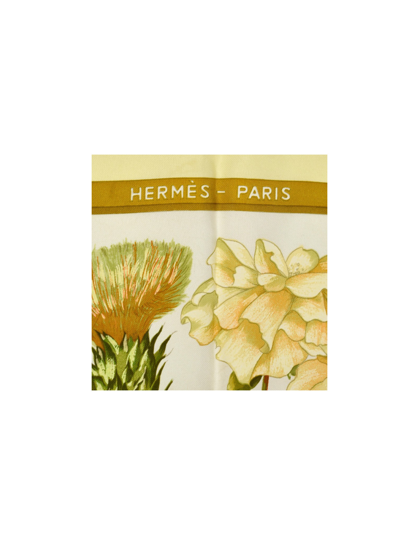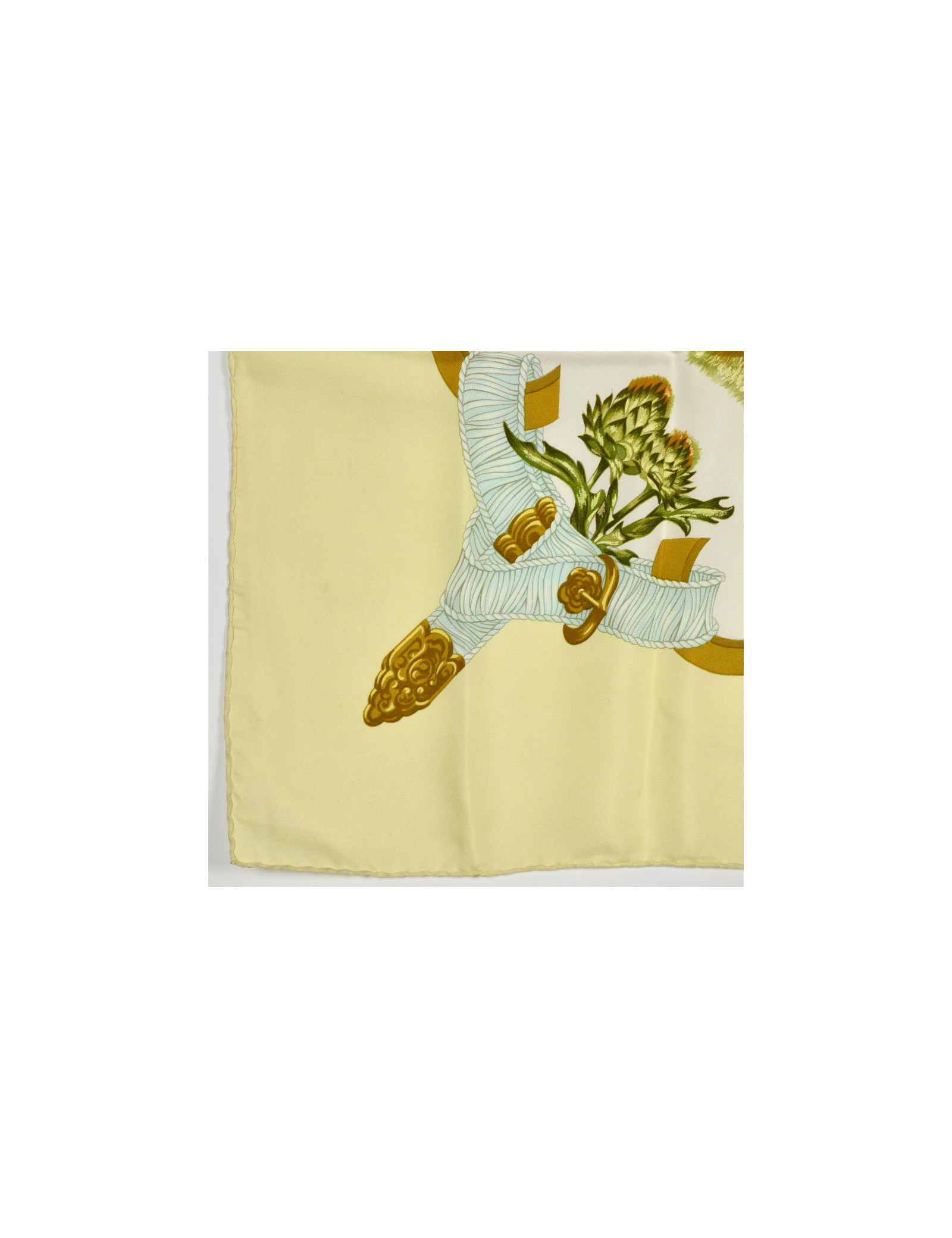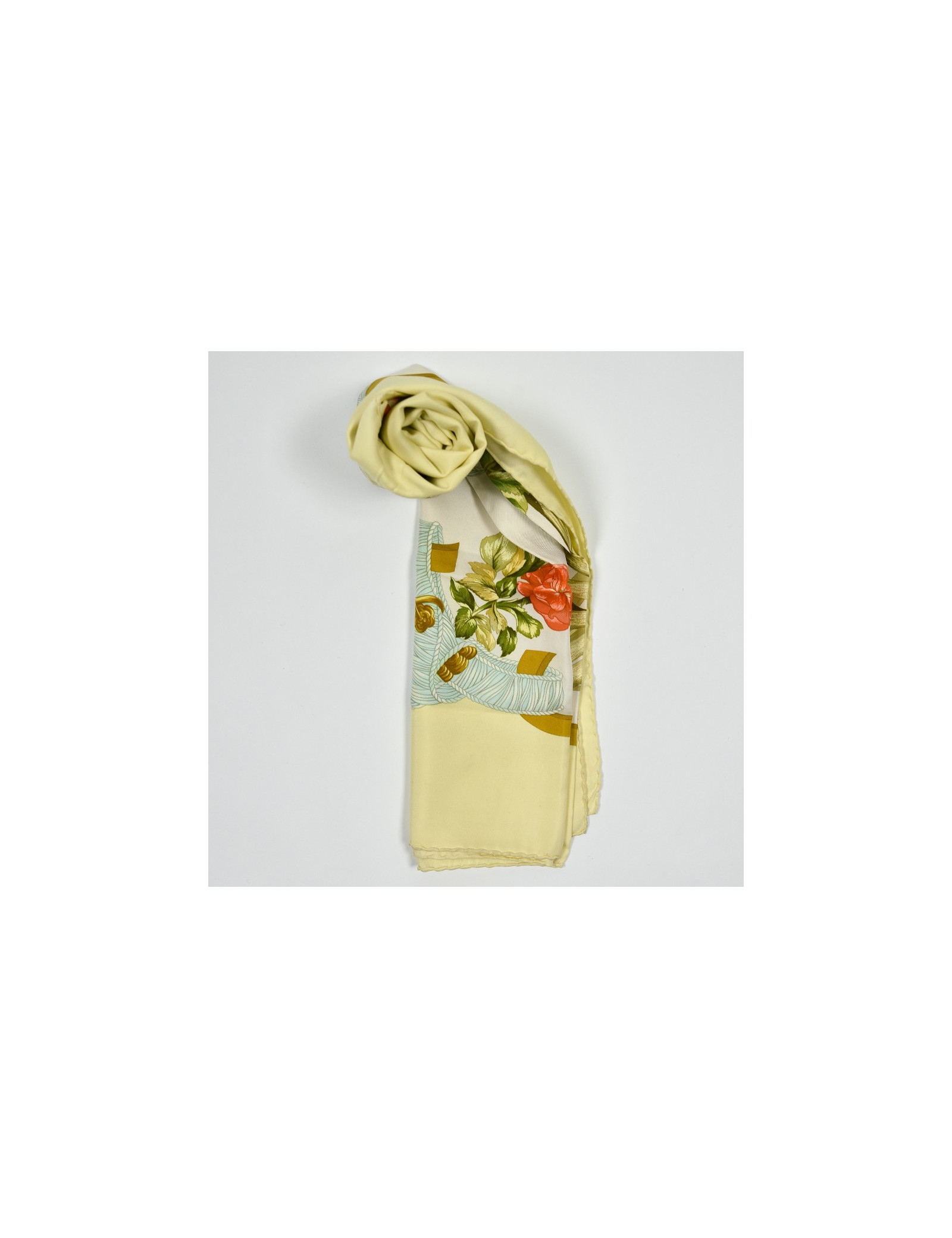 Le foulard est de la Maison HERMÈS. Dessiné par Leïla Menchari en 1972, il se décline ici dans les tons de jaune, vert et orange et présente comme élément central un bouquet de fleurs.