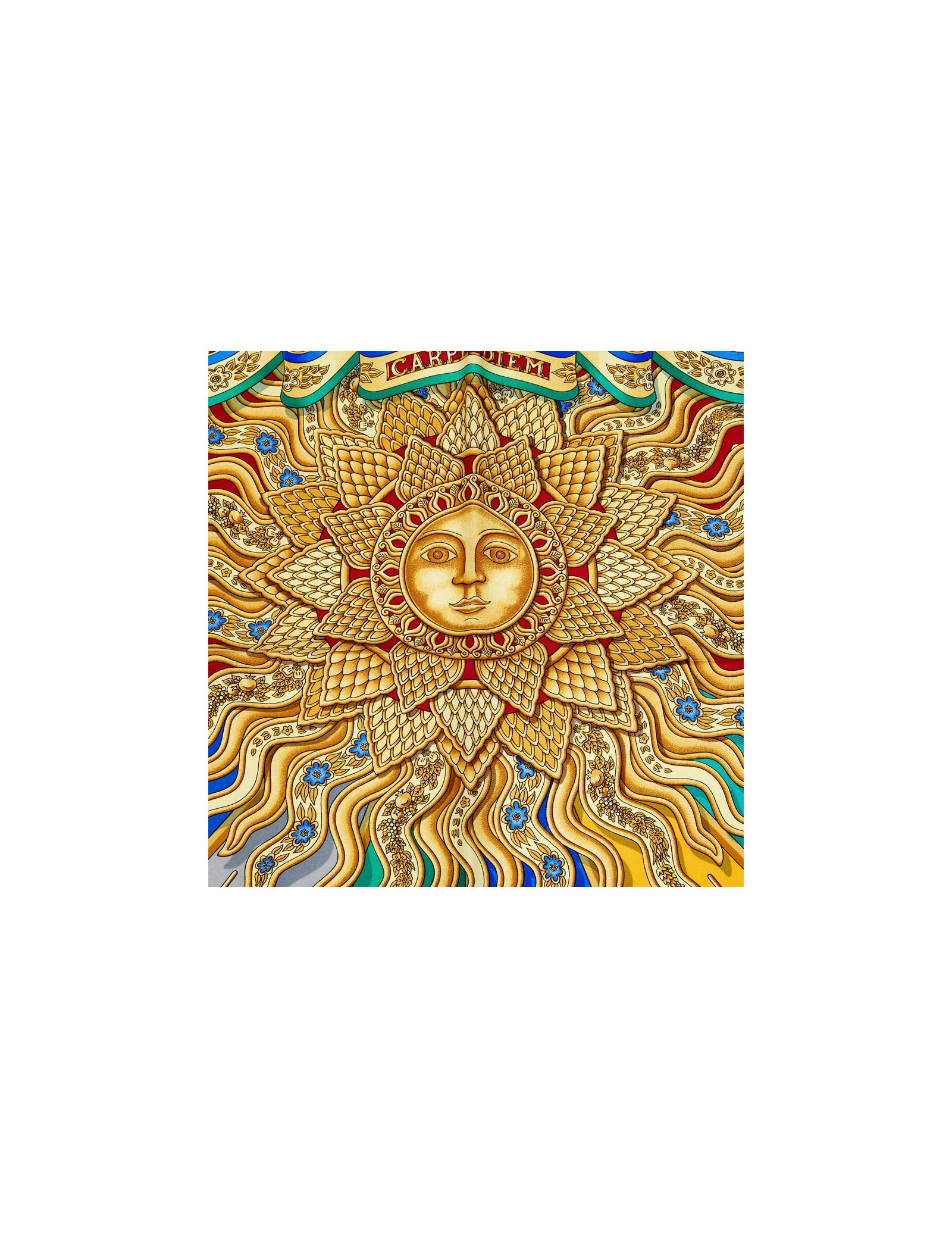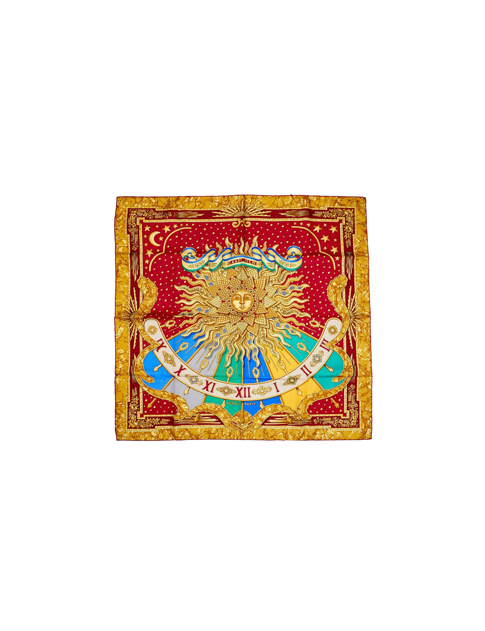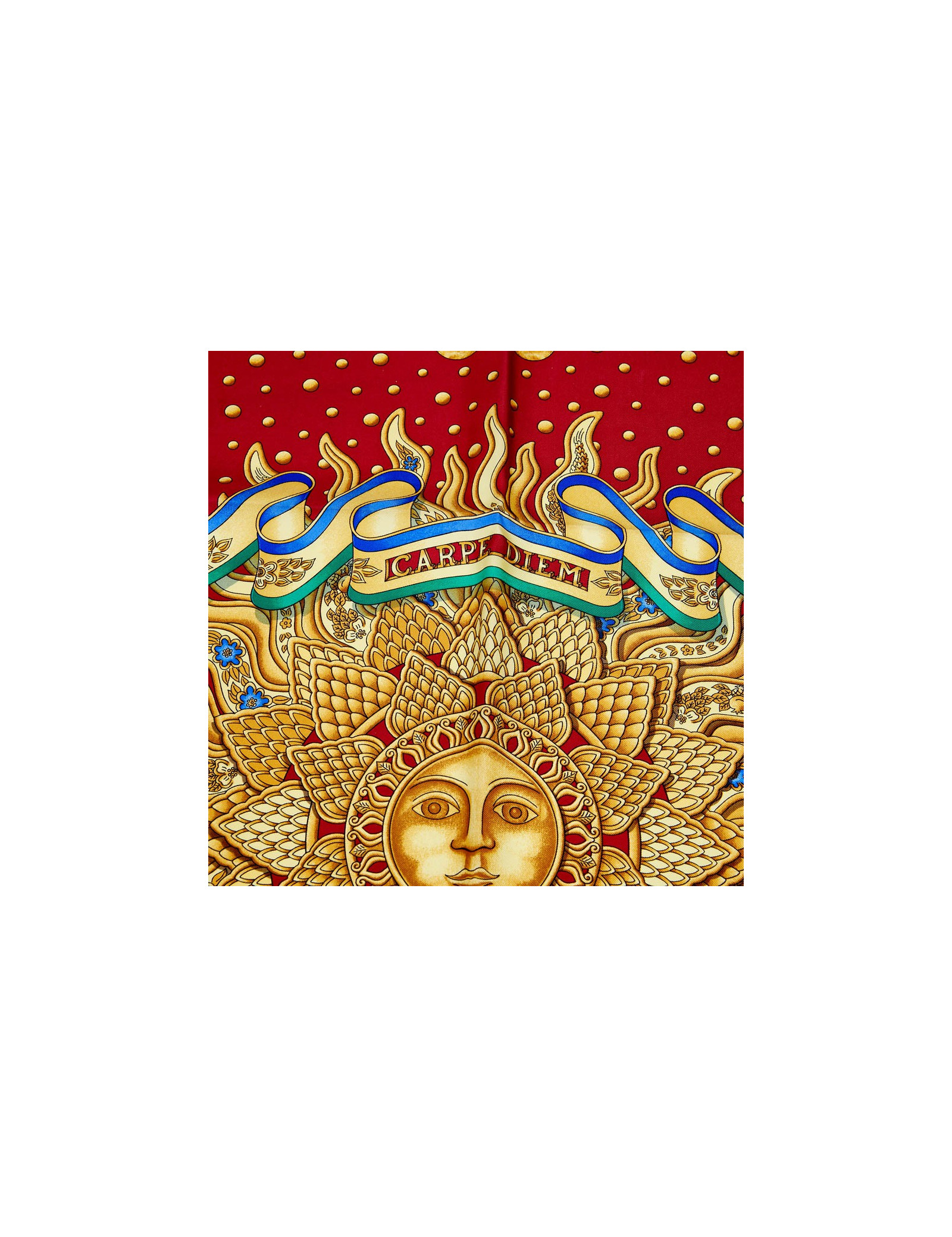 Carré rouloté à la main. Ce carré Hermès réalisé par Joachim Metz, est de couleur or et bordeaux. Le sujet a été emprunté au poème d'Horace. C'est un hommage au cadran solaire. Le premier carré Carpe Diem a été créé en 1994 et réédité en 1997.