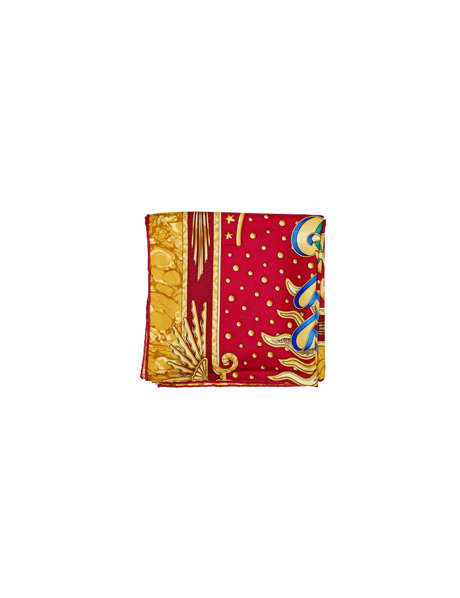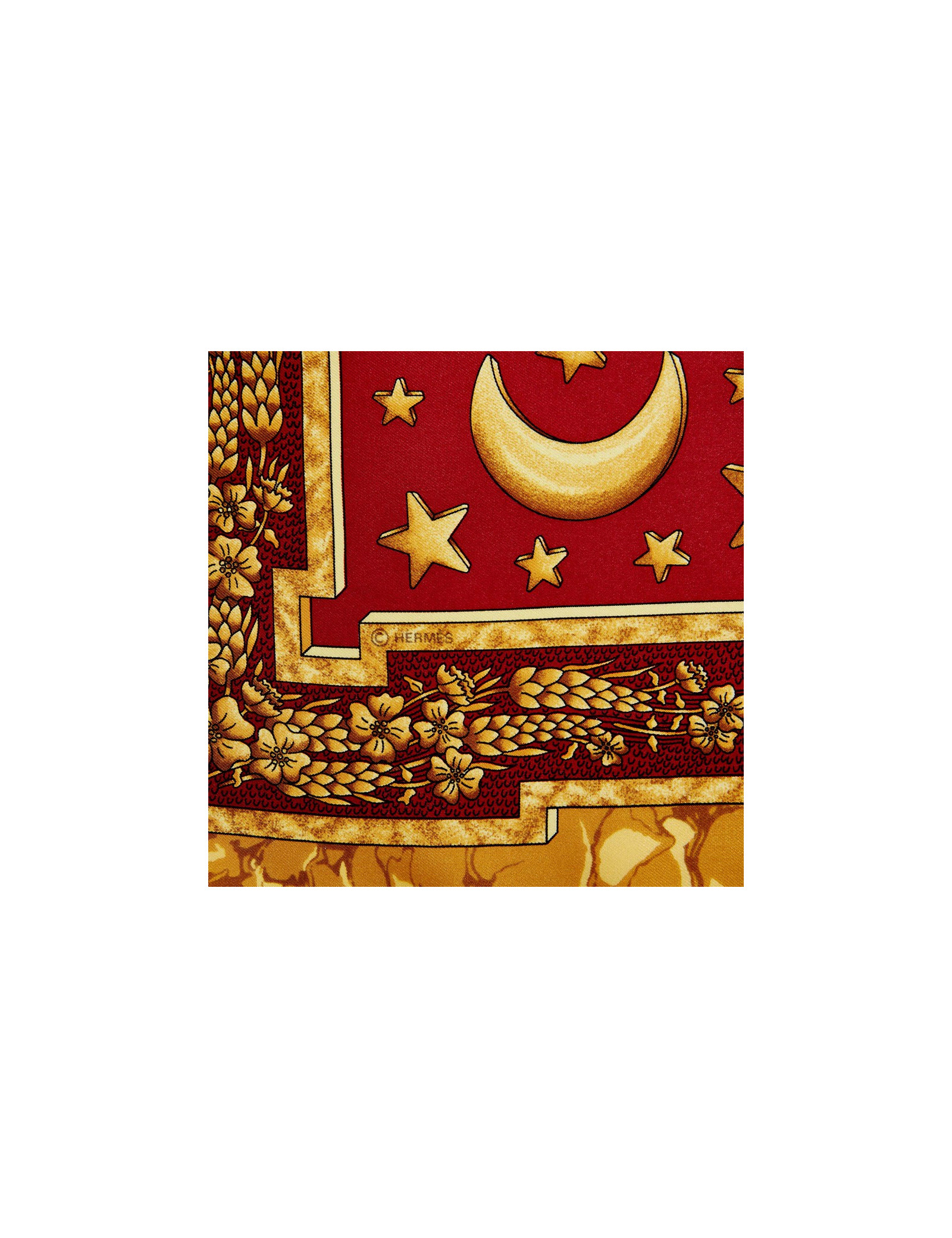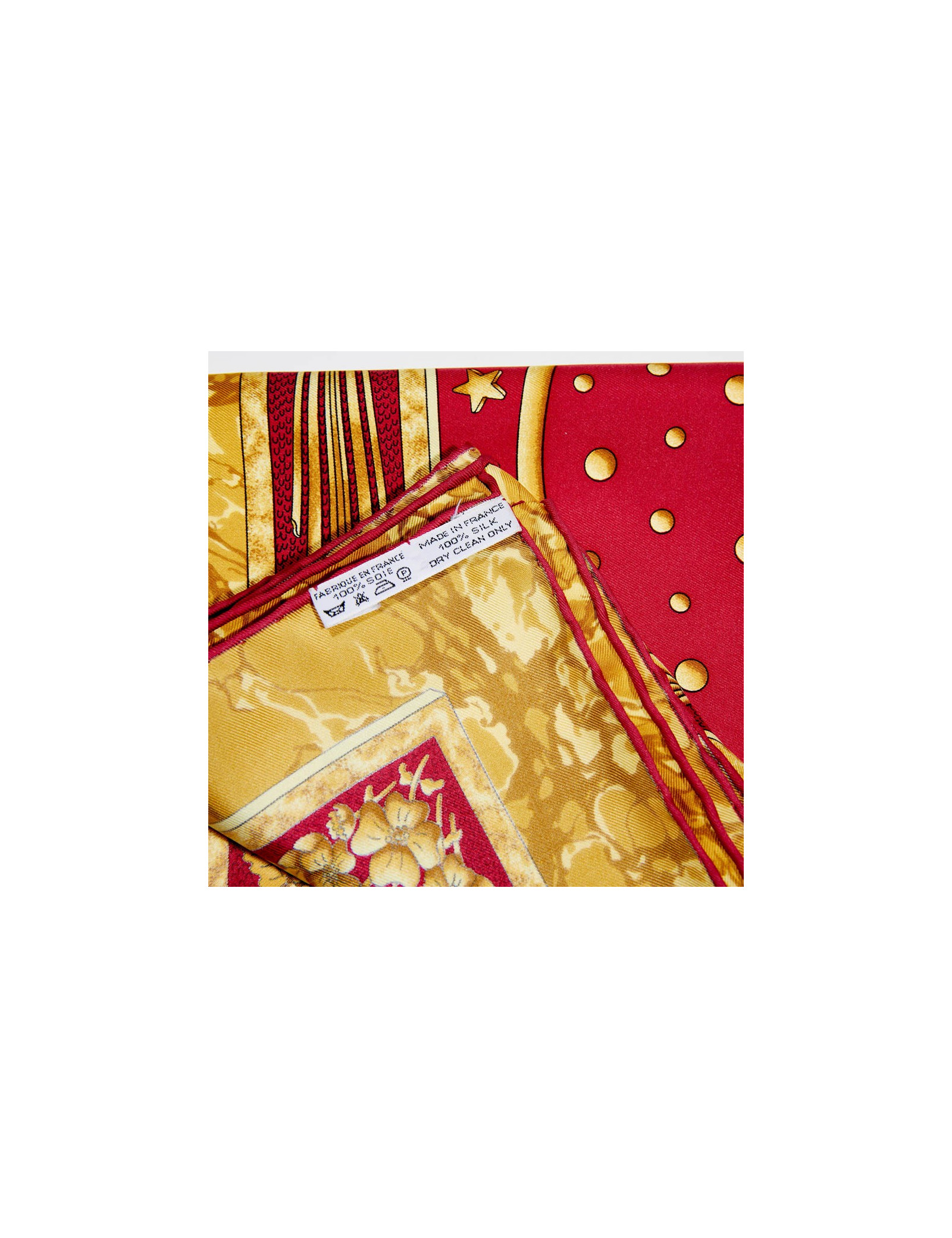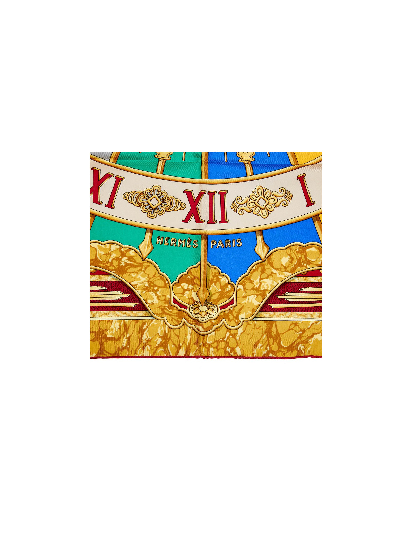 Carré rouloté à la main. Ce carré Hermès réalisé par Joachim Metz, est de couleur or et bordeaux. Le sujet a été emprunté au poème d'Horace. C'est un hommage au cadran solaire. Le premier carré Carpe Diem a été créé en 1994 et réédité en 1997.