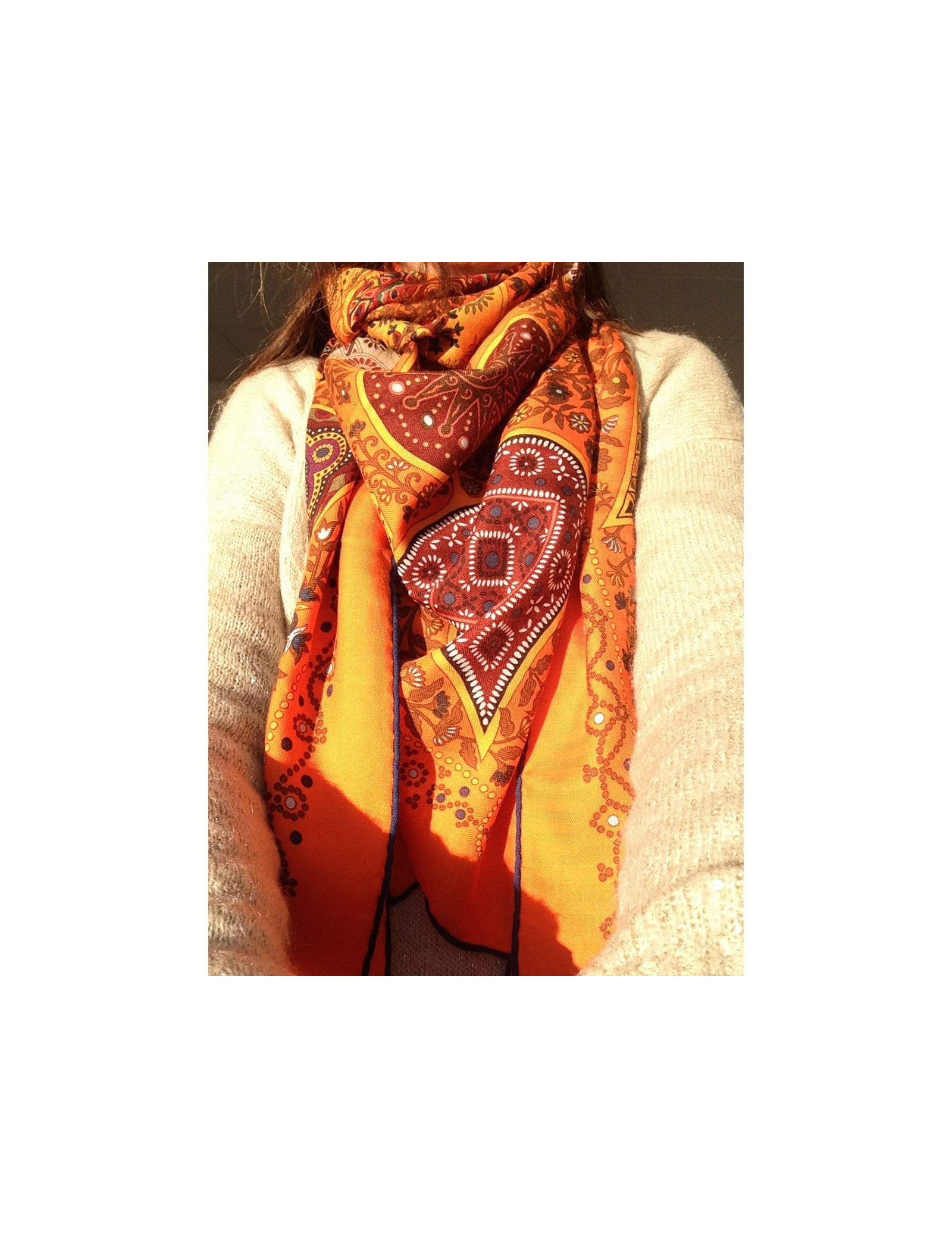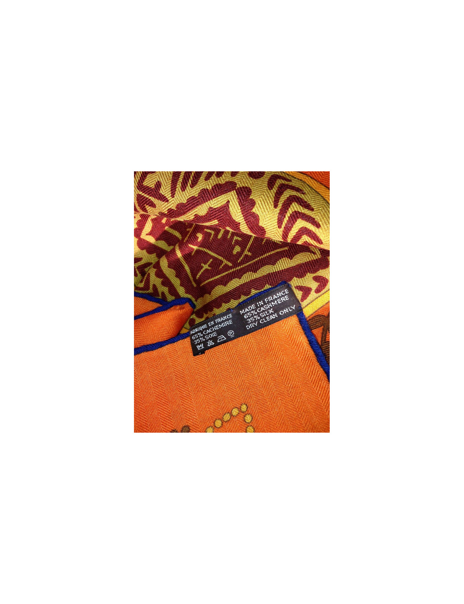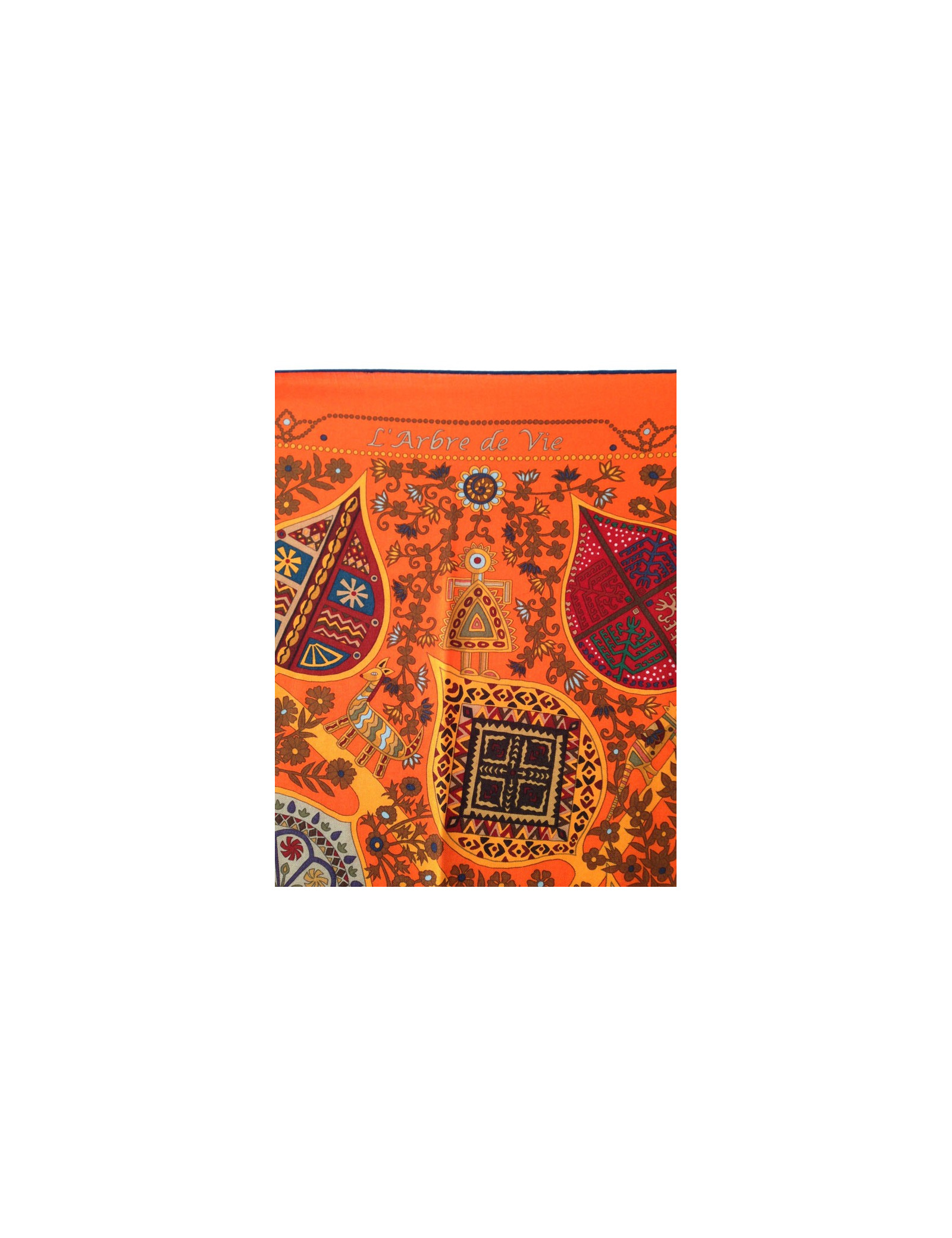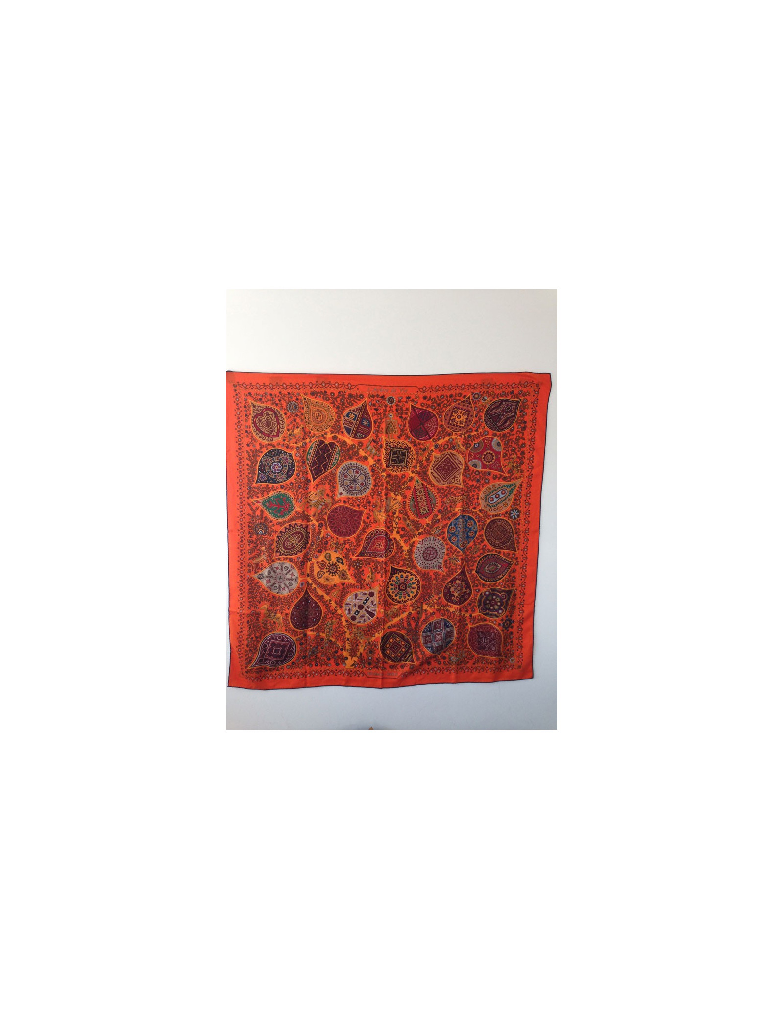 Superbe étole en cachemire et soie Hermes, modèle "Arbre de vie", dans des teintes rouge oranger jamais porté. Cette magnifique étole aux teintes chatoyantes forme un magnifique tableau, comme Hermes sait si bien les faire, ce modèle à vraiment notre préférence.