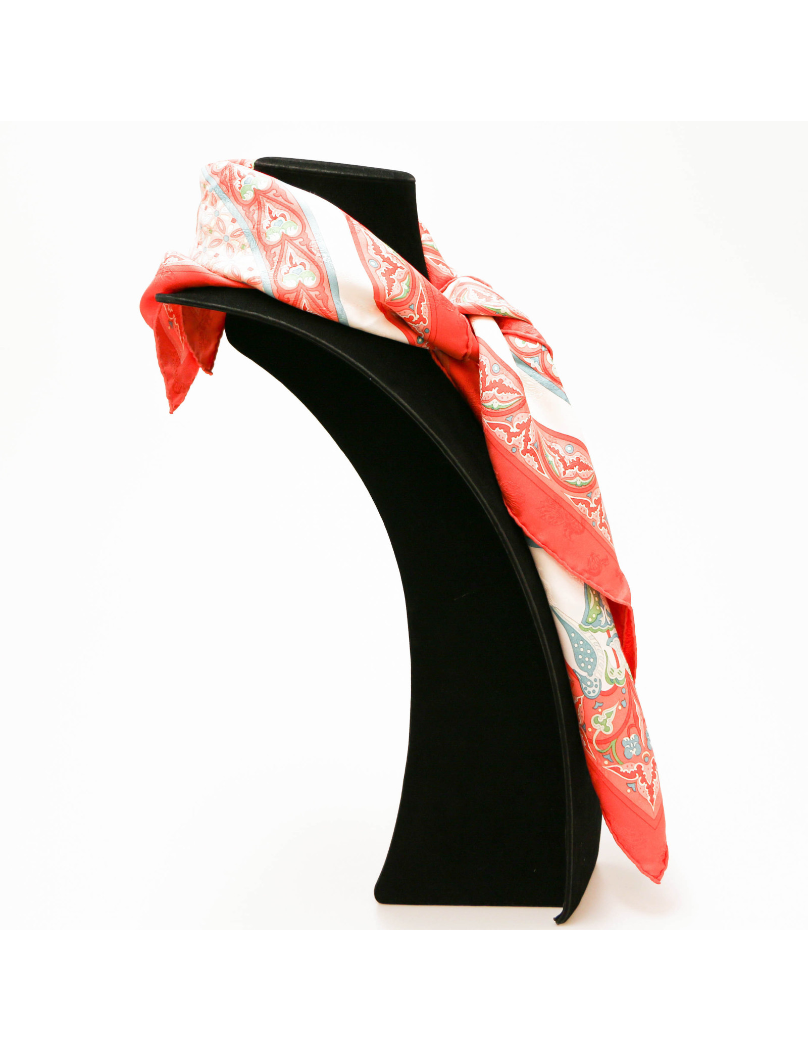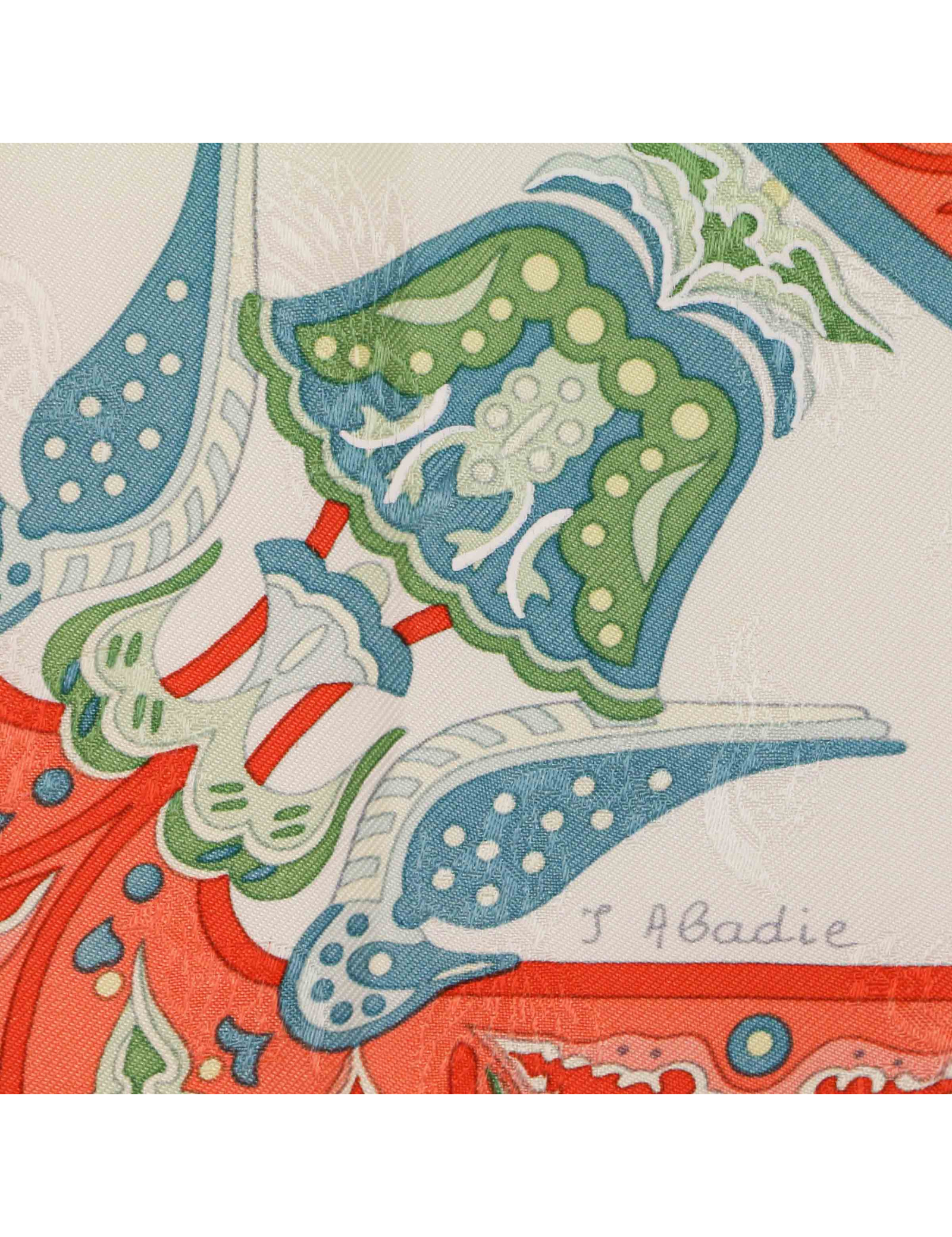 Détails : Absence d'étiquette de composition. Bords roulottés en très bon état, pas de fil tiré. En soie brochée de paons. Ce carré est très rare car Hermès a peu souvent utilisé la soie brochée sur ses carrés. De plus, ce modèle n'a jamais été ré édité.