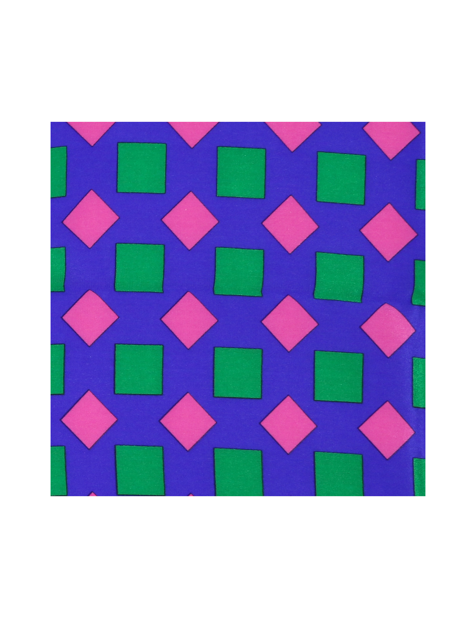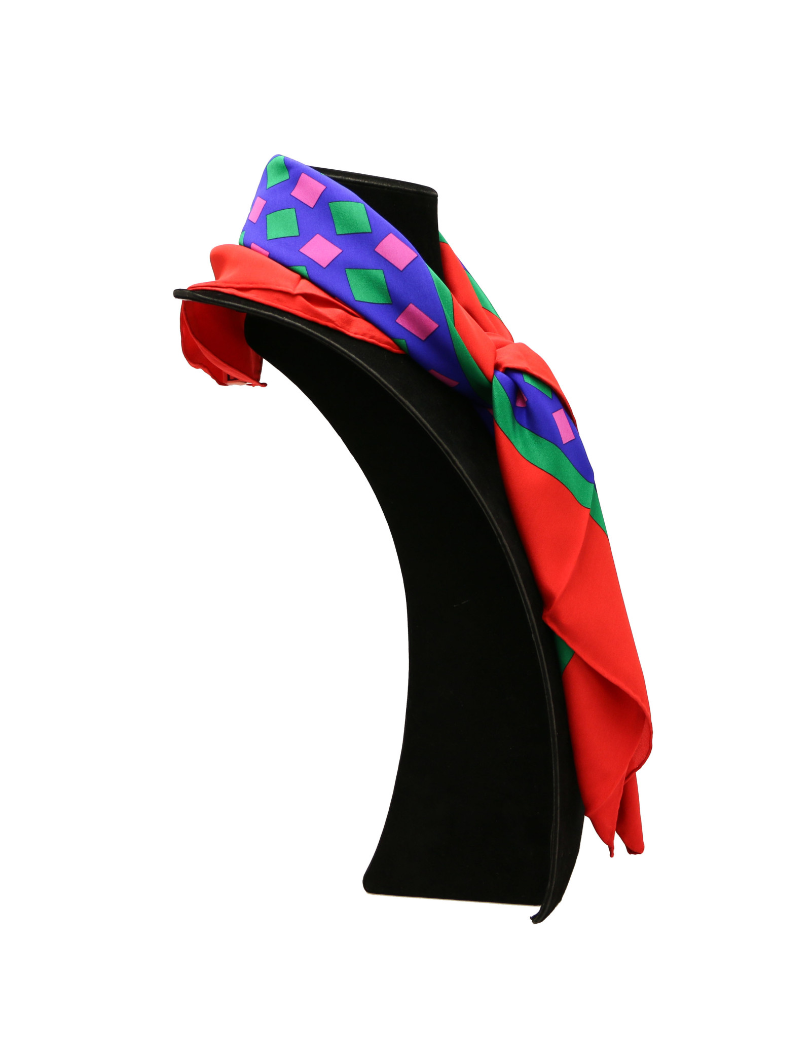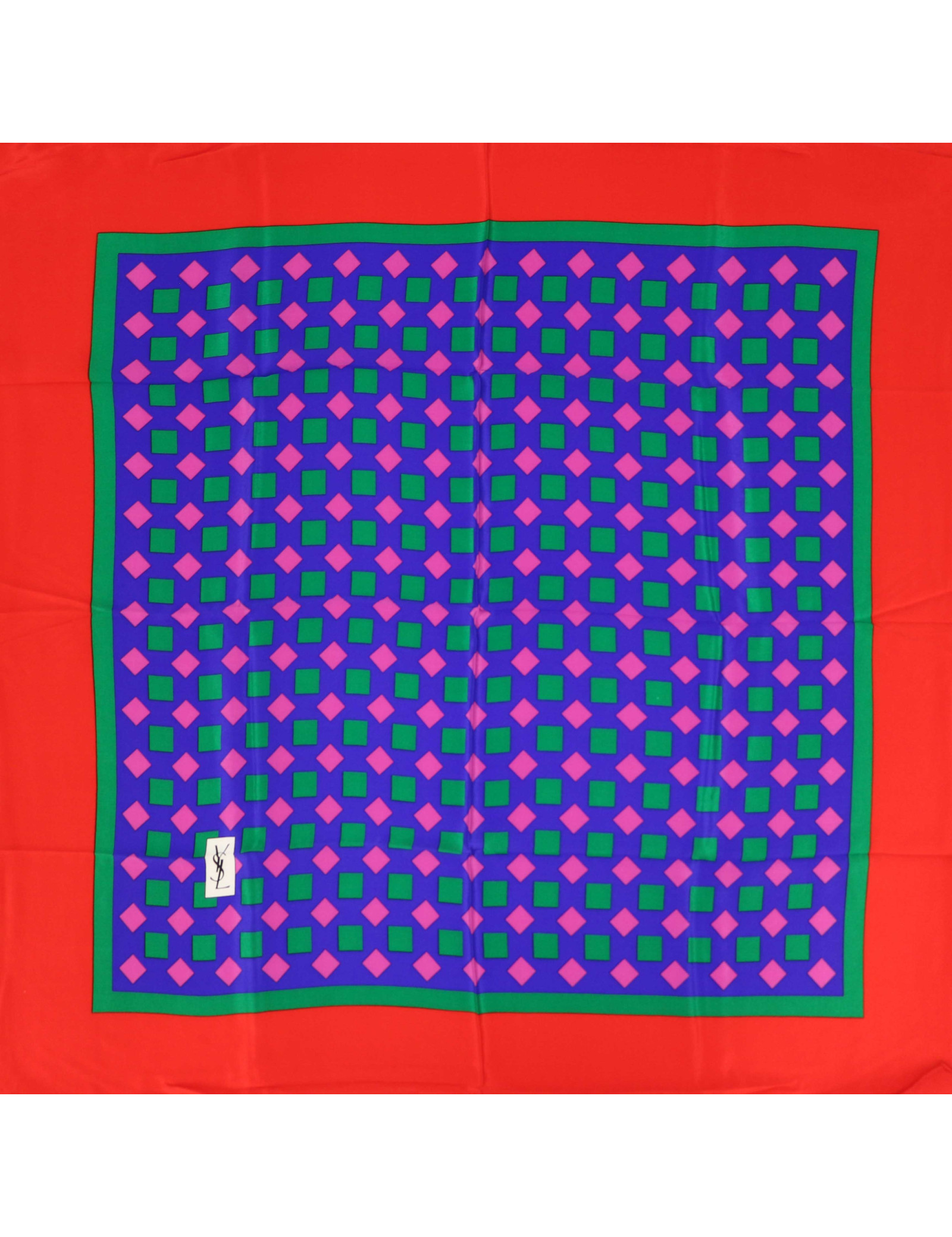 Détails : imprimé avec des formes géométriques carrées de couleur vert et rose, bordure rouge. Etiquette de composition, signature YSL sur l'avant du foulard.