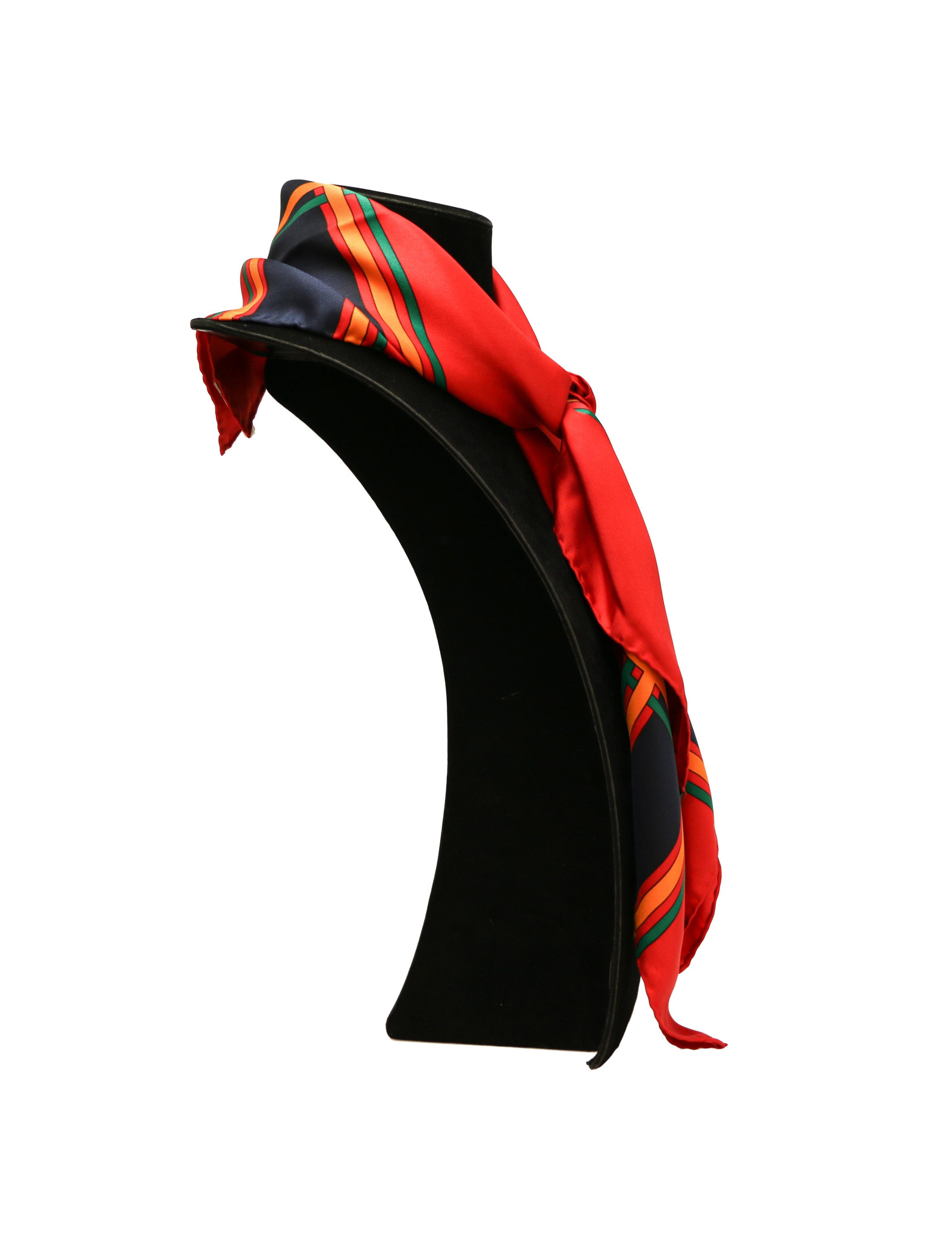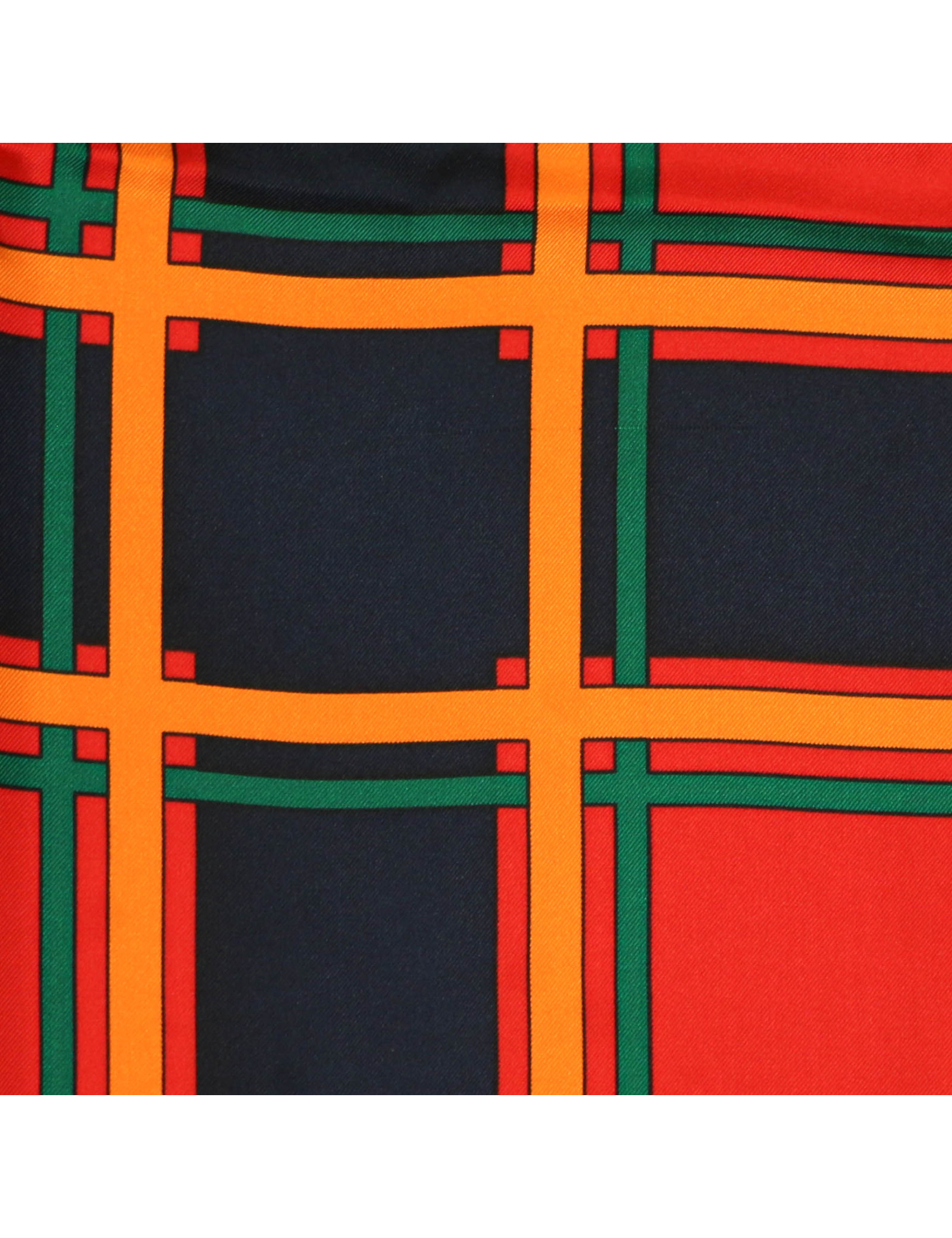 Détails : imprimé avec des lignes géométriques vertes, oranges et bleues. Etiquette de composition, signature YSL sur l'avant du foulard.