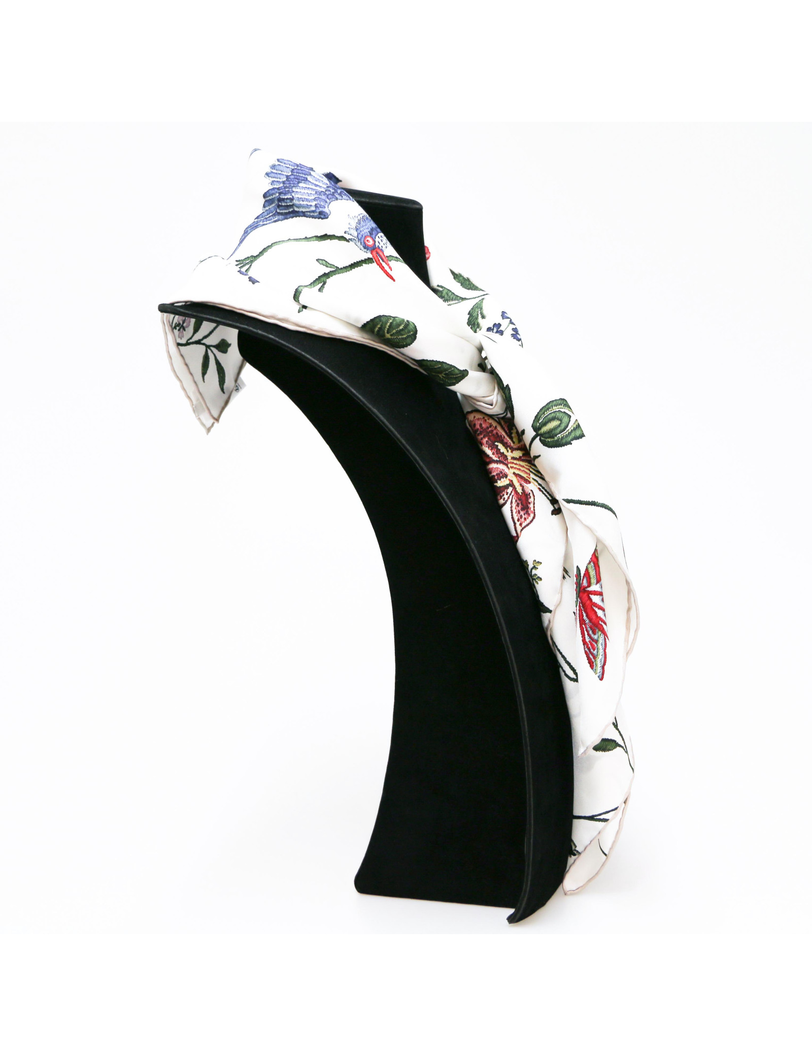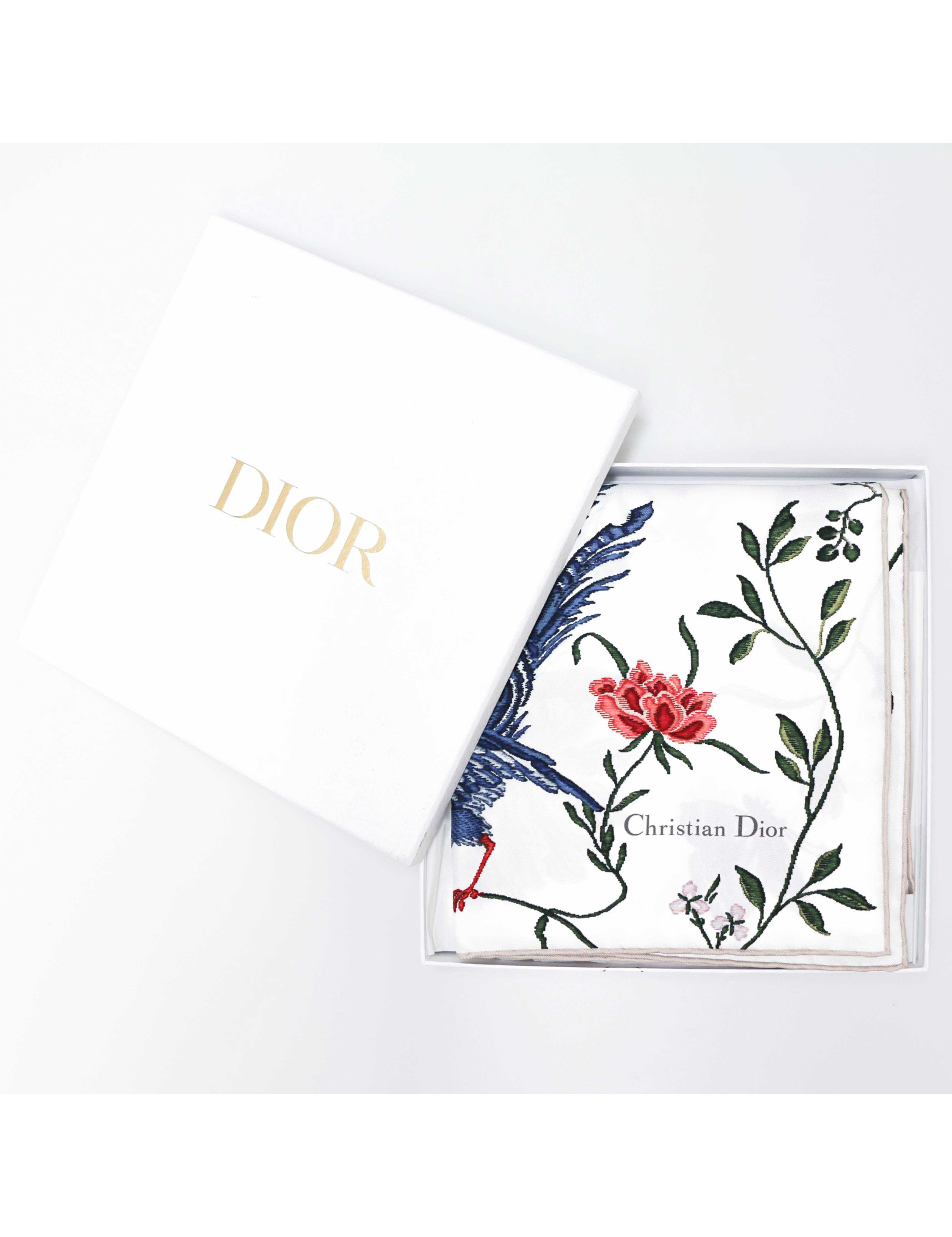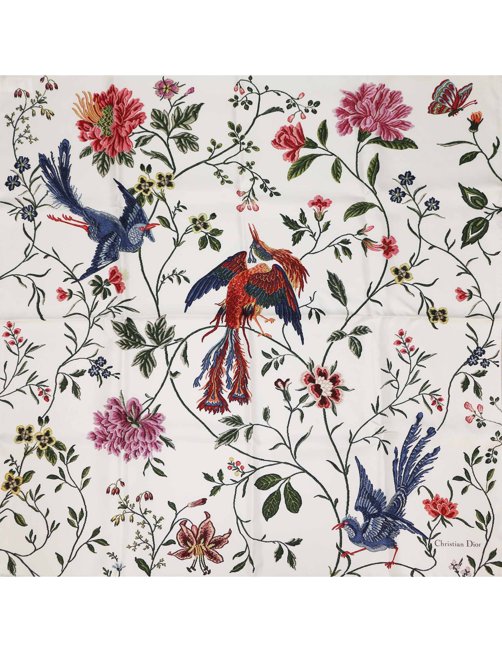 Détails : étiquette de composition toujours présente.Le roulotté est en très bon état, il n'y a pas de tâche ou de fil tiré. Fond blanc avec imprimé multicolore fleurs et oiseaux. Bord contrastant beige et signature Christian Dior en bas à droite du foulard.