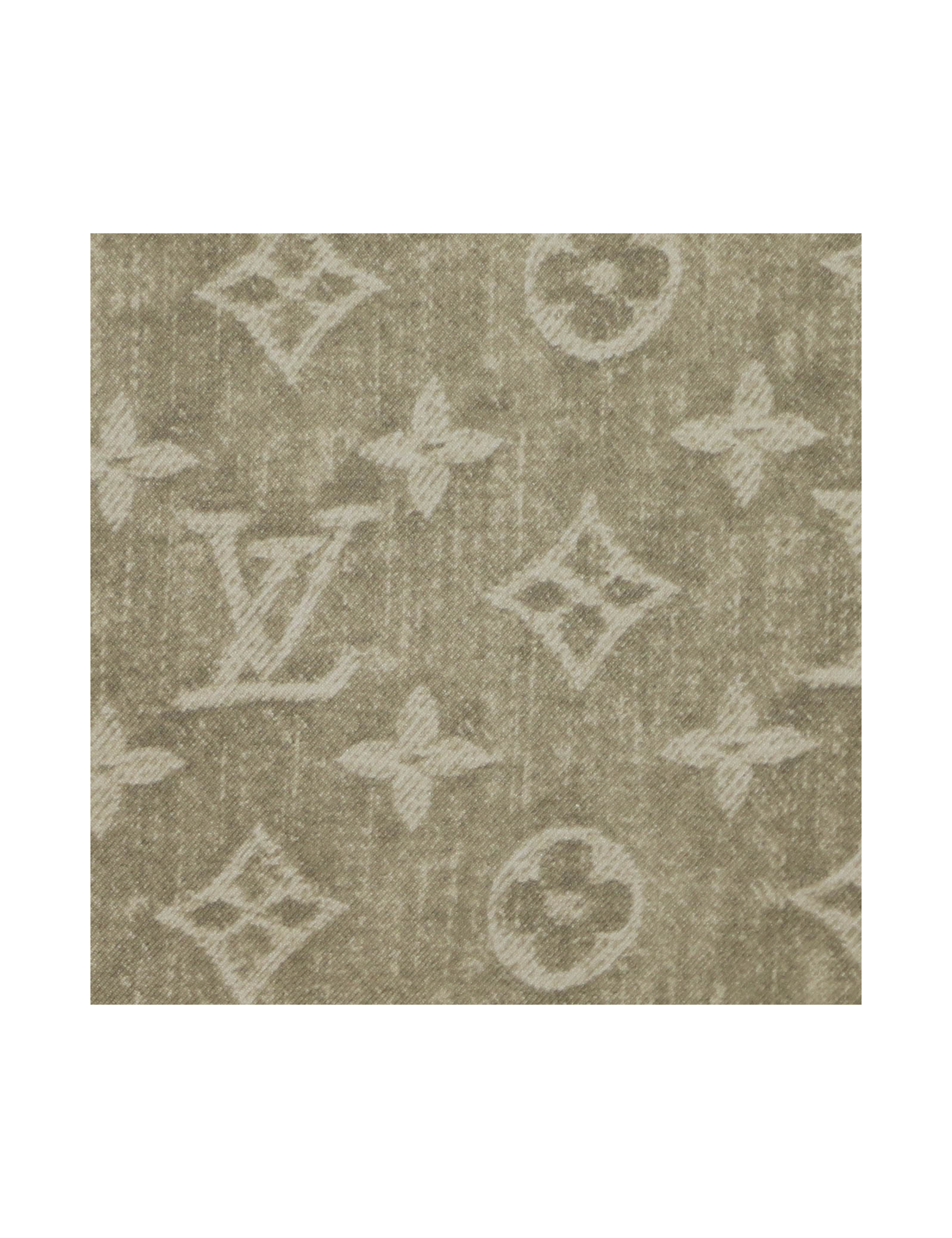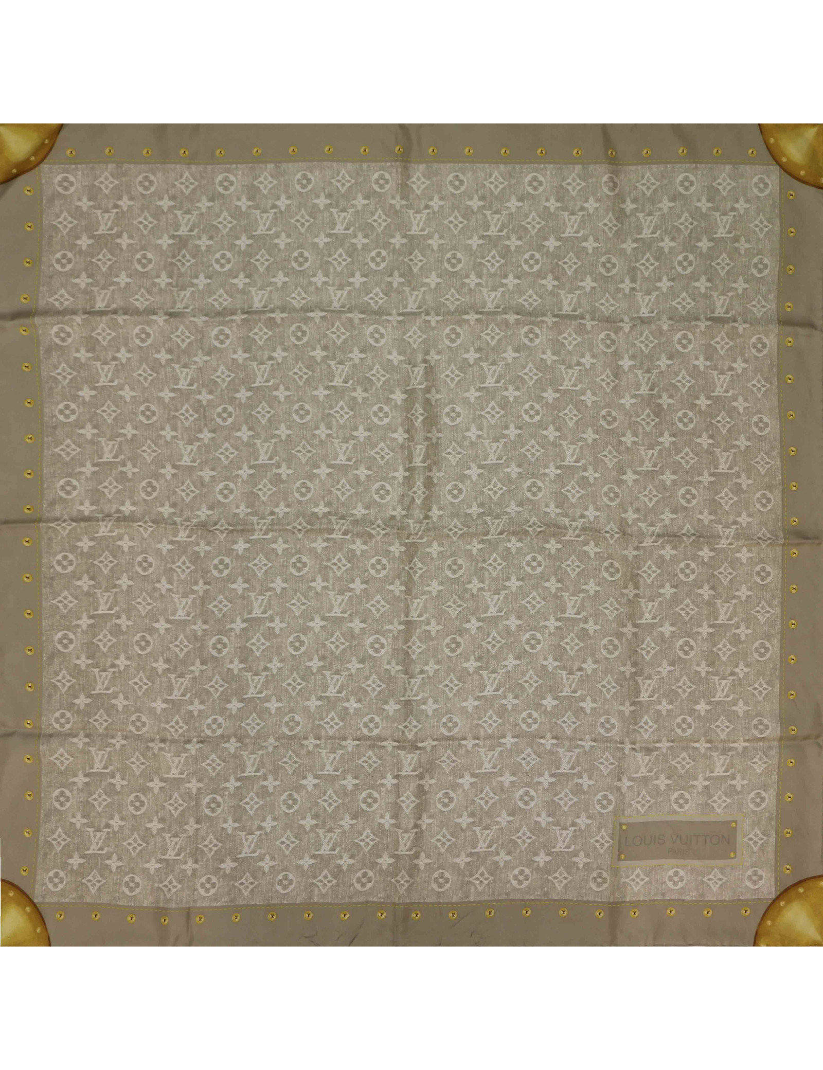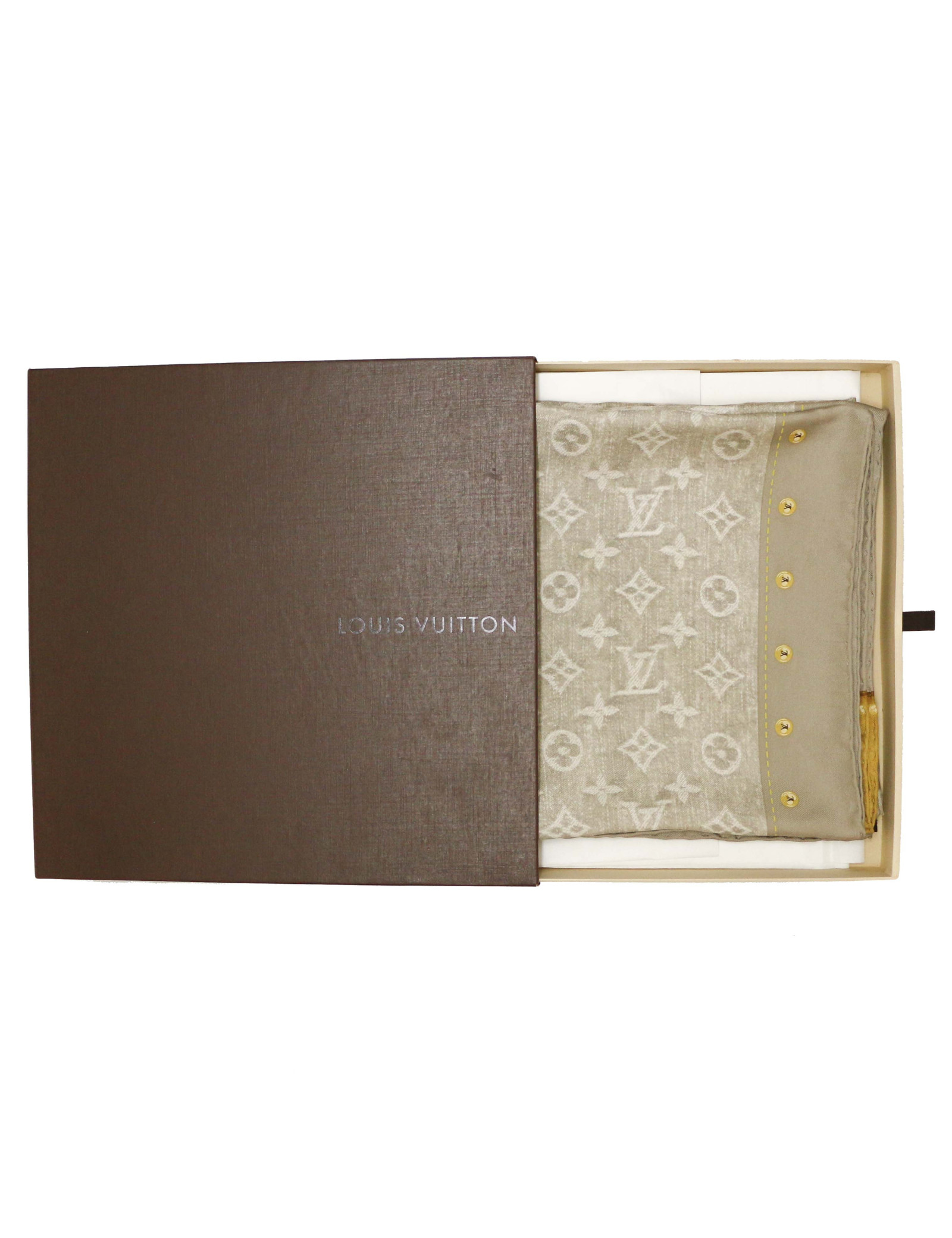 Détails : étiquette de composition toujours présente, signature Louis Vuitton. Imprimé Monogram gris et détails dorés sur les coins du foulard.