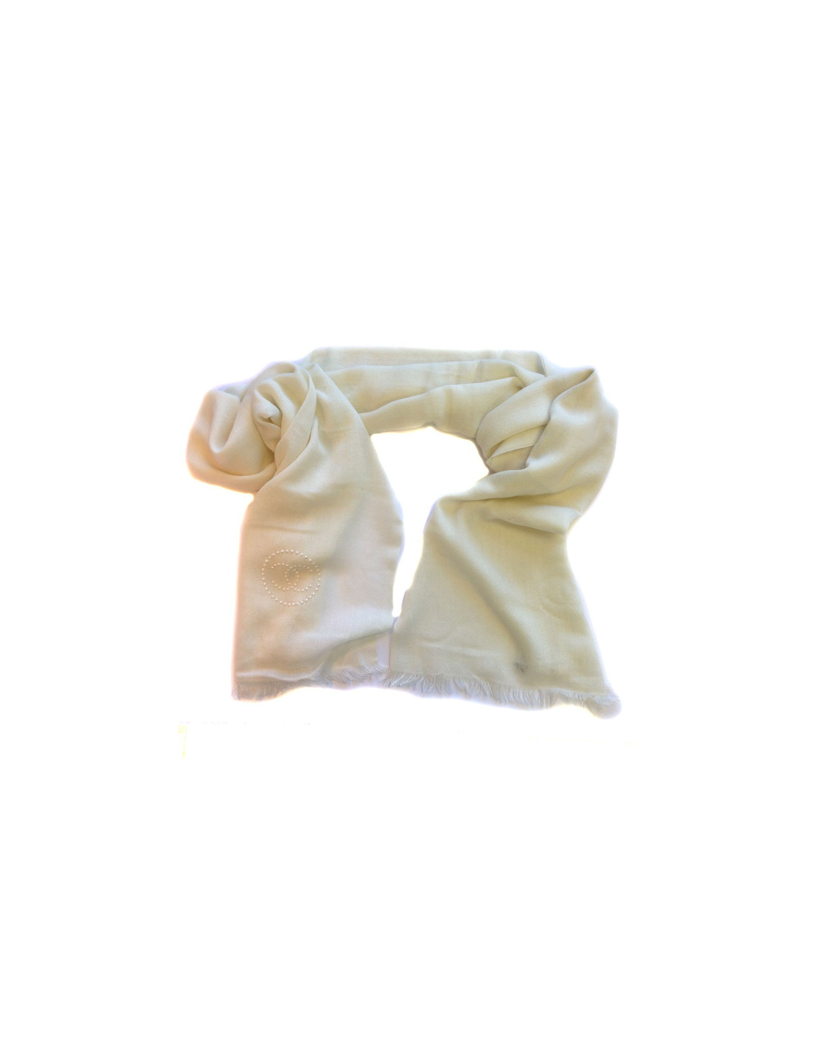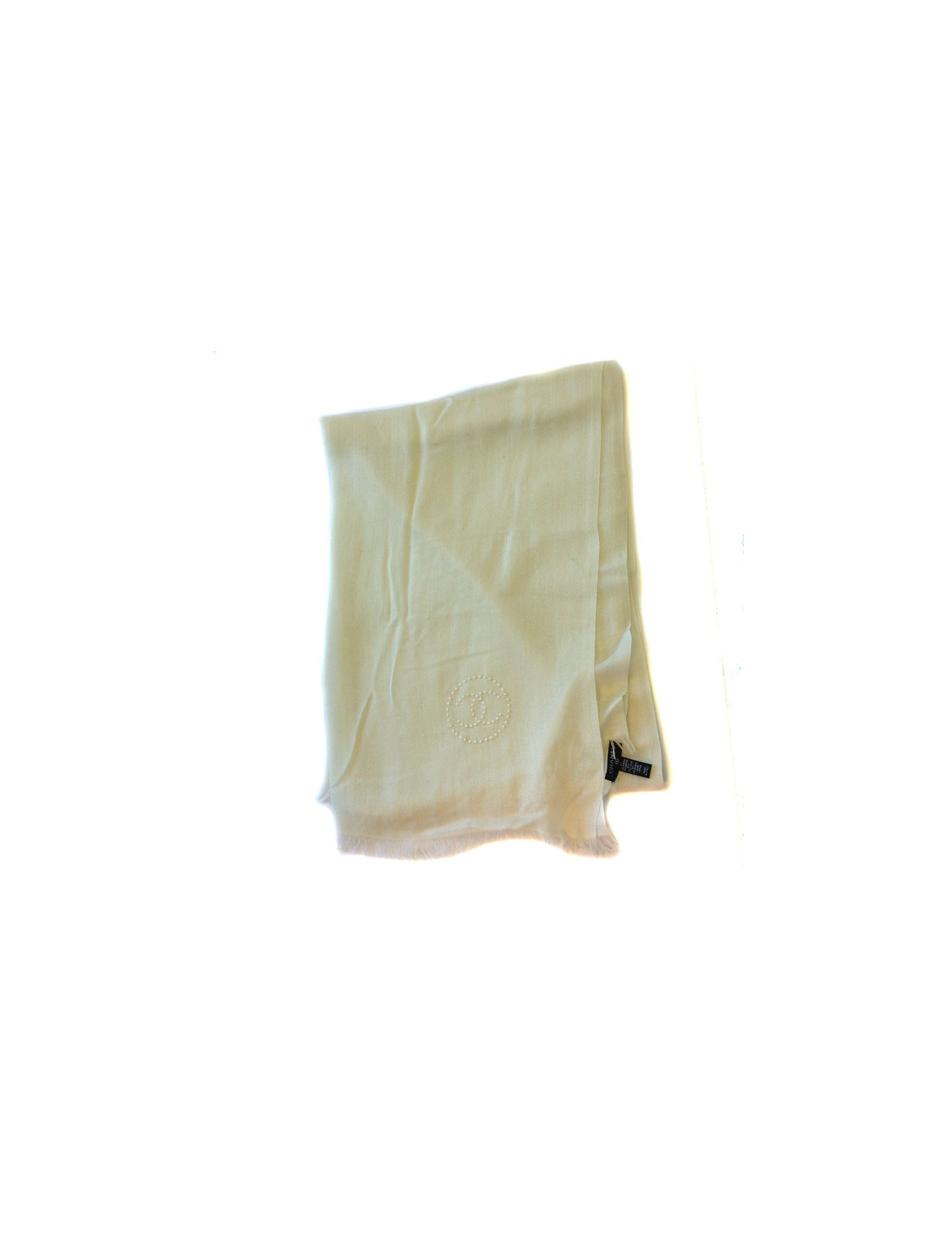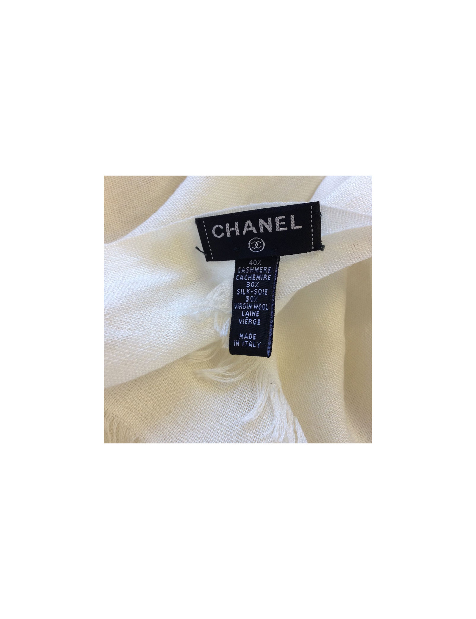 Etole CHANEL écrue à bords frangés, 40% cachemire, soie et laine vierge. CC en surpiqûres nacrées sur un bord de l'étole. Etiquette de matière présente. Très bon état. Petites tirettes.