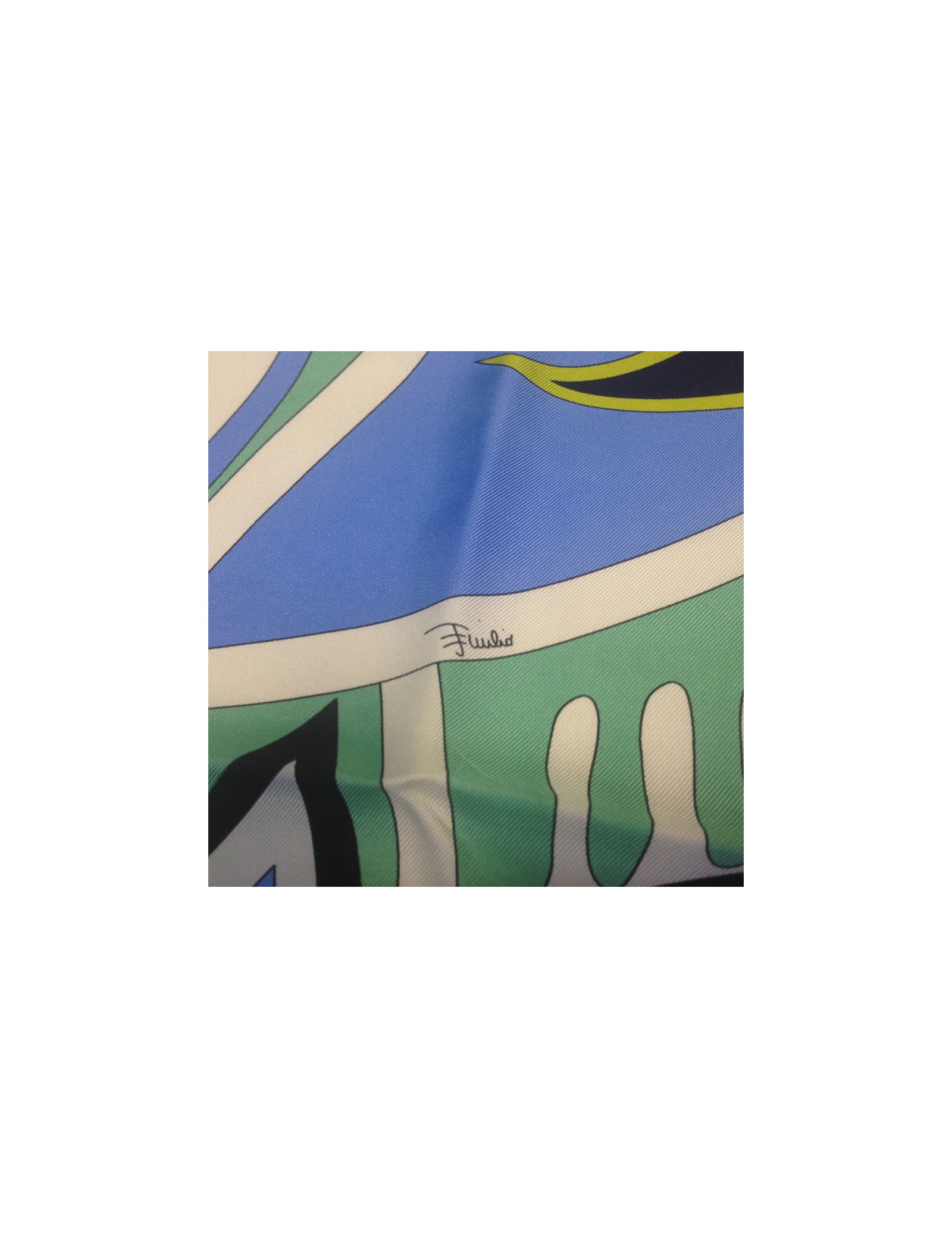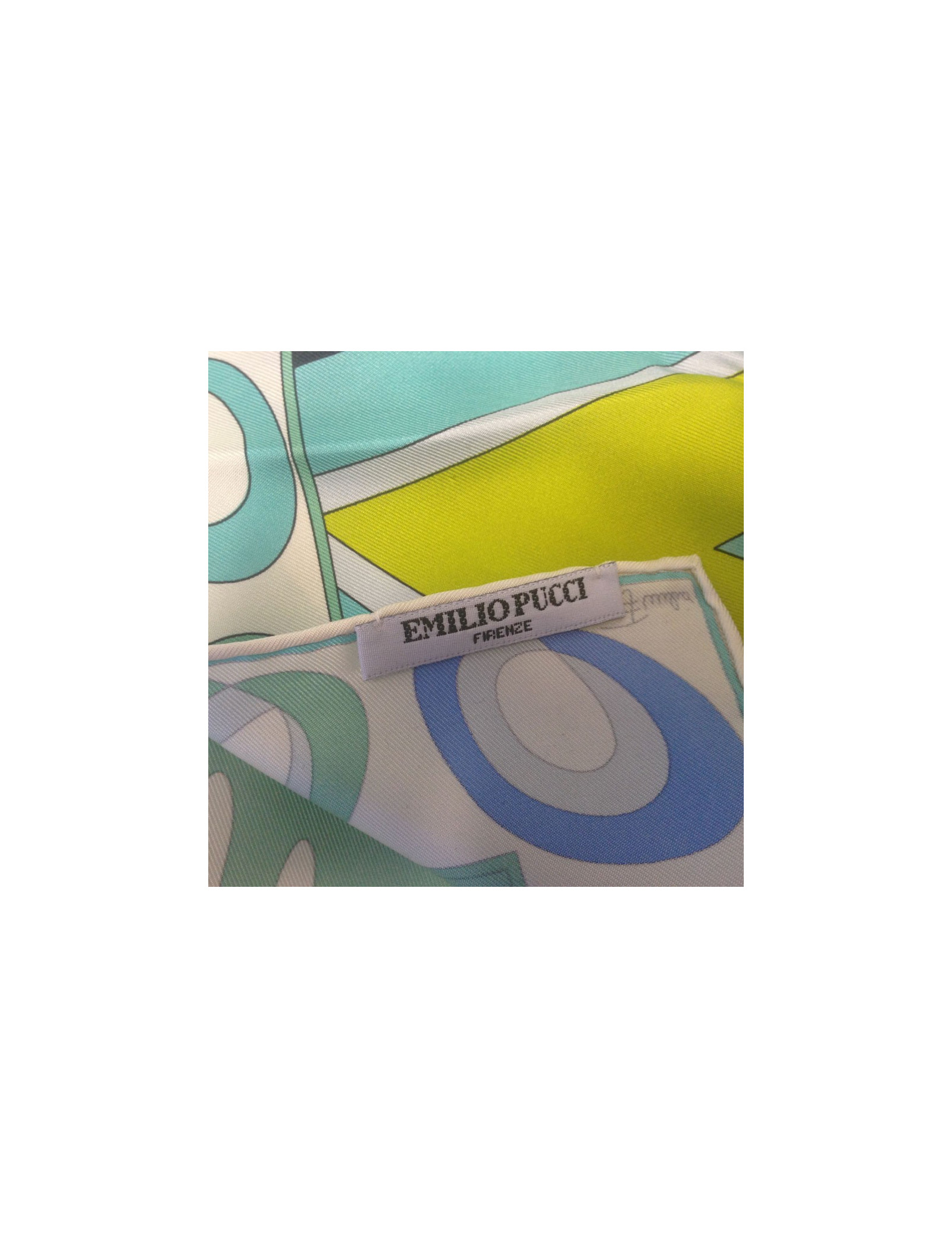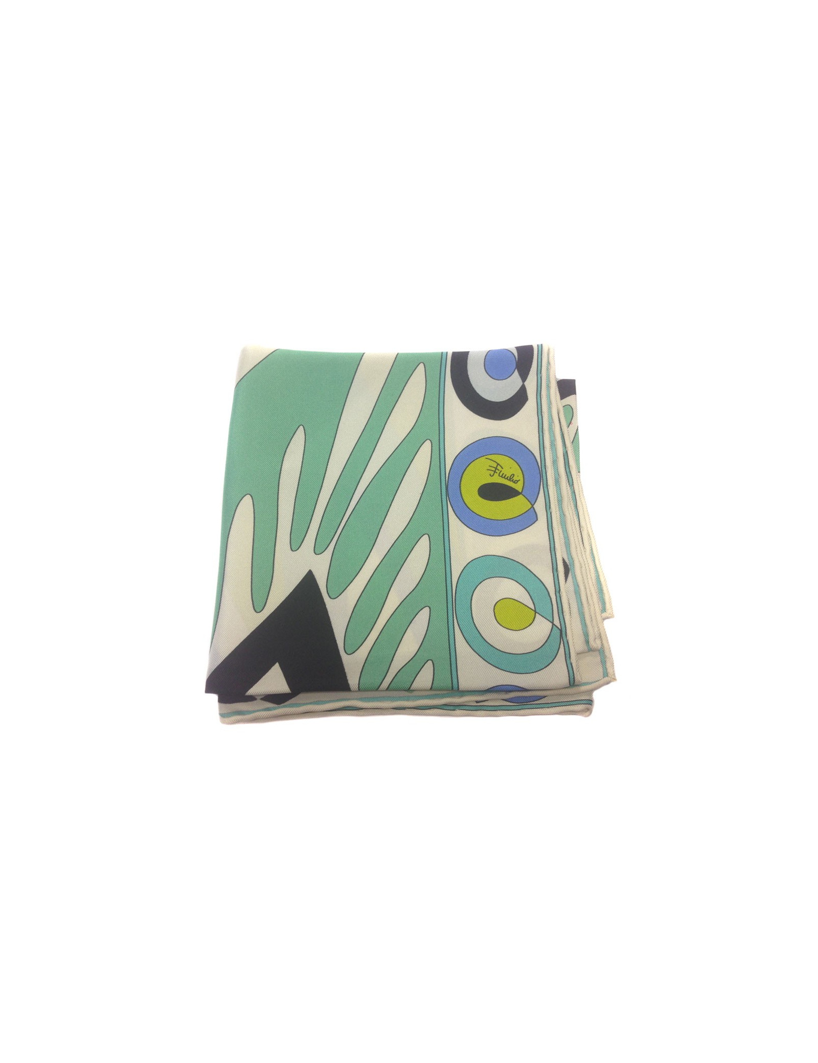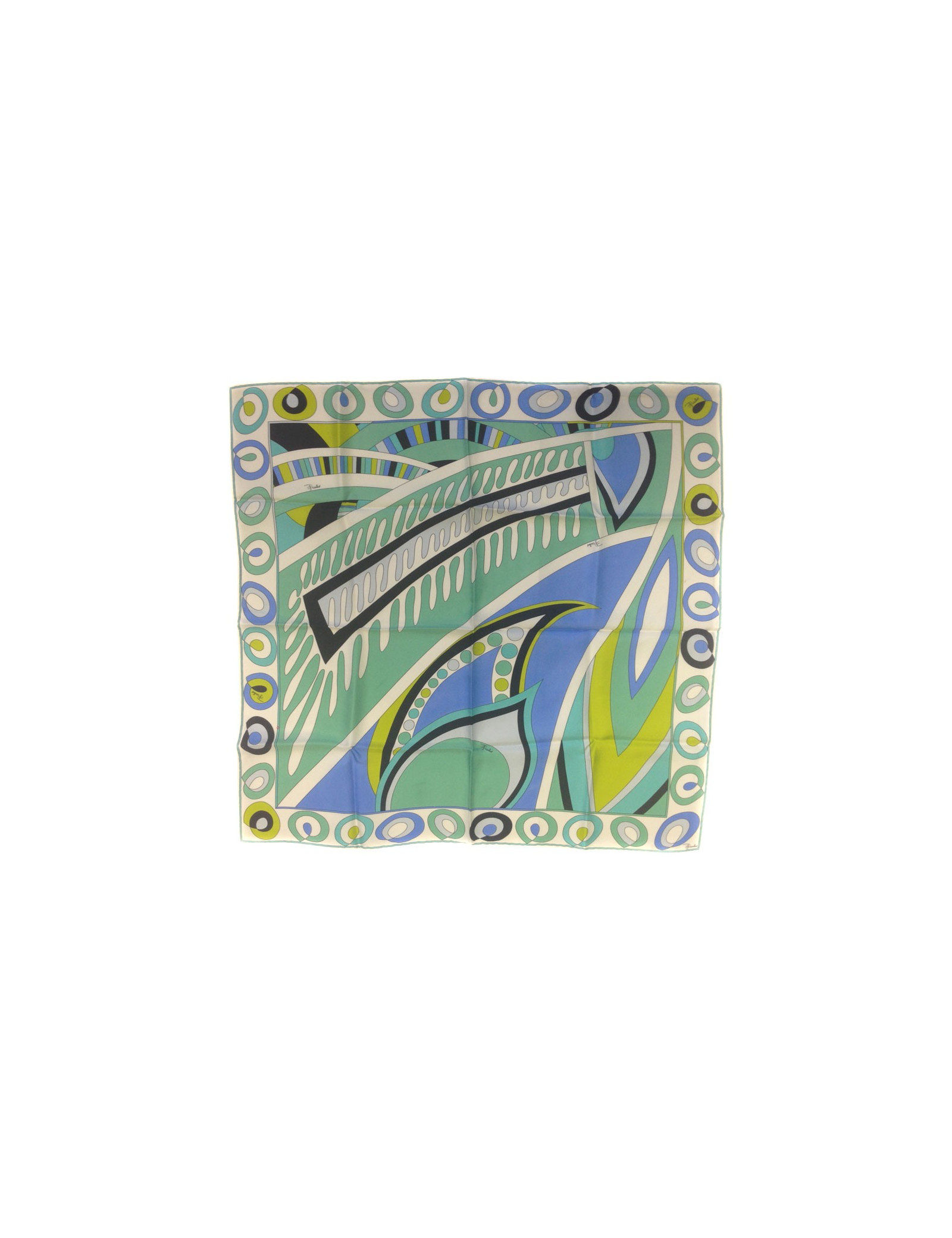 Carré de soie Emilio Pucci, motif emblématique de la marque dans les tons bleus, verts. Le roulotté est en très bon état. Carré vintage. Etiquette marque présente.