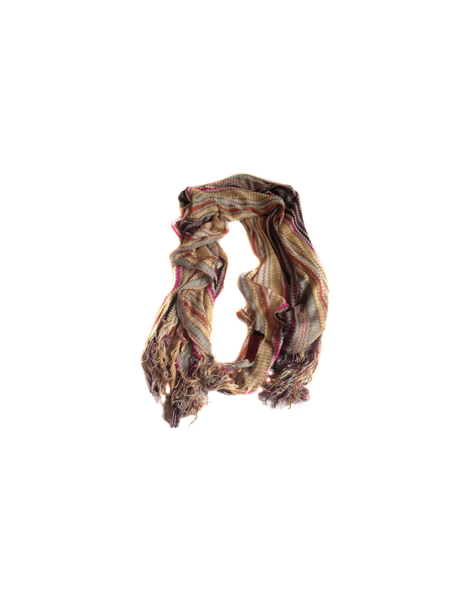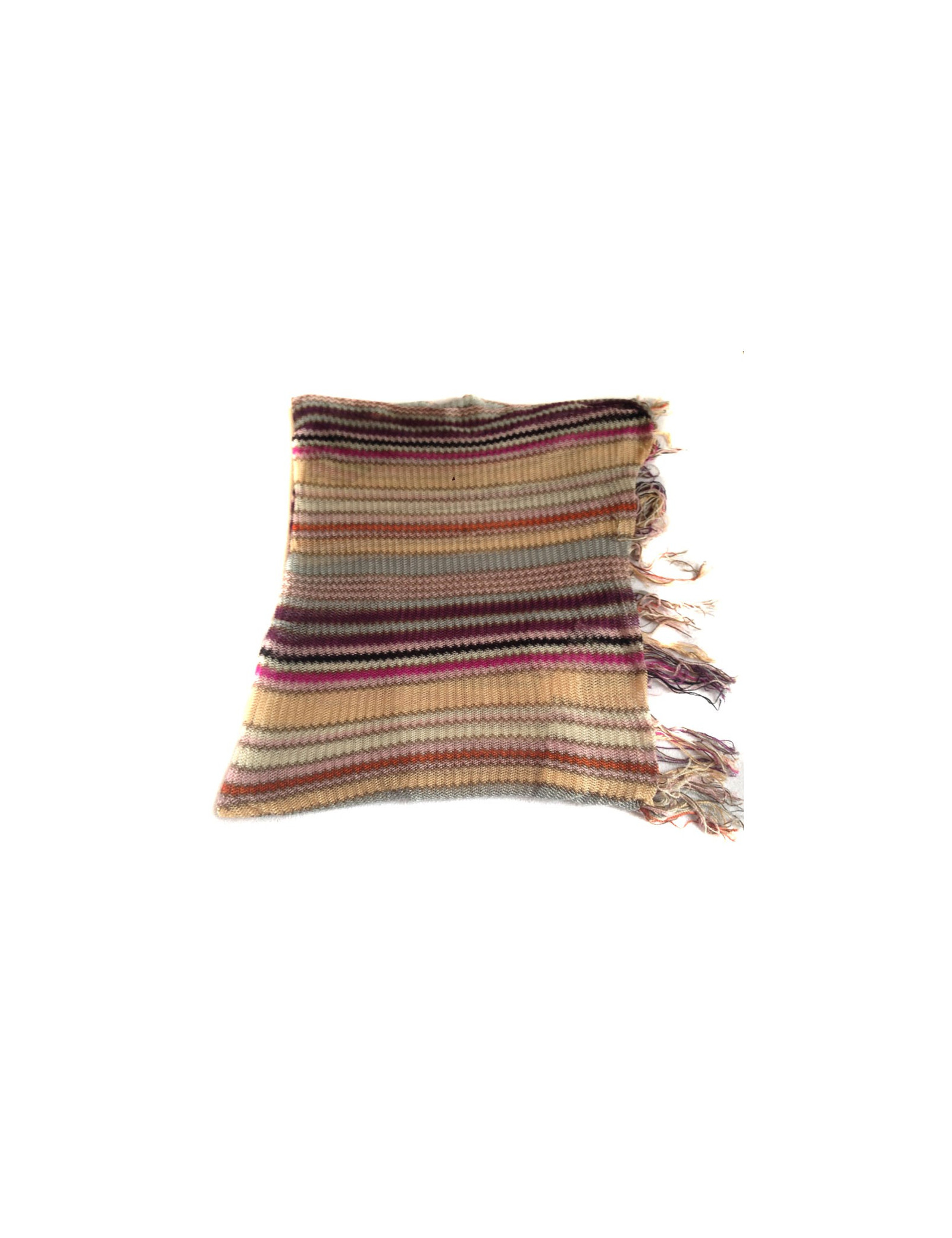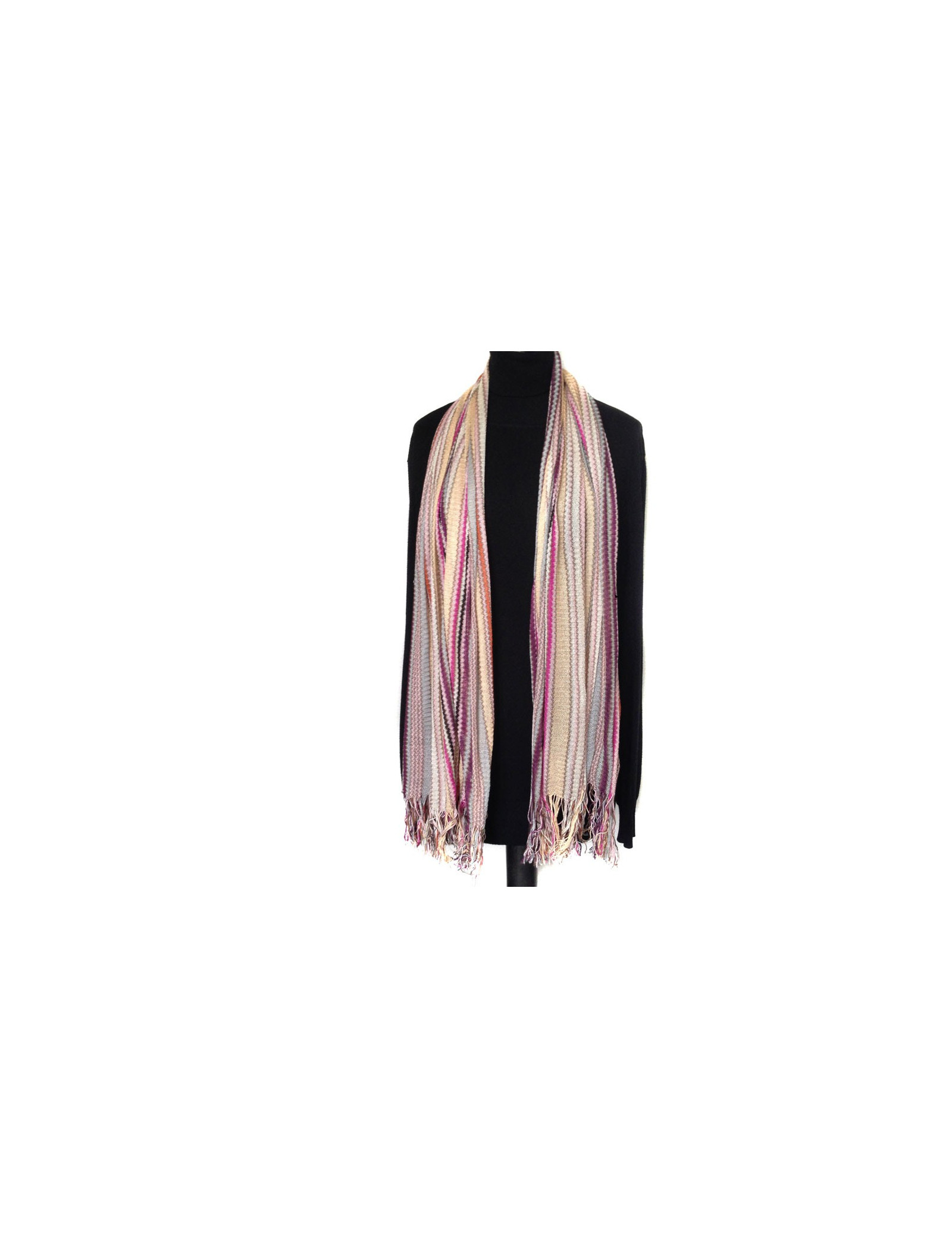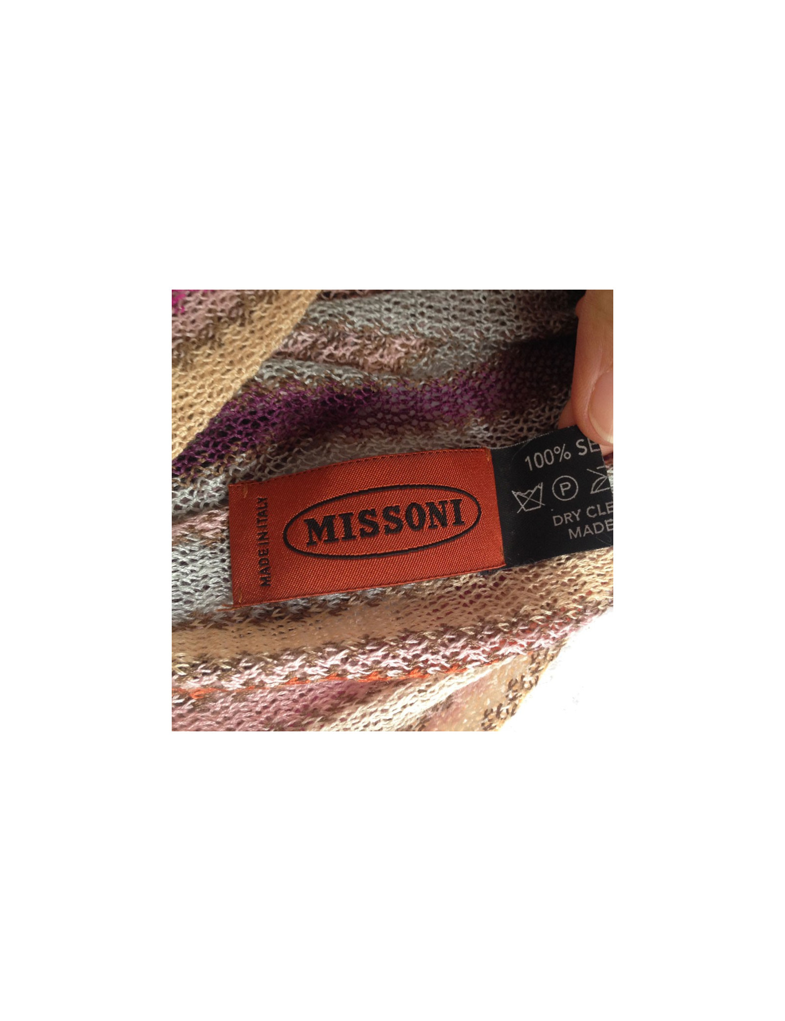 Longue écharpe Missoni en soie, aux jolies couleurs pastels, rose, beige, bleu, orange... l'écharpe est bordée de franges. Elle est très agréable à porter en toutes saisons