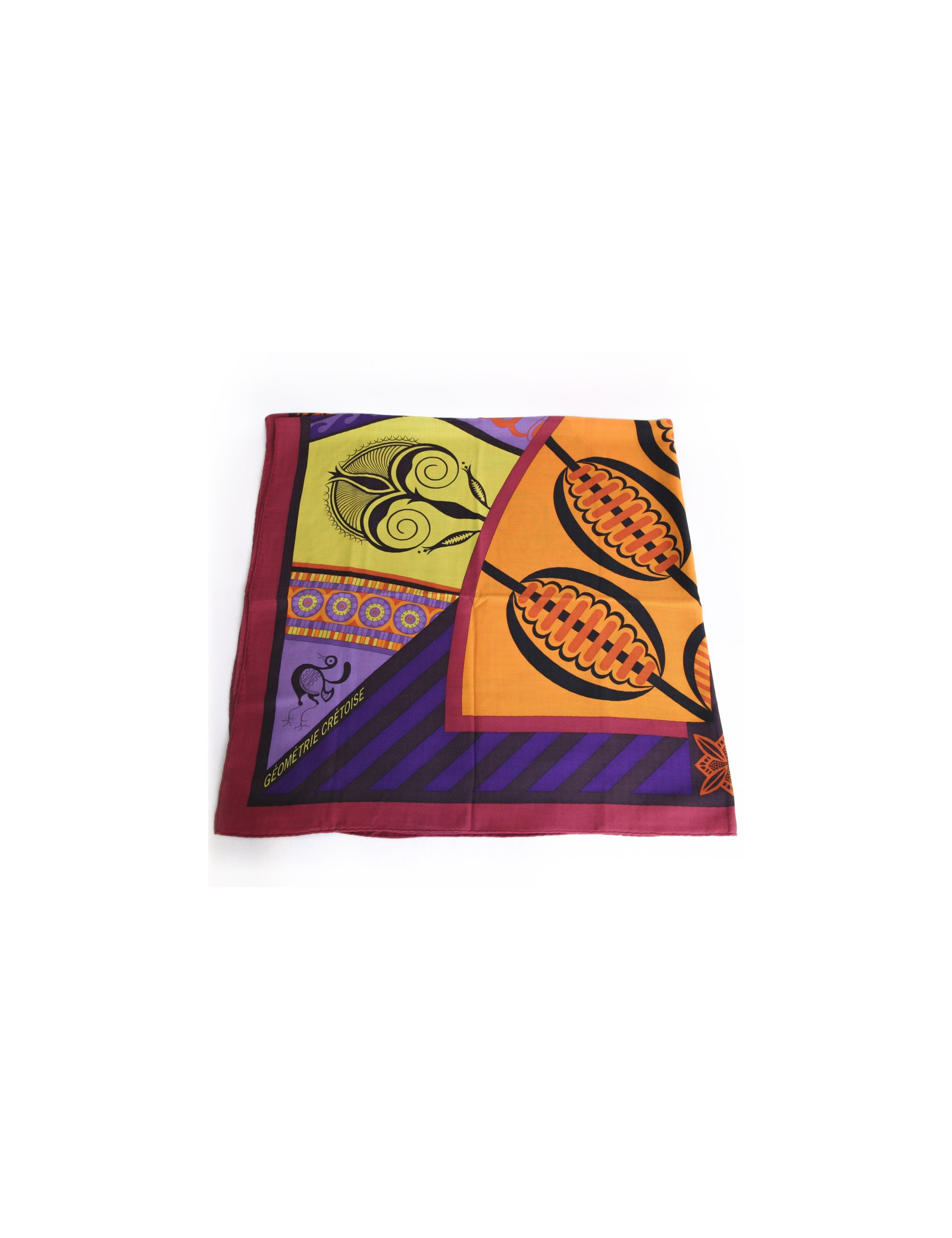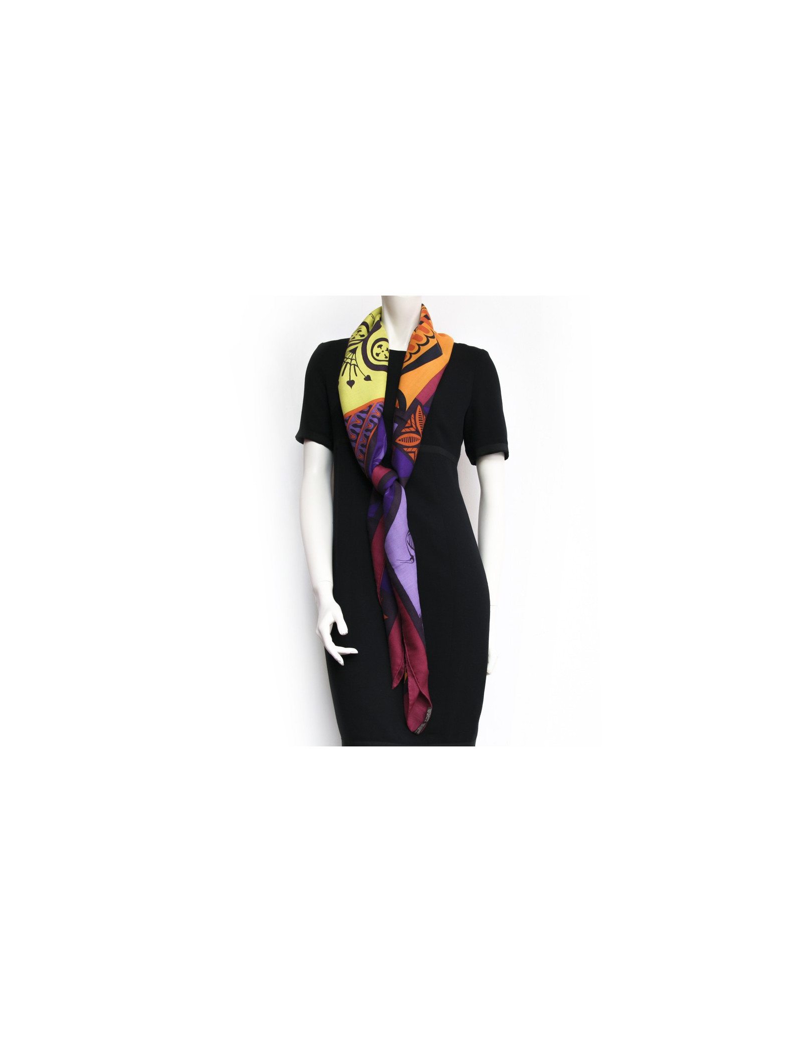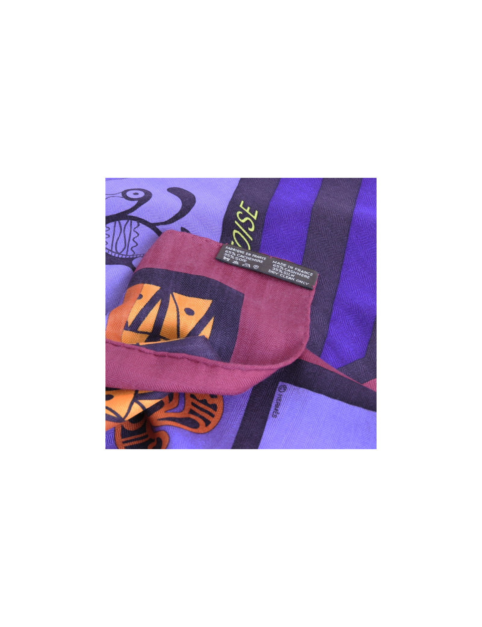 Sublime grand châle de la Maison Hermès signé J.Abadie, en cachemire et soie aux motifs "Géométriques Crétoises". De magnifiques couleurs illuminent le foulard, dégradé de violet, dégradé d'orange, bordeaux et vert anis.