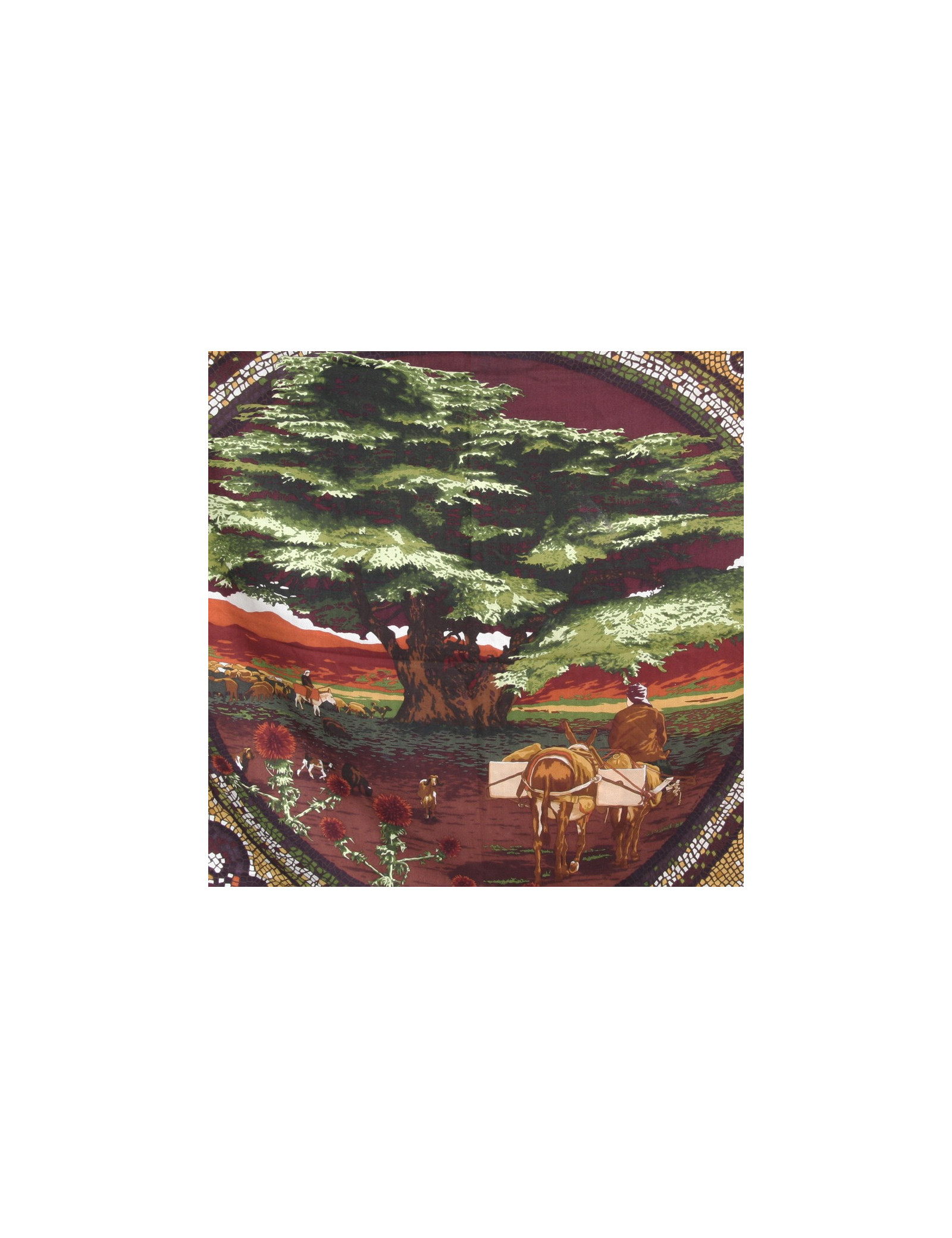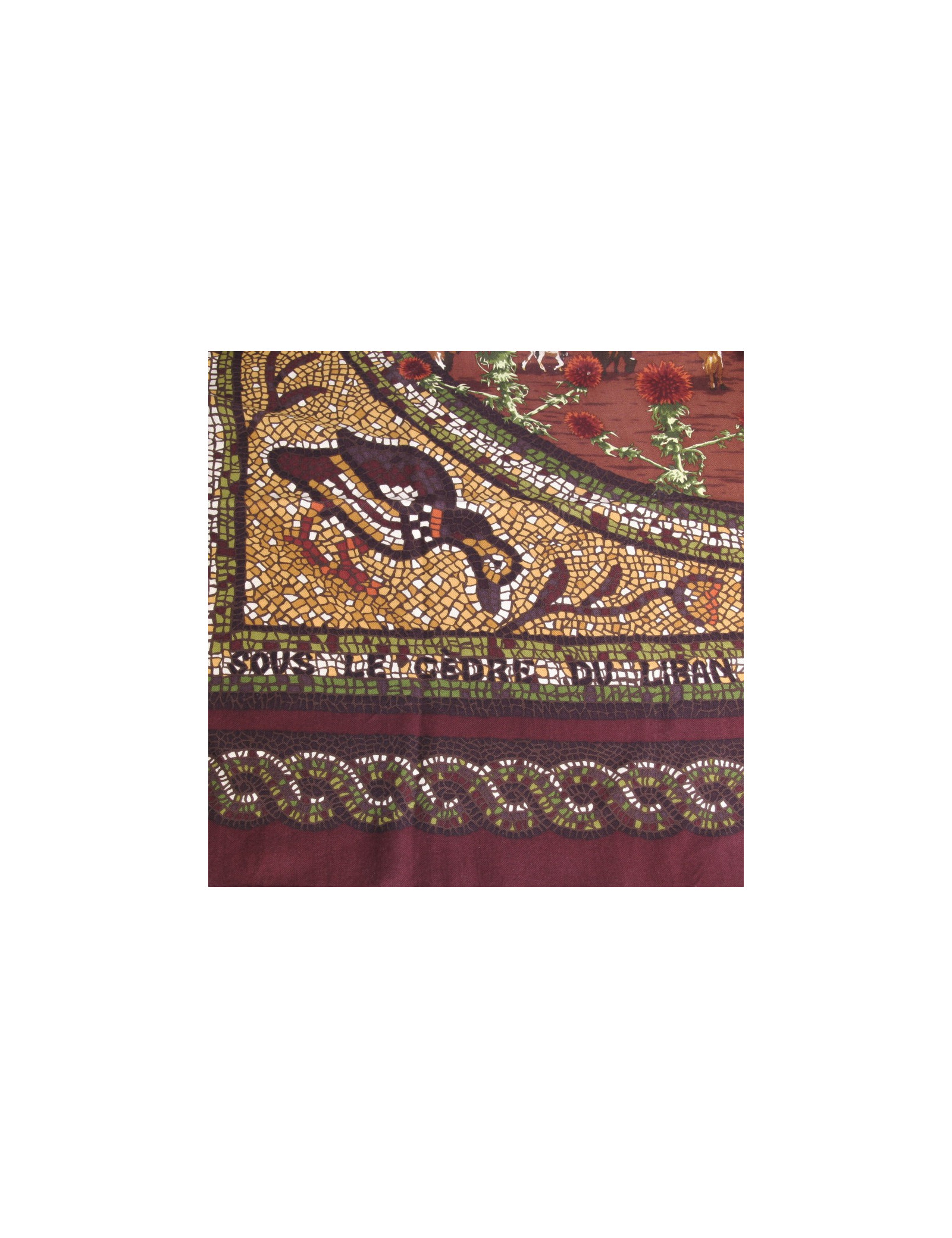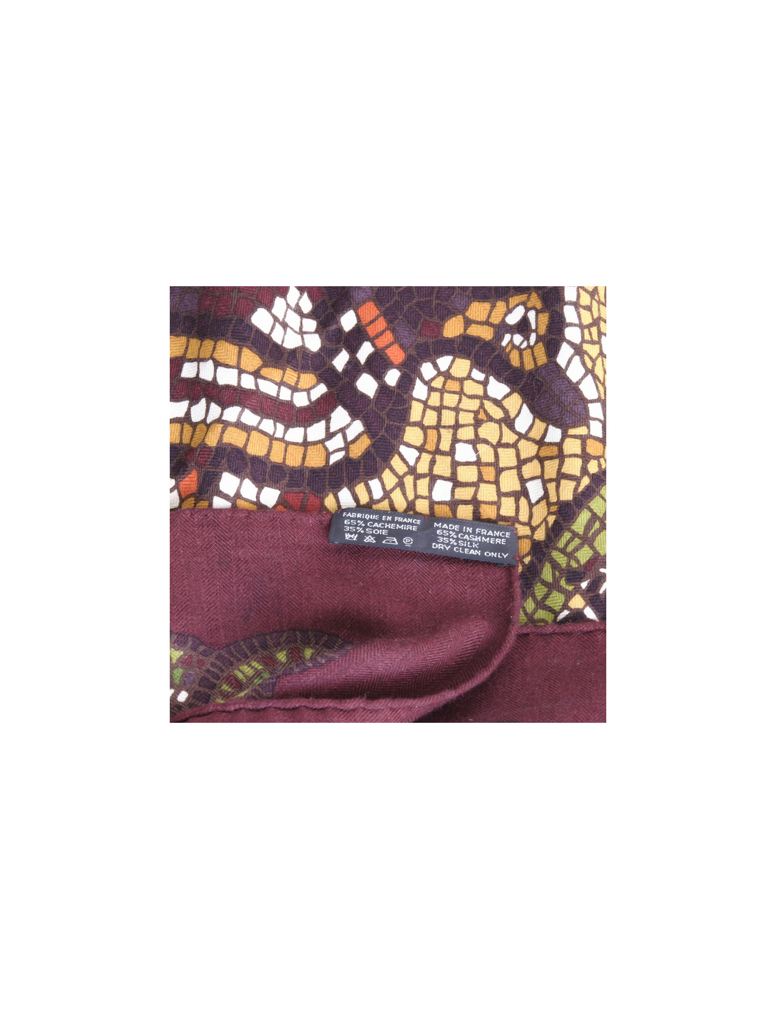 Grand châle de la maison Hermès en cachemire et soie "Sous le cèdre du Liban", motifs mosaïques avec de somptueuses couleurs chaudes, vert, marron, bordeaux, jaune vif. Made in France. En très bon état.