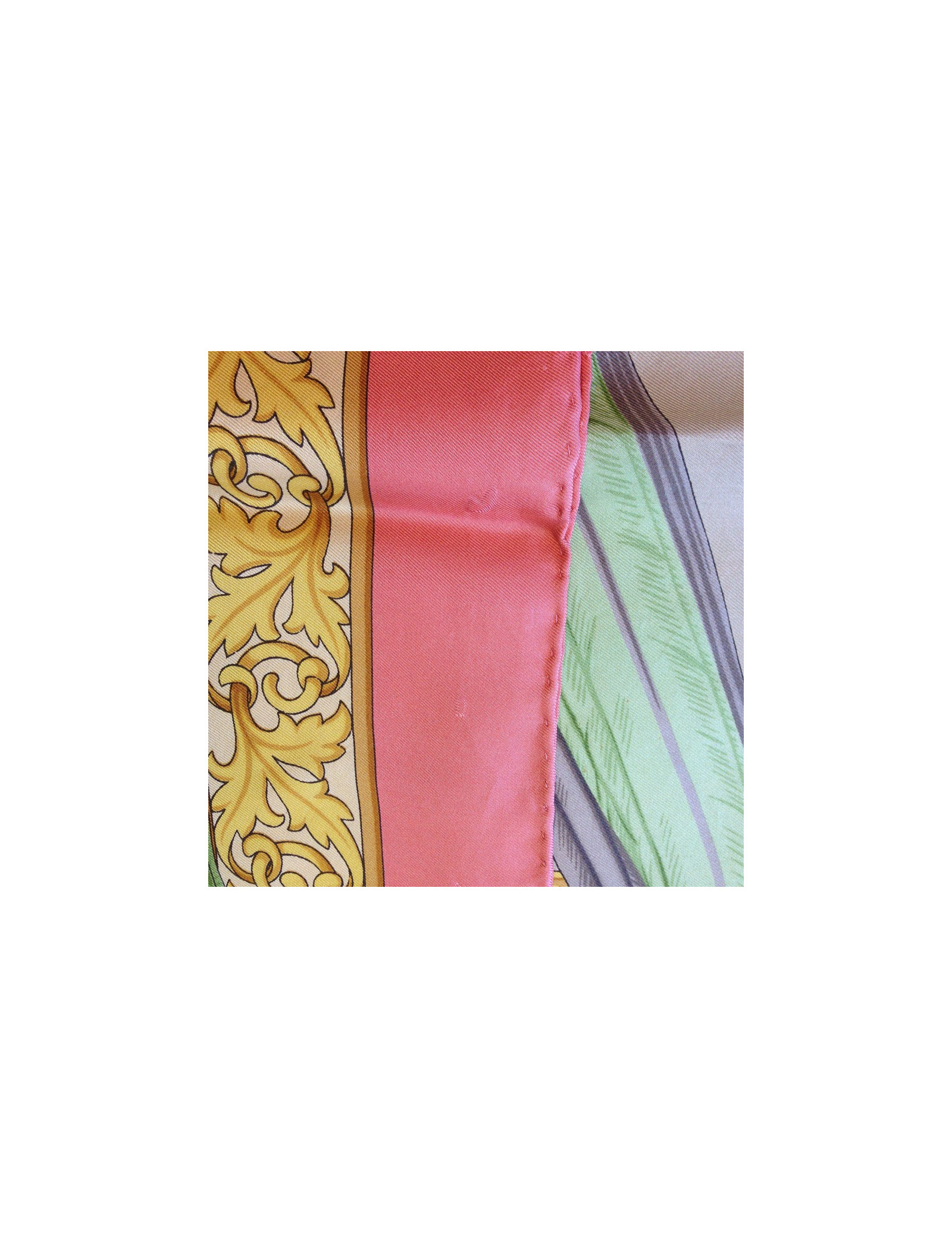 Magnifique carré de soie Salvatore FERRAGAMO vintage. Motifs: perroquets multicolores. La bordure est un vieux rose, fond beige et or pâle. Perroquets à dominante de rose et or. Le roulotté est en très bon état, petits trous de tête d'épingle sur le fond or pâle et sur l'aigle rose, soie légèrement abîmée sur la bordure vieux rose. Le carré a été nettoyé chez un teinturier de luxe.
