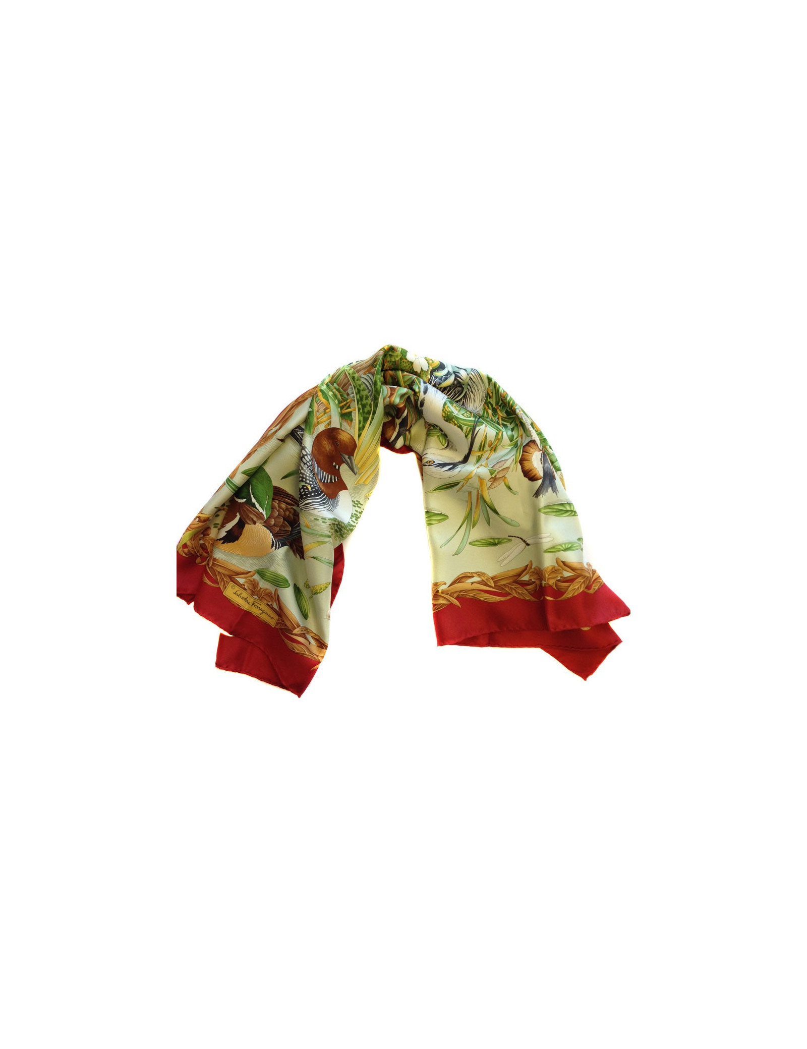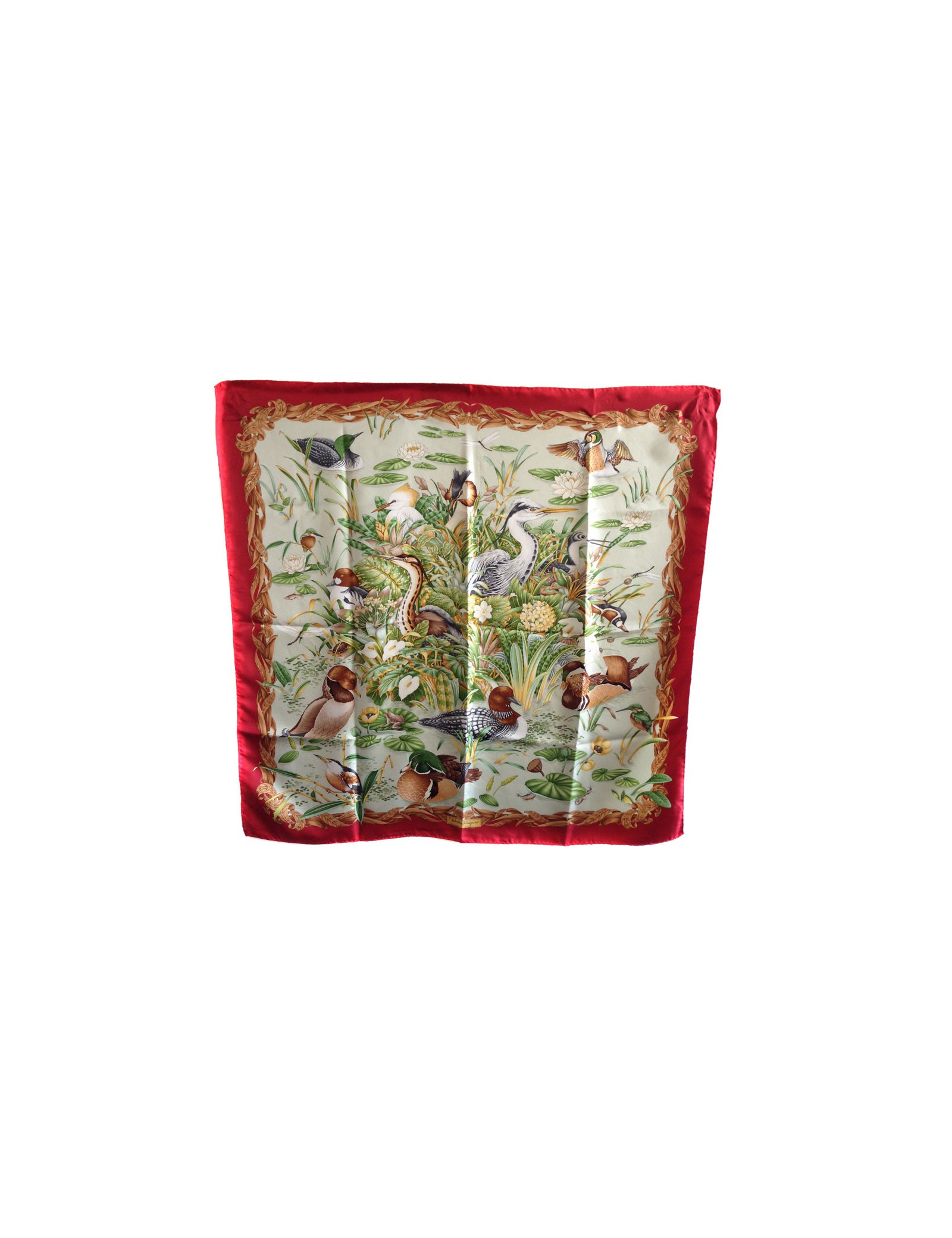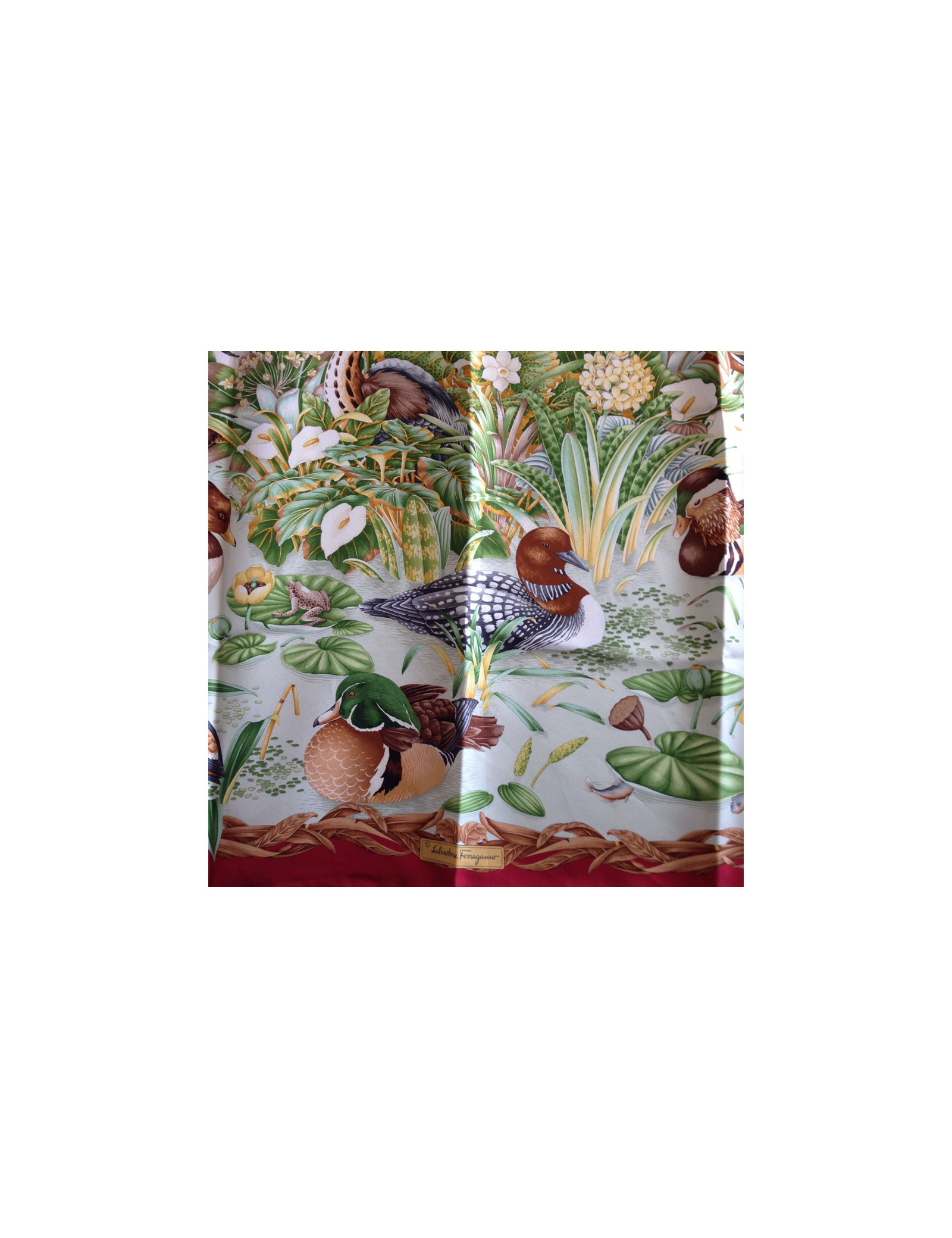 Superbe carré de soie SALVATORE FERRAGAMO bordure rouge et or, fond vert d'eau Motif: mare aux canards (canards, hérons, oiseaux au bord de l'eau). Légères tâches sur le fond en haut du foulard (voir photos). Le roulotté est impeccable. Très bon état général. Le carré a été nettoyé chez un teinturier de luxe.