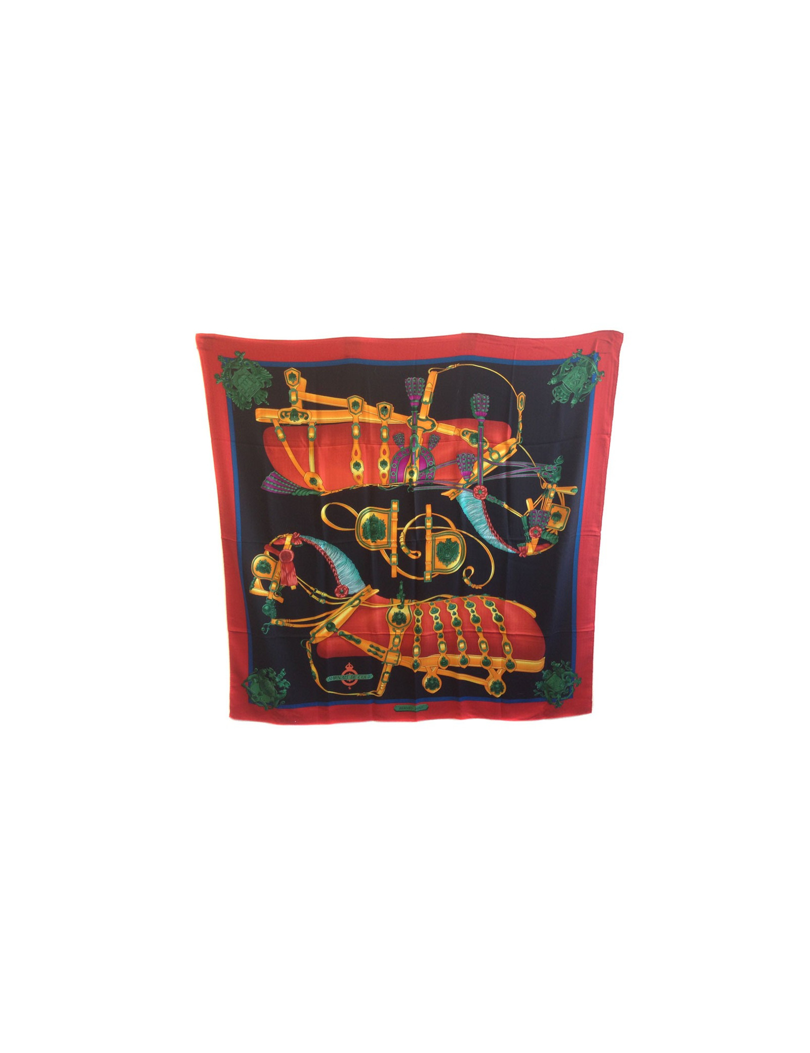 Châle HERMES "Harnais de cour" en cachemire et soie rouge, noir, vert