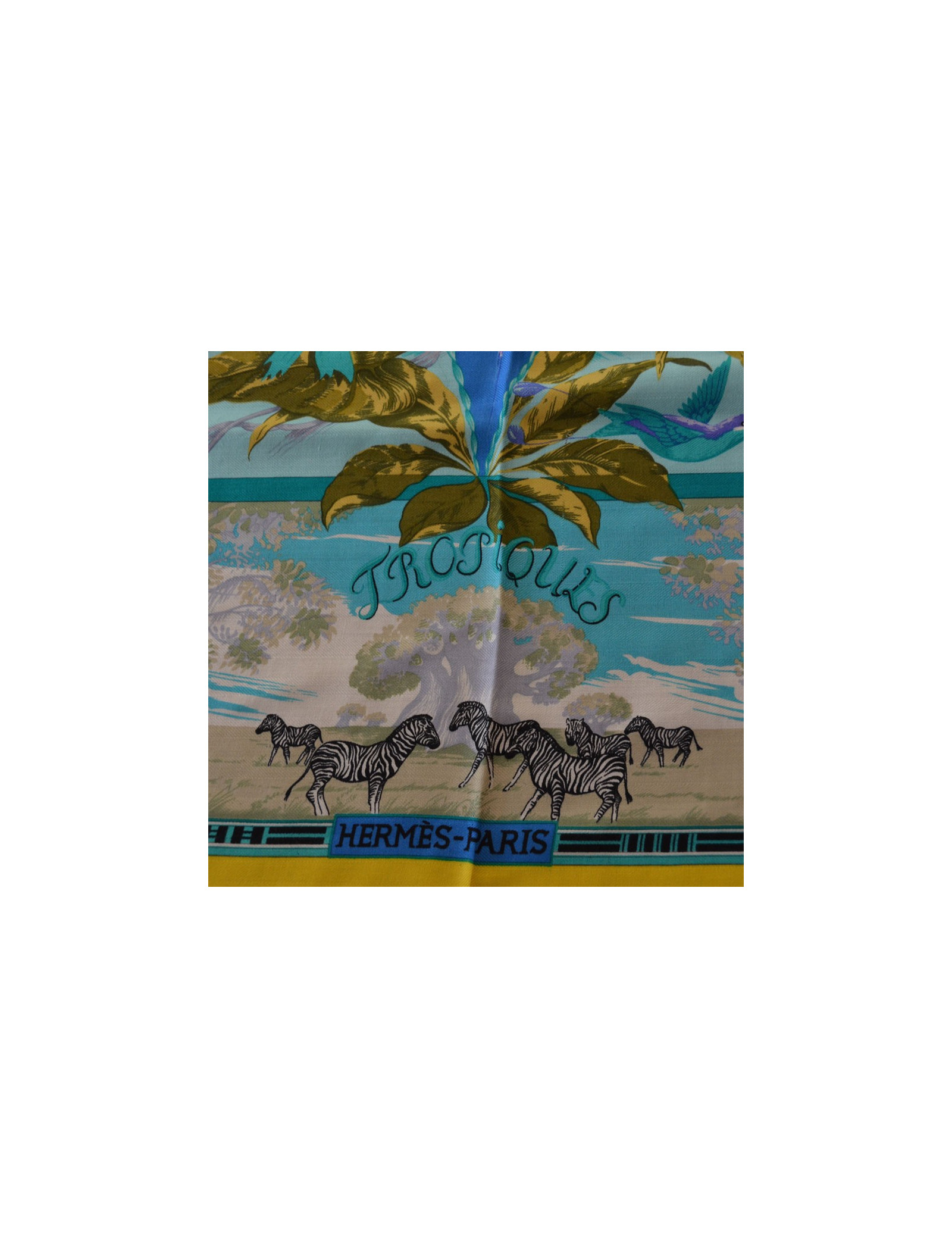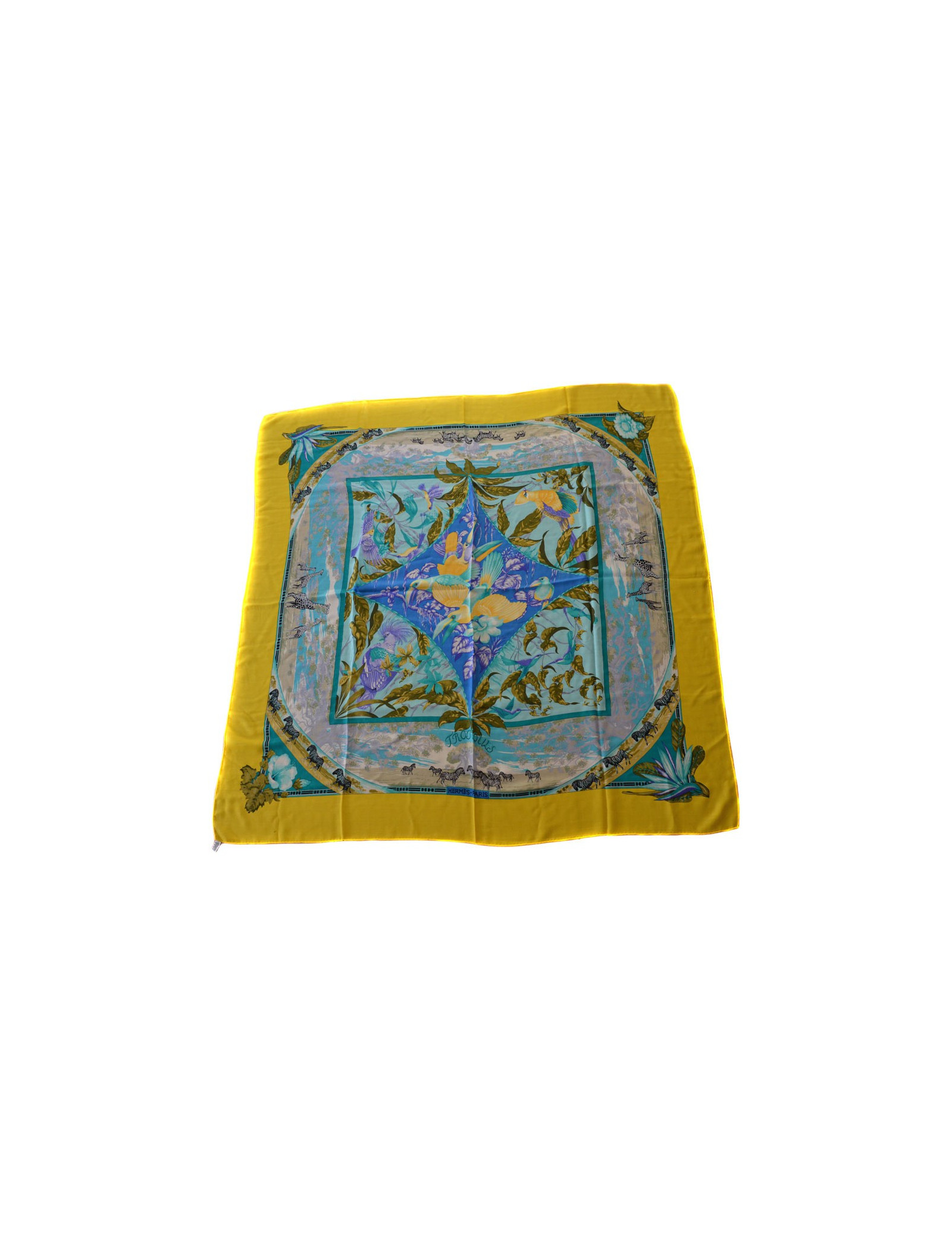 Châle HERMES "Tropiques" en cachemire et soie, coloris à dominante de jaune, bleu et vert. Le roulotté est impeccable. Des petites tirettes infimes.
