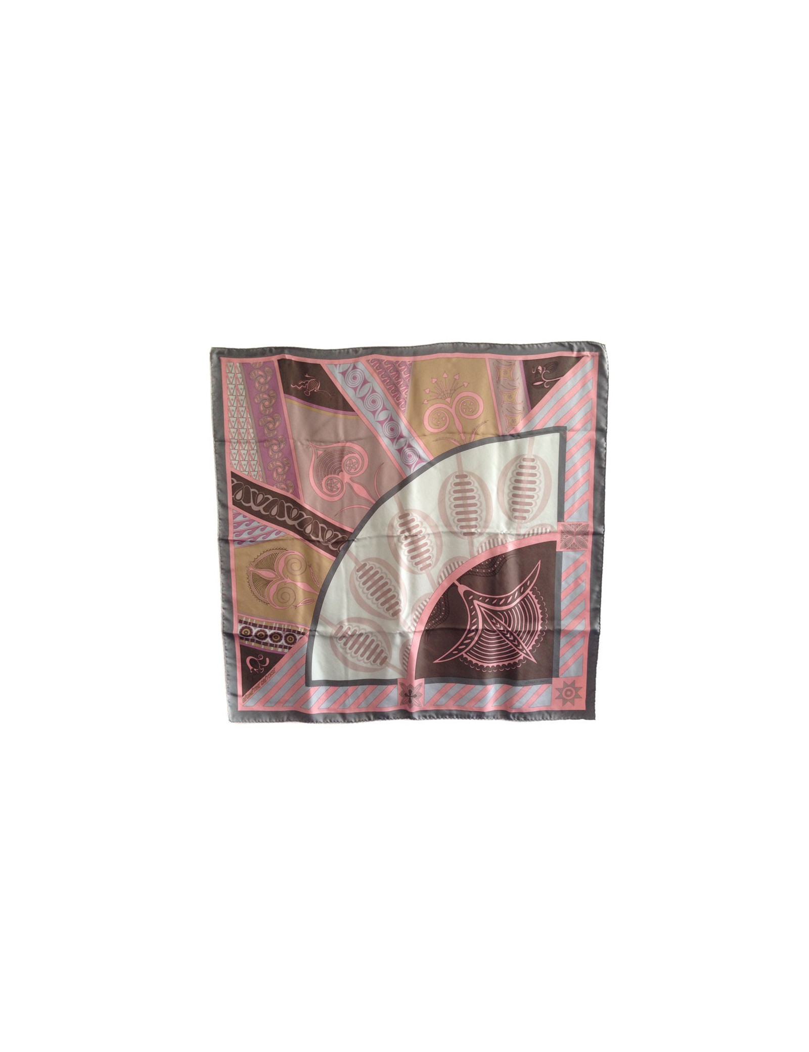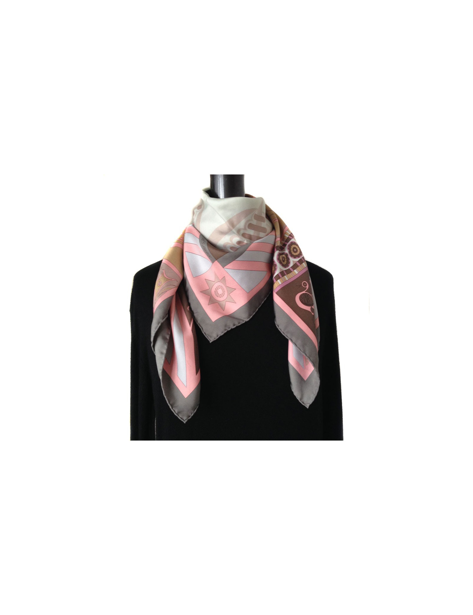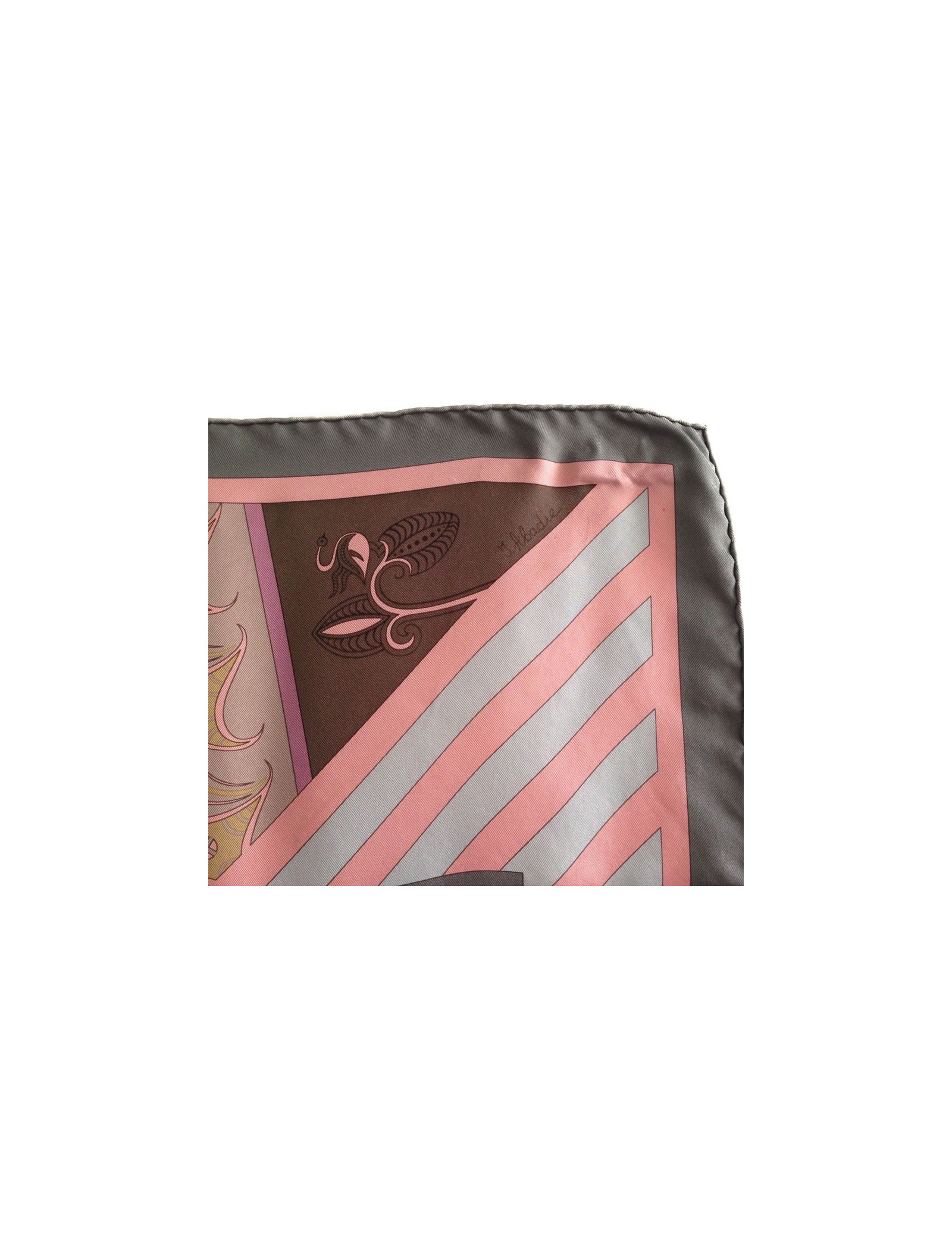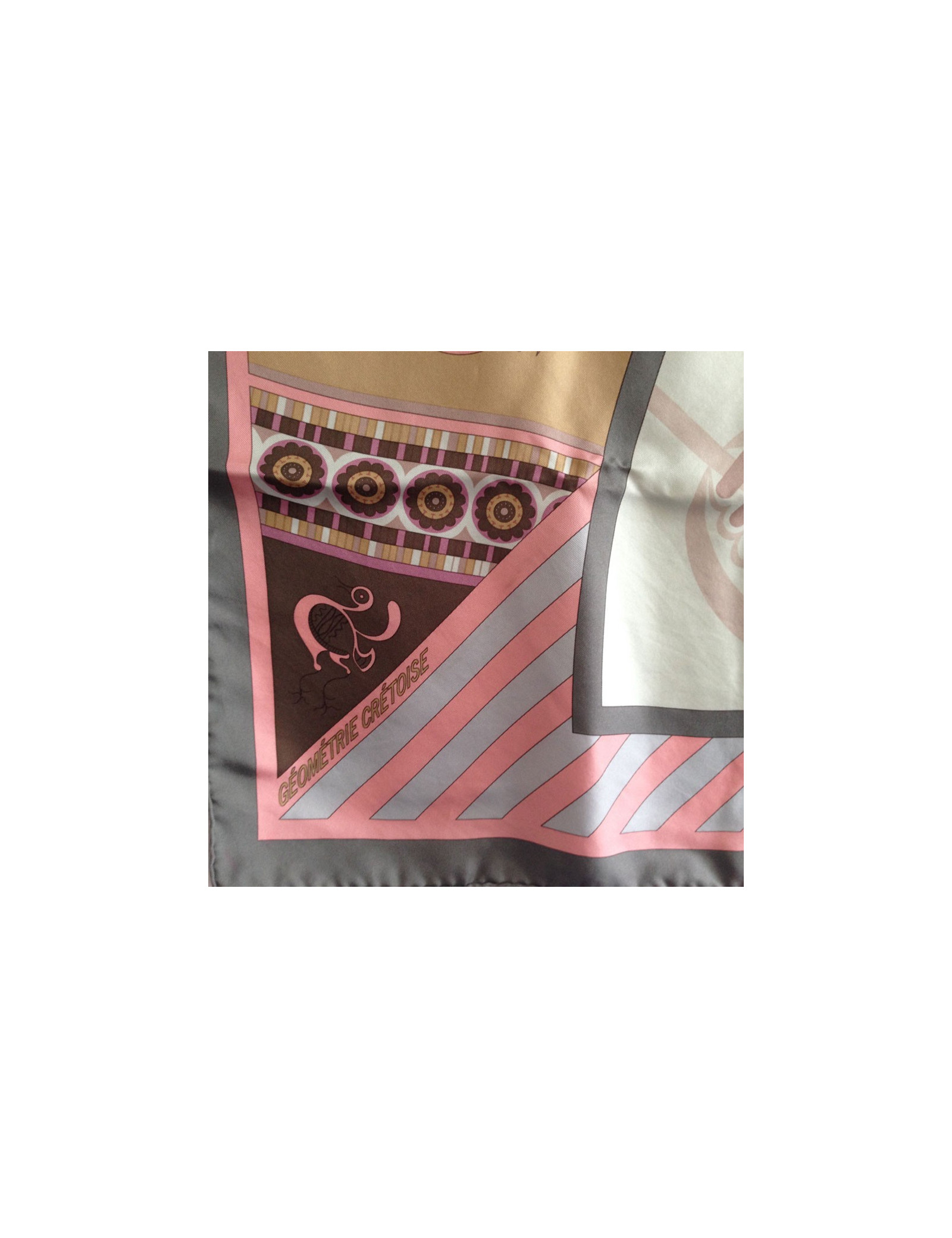 Dans les tons de pastel de rose, gris, bleu, marron. 100% Soie. Le roulotté est impeccable.