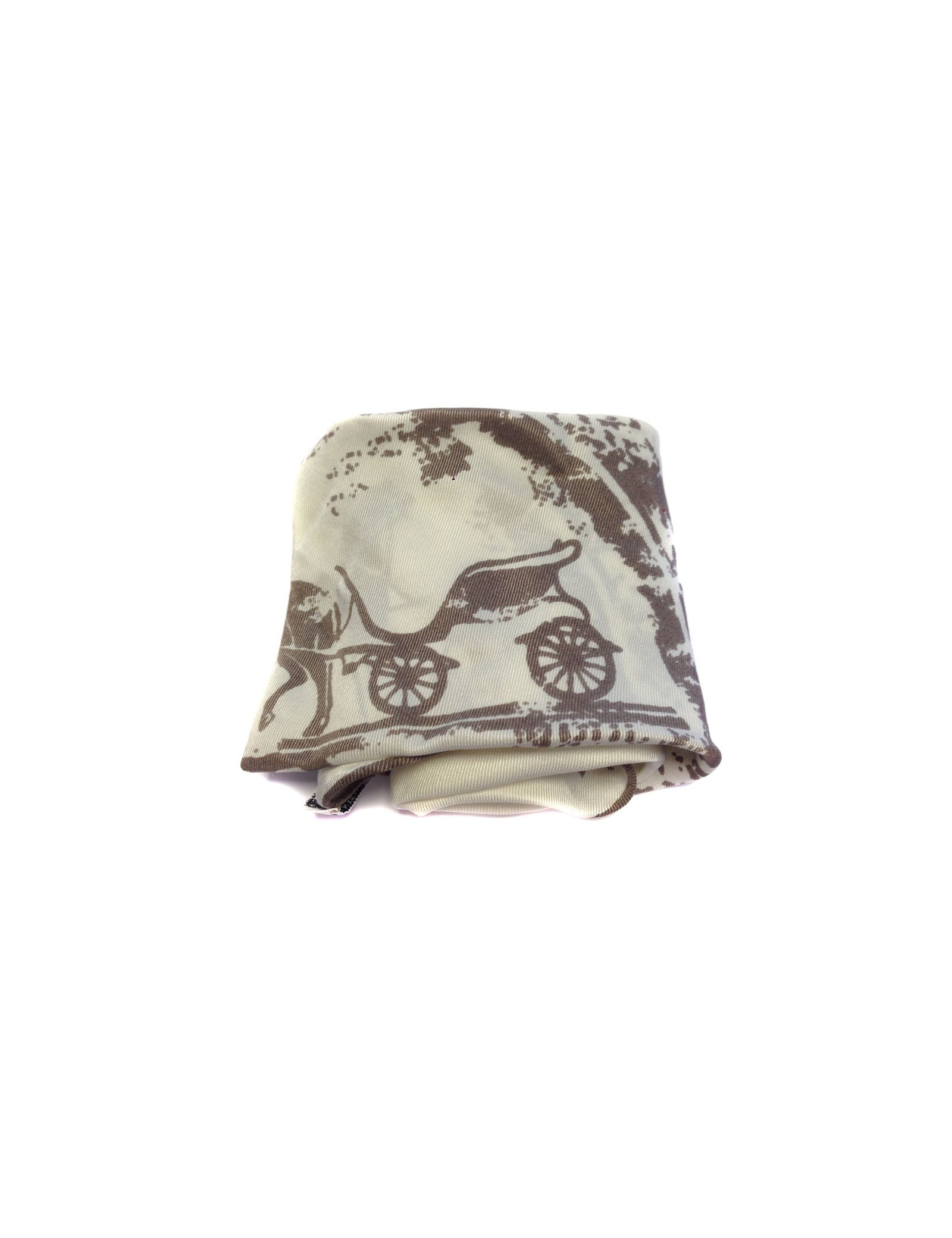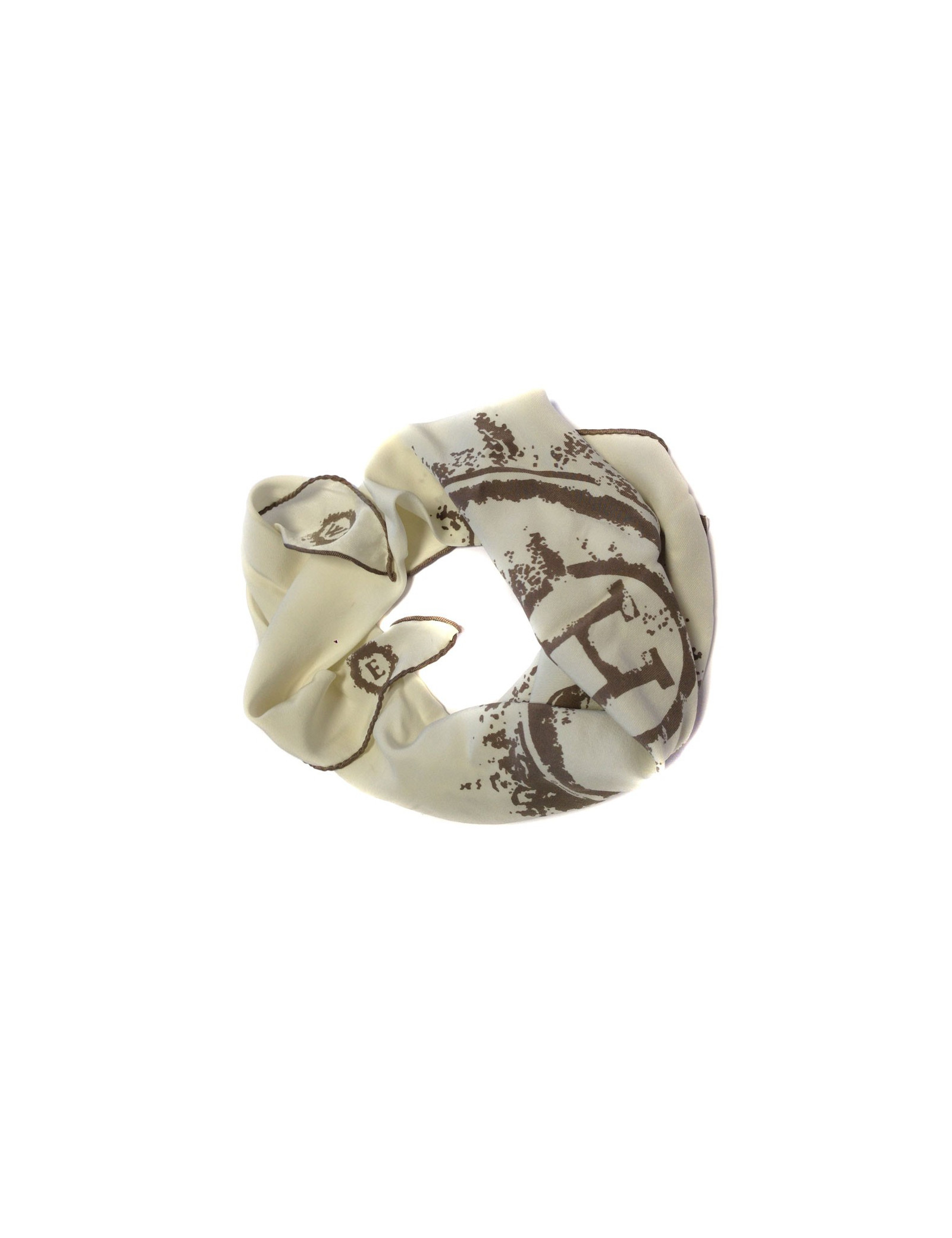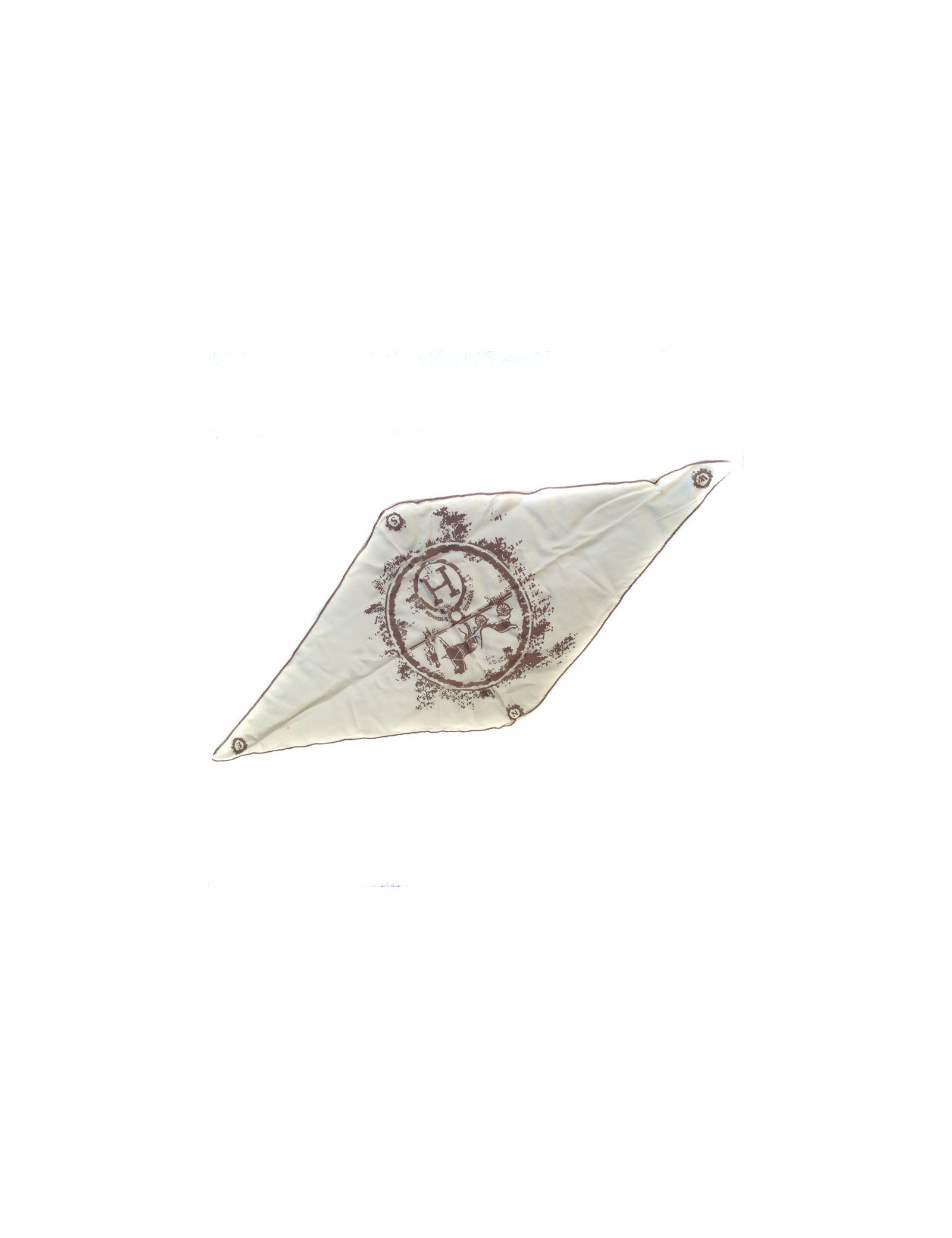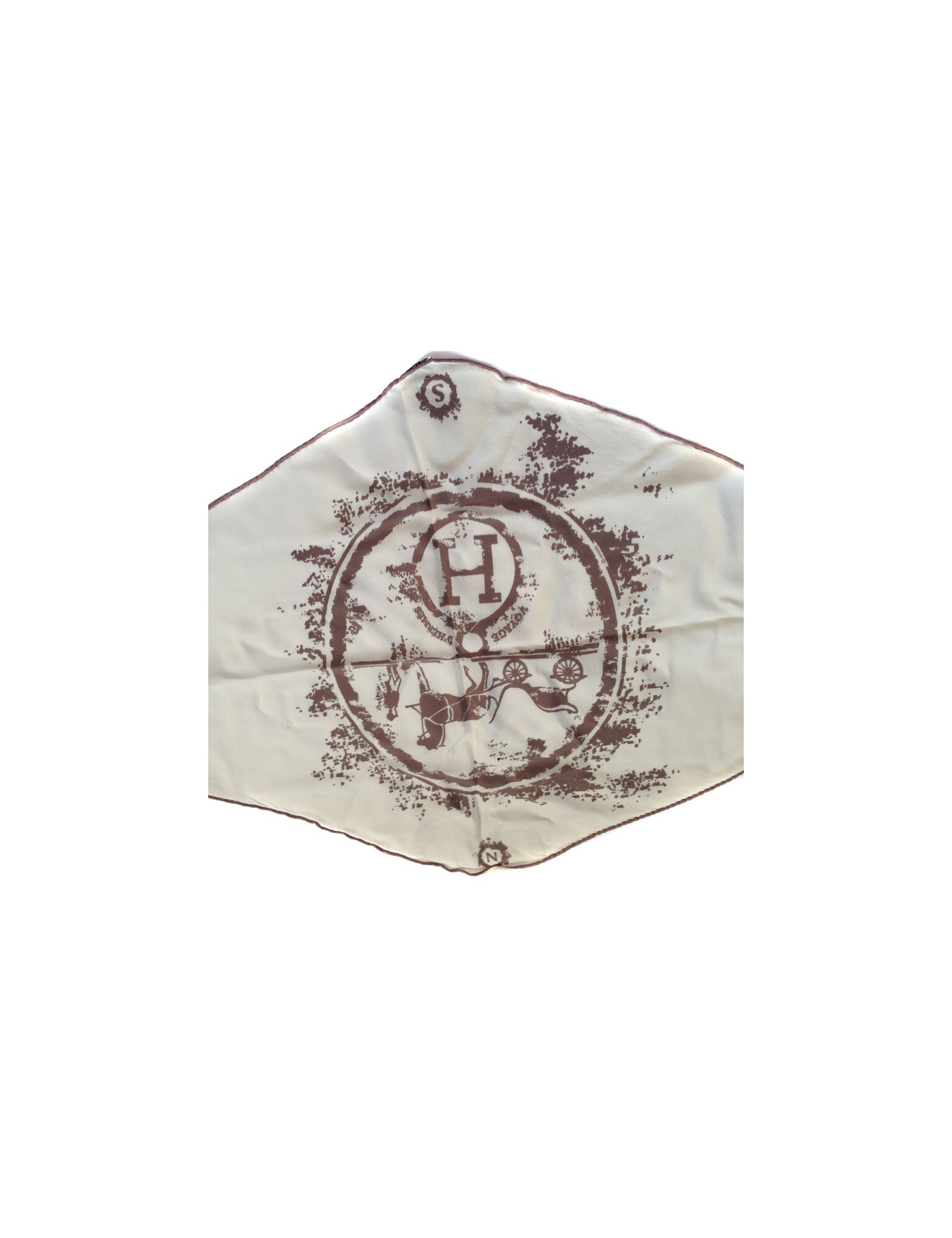 Foulard HERMES losange Ex Libris "Voyage d'Hermès", modèle moyen, en crêpe de soie blanc et taupe. Motif les points cardinaux. Nettoyé chez un teinturier de luxe. En très bon état.