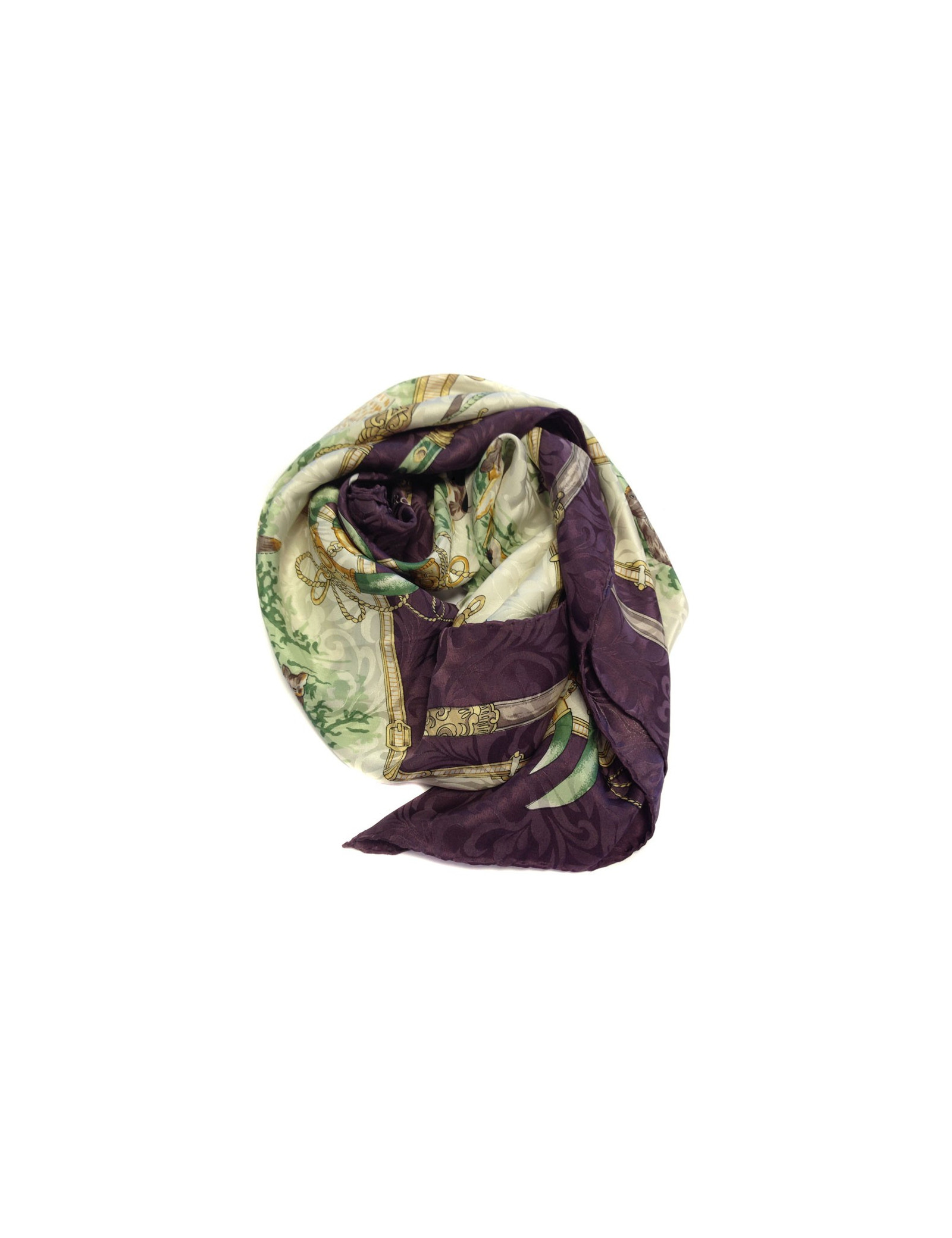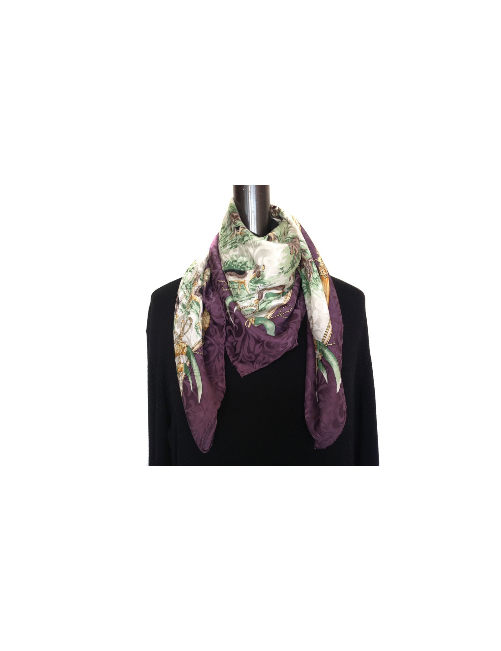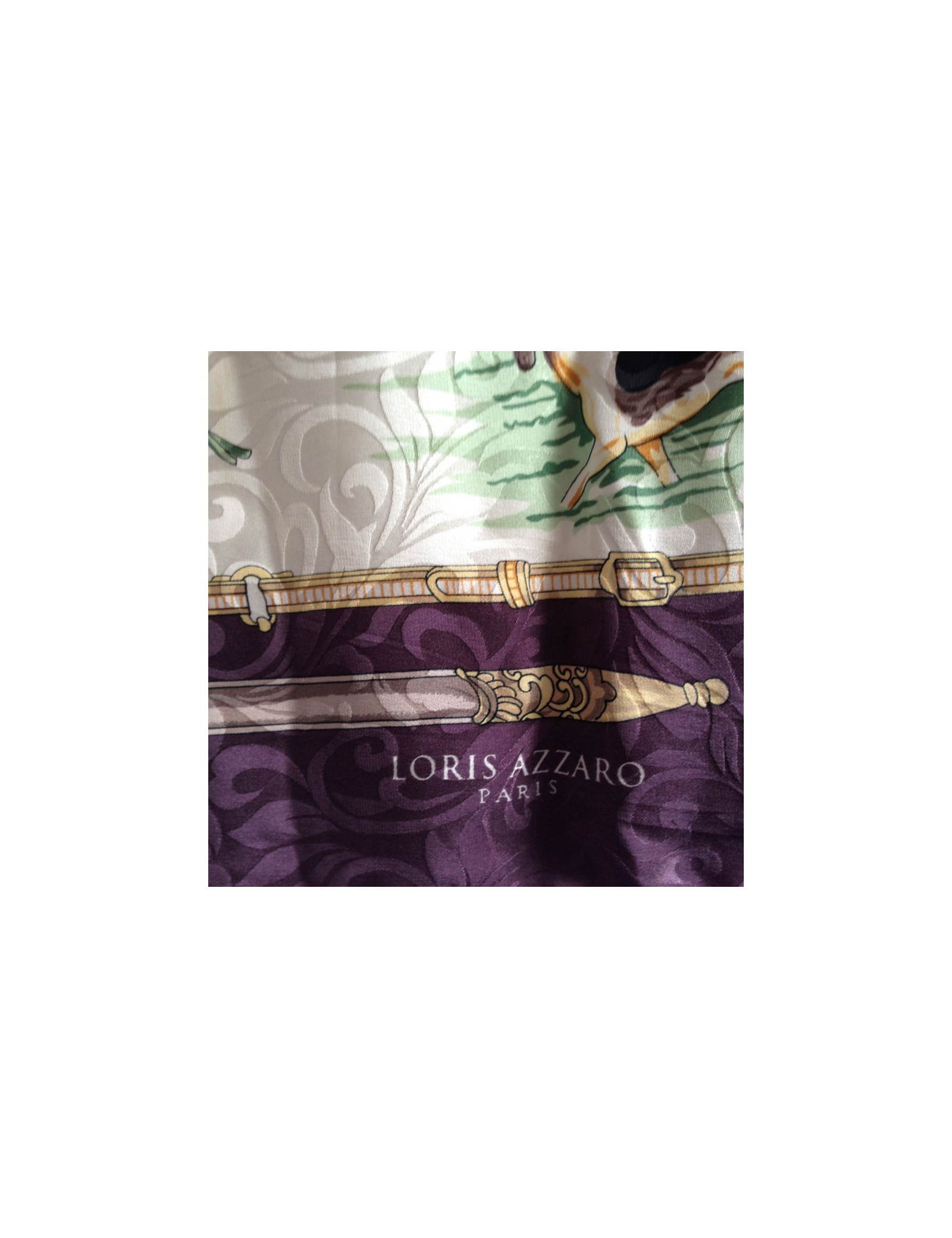 Beau foulard LORIS AZZARO en soie lourde. Bordure prune et fond ivoire.
